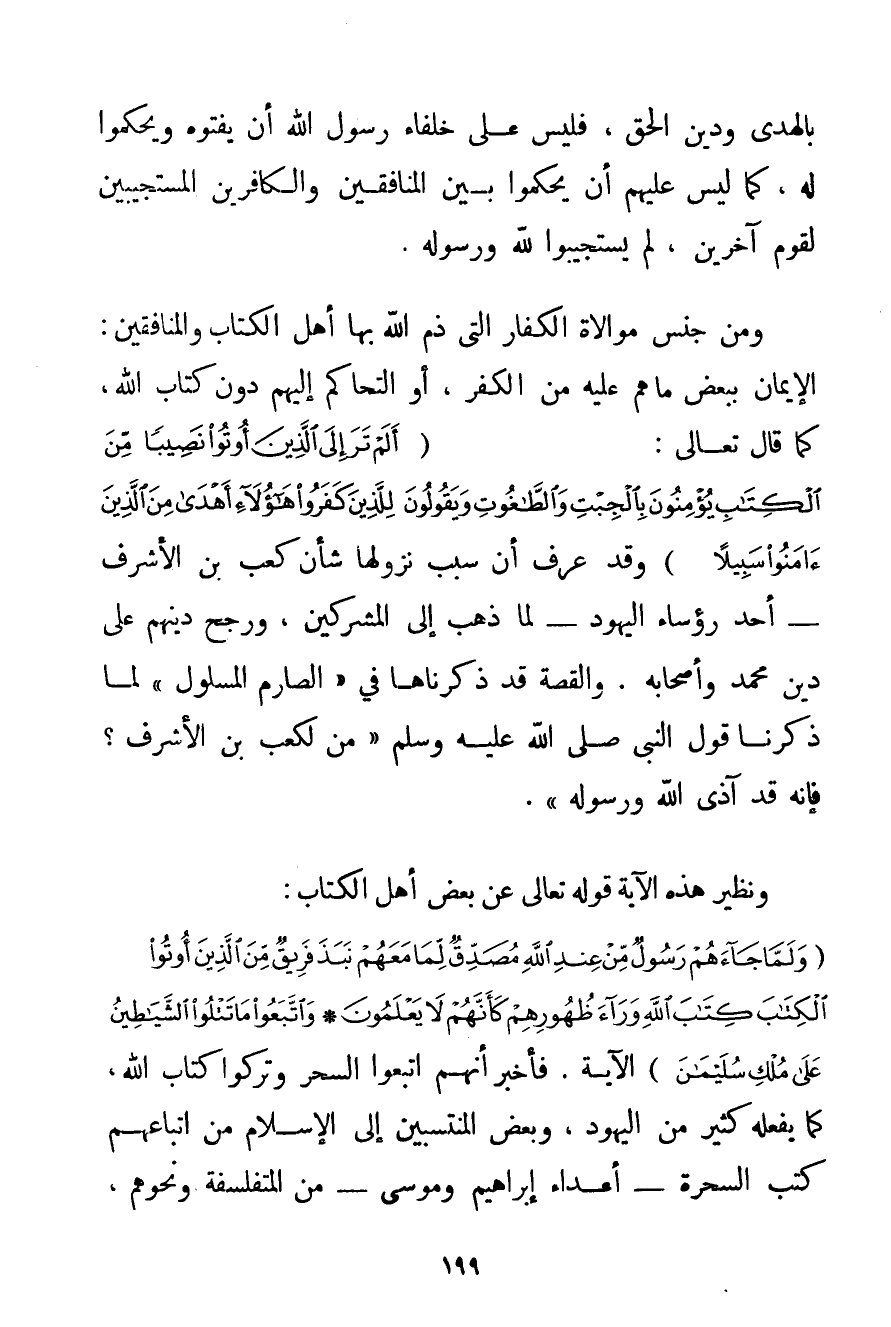 وَمِنْ جِنْسِ مُوَالَاةِ الْكُفَّارِ الَّتِي ذَمَّ اللَّهُ بِهَا أَهْلَ الْكِتَابِ وَالْمُنَافِقِينَ: الْإِيمَانُ بِبَعْضِ مَا هُمْ عَلَيْهِ مِنْ الْكُفْرِ أَوْ التَّحَاكُمُ إلَيْهِمْ دُونَ كِتَابِ اللَّهِ كَمَا قَالَ تَعَالَى: {أَلَمْ تَرَ إلَى الَّذِينَ أُوتُوا نَصِيبًا مِنَ الْكِتَابِ يُؤْمِنُونَ بِالْجِبْتِ وَالطَّاغُوتِ وَيَقُولُونَ لِلَّذِينَ كَفَرُوا هَؤُلَاءِ أَهْدَى مِنَ الَّذِينَ آمَنُوا سَبِيلًا} وَقَدْ عُرِفَ أَنَّ سَبَبَ نُزُولِهَا شَأْنُ كَعْبِ بْنِ الْأَشْرَفِ - أَحَدِ رُؤَسَاءِ الْيَهُودِ - لَمَّا ذَهَبَ إلَى الْمُشْرِكِينَ وَرَجَّحَ دِينَهُمْ عَلَى دِينِ مُحَمَّدٍ وَأَصْحَابِهِ. وَالْقِصَّةُ قَدْ ذَكَرْنَاهَا فِي " الصَّارِمِ الْمَسْلُولِ " لَمَّا ذَكَرْنَا قَوْلَ النَّبِيِّ صَلَّى اللَّهُ عَلَيْهِ وَسَلَّمَ " مَنْ لِكَعْبِ بْنِ الْأَشْرَفِ؟ فَإِنَّهُ قَدْ آذَى اللَّهَ وَرَسُولَهُ ". وَنَظِيرُ هَذِهِ الْآيَةِ قَوْله تَعَالَى عَنْ بَعْضِ أَهْلِ الْكِتَابِ: {وَلَمَّا جَاءَهُمْ رَسُولٌ مِنْ عِنْدِ اللَّهِ مُصَدِّقٌ لِمَا مَعَهُمْ نَبَذَ فَرِيقٌ مِنَ الَّذِينَ أُوتُوا الْكِتَابَ كِتَابَ اللَّهِ وَرَاءَ ظُهُورِهِمْ كَأَنَّهُمْ لَا يَعْلَمُونَ} {وَاتَّبَعُوا مَا تَتْلُو الشَّيَاطِينُ عَلَى مُلْكِ سُلَيْمَانَ} الْآيَةَ. فَأَخْبَرَ أَنَّهُمْ اتَّبَعُوا السِّحْرَ وَتَرَكُوا كِتَابَ اللَّهِ كَمَا يَفْعَلُهُ كَثِيرٌ مِنْ الْيَهُودِ وَبَعْضُ الْمُنْتَسِبِينَ إلَى الْإِسْلَامِ مِنْ اتِّبَاعِهِمْ كُتُبَ السَّحَرَةِ - أَعْدَاءِ إبْرَاهِيمَ وَمُوسَى - مِنْ الْمُتَفَلْسِفَةِ وَنَحْوِهِمْ