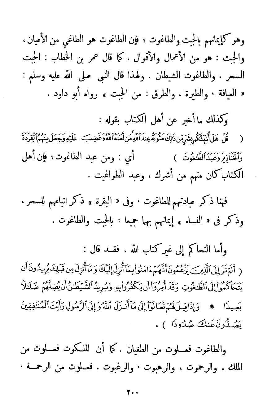 وَهُوَ كَإِيمَانِهِمْ بِالْجِبْتِ وَالطَّاغُوتِ؛ فَإِنَّ الطَّاغُوتَ هُوَ الطَّاغِي مِنْ الْأَعْيَانِ وَالْجِبْتُ: هُوَ مِنْ الْأَعْمَالِ وَالْأَقْوَالِ كَمَا قَالَ عُمَرُ بْنُ الْخَطَّابِ: الْجِبْتُ السِّحْرُ وَالطَّاغُوتُ الشَّيْطَانُ. وَلِهَذَا قَالَ النَّبِيُّ صَلَّى اللَّهُ عَلَيْهِ وَسَلَّمَ {الْعِيَافَةُ وَالطِّيَرَةُ وَالطَّرْقُ: مِنْ الْجِبْتِ} رَوَاهُ أَبُو دَاوُد. وَكَذَلِكَ مَا أَخْبَرَ عَنْ أَهْلِ الْكِتَابِ بِقَوْلِهِ: {قُلْ هَلْ أُنَبِّئُكُمْ بِشَرٍّ مِنْ ذَلِكَ مَثُوبَةً عِنْدَ اللَّهِ مَنْ لَعَنَهُ اللَّهُ وَغَضِبَ عَلَيْهِ وَجَعَلَ مِنْهُمُ الْقِرَدَةَ وَالْخَنَازِيرَ وَعَبَدَ الطَّاغُوتَ} أَيْ: وَمَنْ عَبَدَ الطَّاغُوتَ فَإِنَّ أَهْلَ الْكِتَابِ كَانَ مِنْهُمْ مَنْ أَشْرَكَ وَعَبَدَ الطَّوَاغِيتَ. فَهُنَا ذَكَرَ عِبَادَتَهُمْ لِلطَّاغُوتِ وَفِي " الْبَقَرَةِ " ذَكَرَ اتِّبَاعَهُمْ لِلسِّحْرِ وَذَكَرَ فِي " النِّسَاءِ " إيمَانَهُمْ بِهِمَا جَمِيعًا: بِالْجِبْتِ وَالطَّاغُوتِ. وَأَمَّا التَّحَاكُمُ إلَى غَيْرِ كِتَابِ اللَّهِ فَقَدْ قَالَ: {أَلَمْ تَرَ إلَى الَّذِينَ يَزْعُمُونَ أَنَّهُمْ آمَنُوا بِمَا أُنْزِلَ إلَيْكَ وَمَا أُنْزِلَ مِنْ قَبْلِكَ يُرِيدُونَ أَنْ يَتَحَاكَمُوا إلَى الطَّاغُوتِ وَقَدْ أُمِرُوا أَنْ يَكْفُرُوا بِهِ وَيُرِيدُ الشَّيْطَانُ أَنْ يُضِلَّهُمْ ضَلَالًا بَعِيدًا} {وَإِذَا قِيلَ لَهُمْ تَعَالَوْا إلَى مَا أَنْزَلَ اللَّهُ وَإِلَى الرَّسُولِ رَأَيْتَ الْمُنَافِقِينَ يَصُدُّونَ عَنْكَ صُدُودًا} . وَالطَّاغُوتُ فعلوت مِنْ الطُّغْيَانِ. كَمَا أَنَّ الْمَلَكُوتَ فعلوت مِنْ الْمُلْك. وَالرَّحَمُوتُ وَالرَّهَبُوتُ والرغبوت. فعلوت مِنْ الرَّحْمَةِ