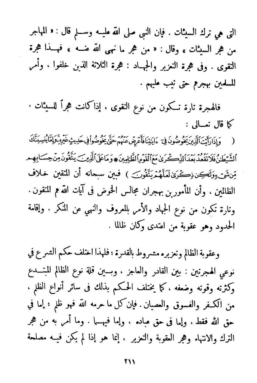 فَإِنَّ الْهِجْرَةَ نَوْعٌ مِنْ أَنْوَاعِ التَّعْزِيرِ وَالْعُقُوبَةُ نَوْعٌ مِنْ أَنْوَاعِ الْهِجْرَةِ الَّتِي هِيَ تَرْكُ السَّيِّئَاتِ. فَإِنَّ النَّبِيَّ صَلَّى اللَّهُ عَلَيْهِ وَسَلَّمَ قَالَ: {الْمُهَاجِرُ مَنْ هَجَرَ السَّيِّئَاتِ} وَقَالَ: {مَنْ هَجَرَ مَا نَهَى اللَّهُ عَنْهُ} فَهَذَا هِجْرَةُ التَّقْوَى. وَفِي هِجْرَةِ التَّعْزِيرِ وَالْجِهَادِ: هِجْرَةُ الثَّلَاثَةِ الَّذِينَ خُلِّفُوا وَأَمَرَ الْمُسْلِمِينَ بِهَجْرِهِمْ حَتَّى تِيبَ عَلَيْهِمْ. فَالْهِجْرَةُ تَارَةً تَكُونُ مِنْ نَوْعِ التَّقْوَى إذَا كَانَتْ هَجْرًا لِلسَّيِّئَاتِ. كَمَا قَالَ تَعَالَى: {وَإِذَا رَأَيْتَ الَّذِينَ يَخُوضُونَ فِي آيَاتِنَا فَأَعْرِضْ عَنْهُمْ حَتَّى يَخُوضُوا فِي حَدِيثٍ غَيْرِهِ وَإِمَّا يُنْسِيَنَّكَ الشَّيْطَانُ فَلَا تَقْعُدْ بَعْدَ الذِّكْرَى مَعَ الْقَوْمِ الظَّالِمِينَ} {وَمَا عَلَى الَّذِينَ يَتَّقُونَ مِنْ حِسَابِهِمْ مِنْ شَيْءٍ وَلَكِنْ ذِكْرَى لَعَلَّهُمْ يَتَّقُونَ} فَبَيَّنَ سُبْحَانَهُ أَنَّ الْمُتَّقِينَ خِلَافُ الظَّالِمِينَ وَأَنَّ الْمَأْمُورِينَ بِهِجْرَانِ مَجَالِسِ الْخَوْضِ فِي آيَاتِ اللَّهِ هُمْ الْمُتَّقُونَ. وَتَارَةً تَكُونُ مِنْ نَوْعِ الْجِهَادِ وَالْأَمْرِ بِالْمَعْرُوفِ وَالنَّهْيِ عَنْ الْمُنْكَرِ وَإِقَامَةِ الْحُدُودِ وَهُوَ عُقُوبَةُ مَنْ اعْتَدَى وَكَانَ ظَالِمًا. وَعُقُوبَةُ الظَّالِمِ وَتَعْزِيرُهُ مَشْرُوطٌ بِالْقُدْرَةِ؛ فَلِهَذَا اخْتَلَفَ حُكْمُ الشَّرْعِ فِي نَوْعَيْ الْهِجْرَتَيْنِ: بَيْنَ الْقَادِرِ وَالْعَاجِزِ وَبَيْنَ قِلَّةِ نَوْعِ الظَّالِمِ الْمُبْتَدِعِ وَكَثْرَتِهِ وَقُوَّتِهِ وَضَعْفِهِ كَمَا يَخْتَلِفُ الْحُكْمُ بِذَلِكَ فِي سَائِرِ أَنْوَاعِ الظُّلْمِ مِنْ الْكُفْرِ وَالْفُسُوقِ وَالْعِصْيَانِ. فَإِنَّ كُلَّمَا حَرَّمَهُ اللَّهُ فَهُوَ ظُلْمٌ؛ إمَّا فِي حَقِّ اللَّهِ فَقَطْ وَإِمَّا فِي حَقِّ عِبَادِهِ وَإِمَّا فِيهِمَا. وَمَا أَمَرَ بِهِ مِنْ هَجْرِ التُّرْكِ وَالِانْتِهَاءِ وَهَجْرِ الْعُقُوبَةِ وَالتَّعْزِيرِ إنَّمَا هُوَ إذَا لَمْ يَكُنْ فِيهِ مَصْلَحَةٌ