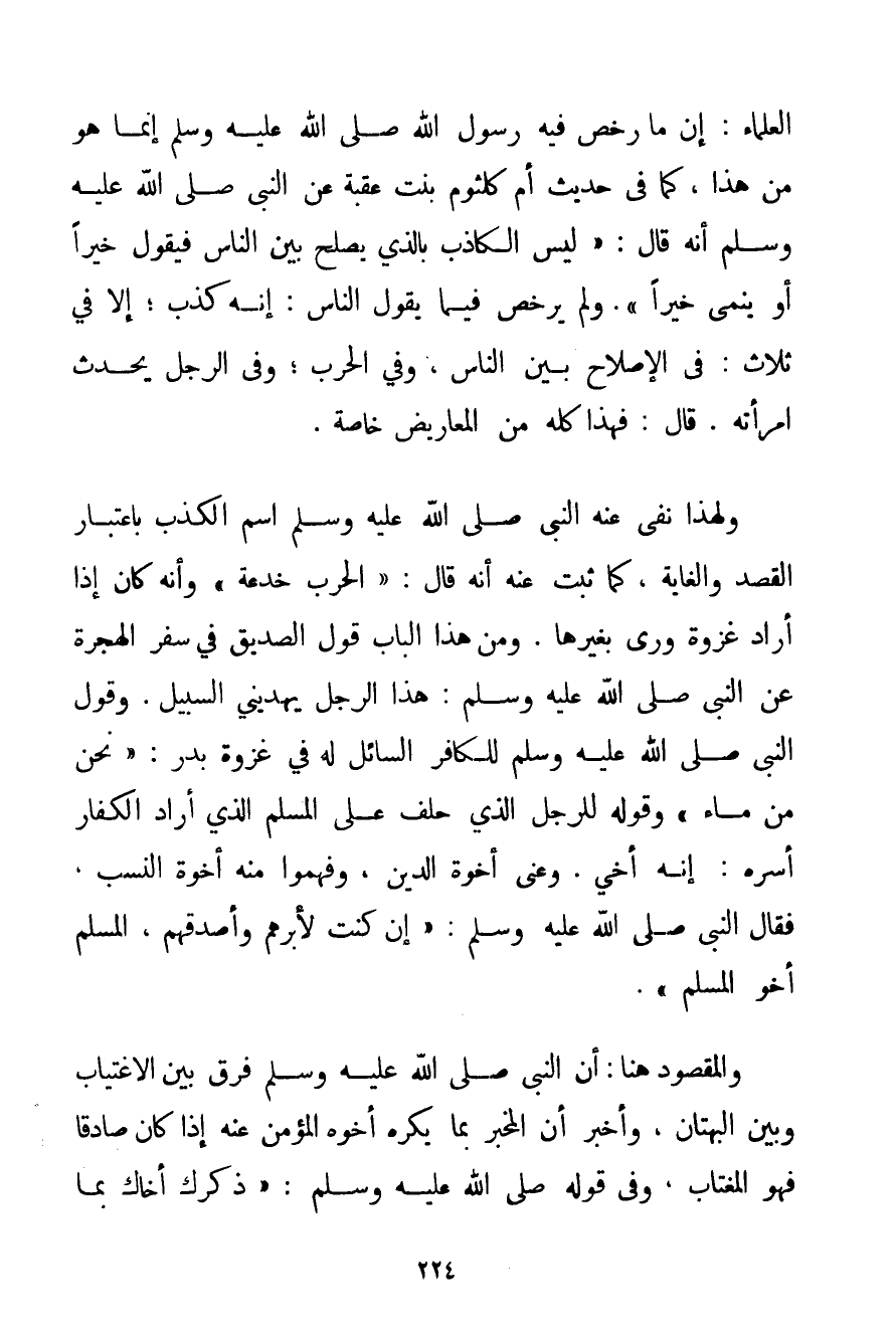 الْعُلَمَاءِ: إنَّ مَا رَخَّصَ فِيهِ رَسُولُ اللَّهِ صَلَّى اللَّهُ عَلَيْهِ وَسَلَّمَ إنَّمَا هُوَ مِنْ هَذَا كَمَا فِي حَدِيثِ أُمِّ كُلْثُومٍ بِنْتِ عُقْبَةَ عَنْ النَّبِيِّ صَلَّى اللَّهُ عَلَيْهِ وَسَلَّمَ أَنَّهُ قَالَ: {لَيْسَ الْكَاذِبُ بِاَلَّذِي يُصْلِحُ بَيْنَ النَّاسِ فَيَقُولُ خَيْرًا أَوْ ينوي خَيْرًا} . وَلَمْ يُرَخِّصْ فِيمَا يَقُولُ النَّاسُ: إنَّهُ كَذِبٌ؛ إلَّا فِي ثَلَاثٍ: فِي الْإِصْلَاحِ بَيْنَ النَّاسِ وَفِي الْحَرْبِ؛ وَفِي الرَّجُلِ يُحَدِّثُ امْرَأَتَهُ. قَالَ: فَهَذَا كُلُّهُ مِنْ الْمَعَارِيضِ خَاصَّةً. وَلِهَذَا نَفَى عَنْهُ النَّبِيُّ صَلَّى اللَّهُ عَلَيْهِ وَسَلَّمَ اسْمَ الْكَذِبِ بِاعْتِبَارِ الْقَصْدِ وَالْغَايَةِ كَمَا ثَبَتَ عَنْهُ أَنَّهُ قَالَ: {الْحَرْبُ خُدْعَةٌ} وَأَنَّهُ كَانَ إذَا أَرَادَ غَزْوَةً وَرَى بِغَيْرِهَا. وَمِنْ هَذَا الْبَابِ قَوْلُ الصِّدِّيقِ فِي سَفَرِ الْهِجْرَةِ عَنْ النَّبِيِّ صَلَّى اللَّهُ عَلَيْهِ وَسَلَّمَ هَذَا الرَّجُلُ يَهْدِينِي السَّبِيلَ. {وَقَوْلُ النَّبِيِّ صَلَّى اللَّهُ عَلَيْهِ وَسَلَّمَ لِلْكَافِرِ السَّائِلِ لَهُ فِي غَزْوَةِ بَدْرٍ: نَحْنُ مِنْ مَاءٍ} وَقَوْلُهُ لِلرَّجُلِ الَّذِي حَلَفَ عَلَى الْمُسْلِمِ الَّذِي أَرَادَ الْكُفَّارُ أَسْرَهُ: إنَّهُ أَخِي. وَعَنِيَ أُخُوَّةَ الدِّينِ وَفَهِمُوا مِنْهُ أُخُوَّةَ النَّسَبِ فَقَالَ النَّبِيُّ صَلَّى اللَّهُ عَلَيْهِ وَسَلَّمَ {إنْ كُنْت لَأَبَرَّهُمْ وَأَصْدَقَهُمْ الْمُسْلِمُ أَخُو الْمُسْلِمِ} . وَالْمَقْصُودُ هُنَا: أَنَّ النَّبِيَّ صَلَّى اللَّهُ عَلَيْهِ وَسَلَّمَ فَرَّقَ بَيْنَ الِاغْتِيَابِ وَبَيْنَ الْبُهْتَانِ وَأَخْبَرَ أَنَّ الْمُخْبِرَ بِمَا يَكْرَهُ أَخُوهُ الْمُؤْمِنُ عَنْهُ إذَا كَانَ صَادِقًا فَهُوَ الْمُغْتَابُ وَفِي قَوْلِهِ صَلَّى اللَّهُ عَلَيْهِ وَسَلَّمَ {ذِكْرُك أَخَاك بِمَا