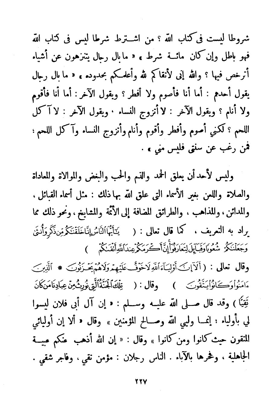 شُرُوطًا لَيْسَتْ فِي كِتَابِ اللَّهِ؟ مَنْ اشْتَرَطَ شَرْطًا لَيْسَ فِي كِتَابِ اللَّهِ فَهُوَ بَاطِلٌ وَإِنْ كَانَ مِائَةَ شَرْطٍ} {مَا بَالُ رِجَالٍ يَتَنَزَّهُونَ عَنْ أَشْيَاءَ أَتَرَخَّصُ فِيهَا؟ وَاَللَّهِ إنِّي لَأَتْقَاكُمْ لِلَّهِ وَأَعْلَمُكُمْ بِحُدُودِهِ} {مَا بَالُ رِجَالٍ يَقُولُ أَحَدُهُمْ: أَمَّا أَنَا فَأَصُومُ وَلَا أُفْطِرُ؟ وَيَقُولُ الْآخَرُ: أَمَّا أَنَا فَأَقُومُ وَلَا أَنَامُ؟ وَيَقُولُ الْآخَرُ: لَا أَتَزَوَّجُ النِّسَاءَ وَيَقُولُ الْآخَرُ: لَا آكُلُ اللَّحْمَ؟ لَكِنِّي أَصُومُ وَأُفْطِرُ وَأَقُومُ وَأَنَامُ وَأَتَزَوَّجُ النِّسَاءَ وَآكُلُ اللَّحْمَ؛ فَمَنْ رَغِبَ عَنْ سُنَّتِي فَلَيْسَ مِنِّي} . وَلَيْسَ لِأَحَدِ أَنْ يُعَلِّقَ الْحَمْدَ وَالذَّمَّ وَالْحُبَّ وَالْبُغْضَ وَالْمُوَالَاةَ وَالْمُعَادَاةَ وَالصَّلَاةَ وَاللَّعْنَ بِغَيْرِ الْأَسْمَاءِ الَّتِي عَلَّقَ اللَّهُ بِهَا ذَلِكَ: مِثْلَ أَسْمَاءِ الْقَبَائِلِ وَالْمَدَائِنِ وَالْمَذَاهِبِ وَالطَّرَائِقِ الْمُضَافَةِ إلَى الْأَئِمَّةِ وَالْمَشَايِخِ؛ وَنَحْوَ ذَلِكَ مِمَّا يُرَادُ بِهِ التَّعْرِيفُ كَمَا قَالَ تَعَالَى: {يَا أَيُّهَا النَّاسُ إنَّا خَلَقْنَاكُمْ مِنْ ذَكَرٍ وَأُنْثَى وَجَعَلْنَاكُمْ شُعُوبًا وَقَبَائِلَ لِتَعَارَفُوا إنَّ أَكْرَمَكُمْ عِنْدَ اللَّهِ أَتْقَاكُمْ} وَقَالَ تَعَالَى: {أَلَا إنَّ أَوْلِيَاءَ اللَّهِ لَا خَوْفٌ عَلَيْهِمْ وَلَا هُمْ يَحْزَنُونَ} {الَّذِينَ آمَنُوا وَكَانُوا يَتَّقُونَ} وَقَالَ: {تِلْكَ الْجَنَّةُ الَّتِي نُورِثُ مِنْ عِبَادِنَا مَنْ كَانَ تَقِيًّا} وَقَدْ قَالَ صَلَّى اللَّهُ عَلَيْهِ وَسَلَّمَ {إنَّ آلَ أَبِي فُلَانٍ لَيْسُوا لِي بأولياء؛ إنَّمَا وَلِيِّي اللَّهُ وَصَالِحُ الْمُؤْمِنِينَ} وَقَالَ {أَلَا إنَّ أَوْلِيَائِي الْمُتَّقُونَ حَيْثُ كَانُوا وَمَنْ كَانُوا} وَقَالَ: {إنَّ اللَّهَ أَذْهَبَ عَنْكُمْ عُبِّيَّةَ الْجَاهِلِيَّةِ وَفَخْرَهَا بِالْآبَاءِ. النَّاسُ رَجُلَانِ: مُؤْمِنٌ تَقِيٌّ وَفَاجِرٌ شَقِيٌّ.