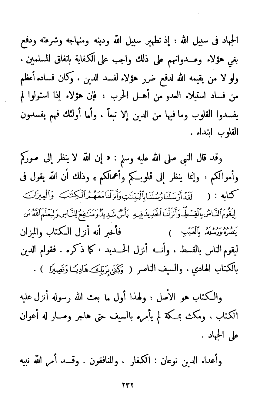 فِي سَبِيلِ اللَّهِ؛ إذْ تَطْهِيرُ سَبِيلِ اللَّهِ وَدِينِهِ وَمِنْهَاجِهِ وَشِرْعَتِهِ وَدَفْعِ بَغْيِ هَؤُلَاءِ وَعُدْوَانِهِمْ عَلَى ذَلِكَ وَاجِبٌ عَلَى الْكِفَايَةِ بِاتِّفَاقِ الْمُسْلِمِينَ وَلَوْلَا مَنْ يُقِيمُهُ اللَّهُ لِدَفْعِ ضَرَرِ هَؤُلَاءِ لَفَسَدَ الدِّينُ وَكَانَ فَسَادُهُ أَعْظَمَ مِنْ فَسَادِ اسْتِيلَاءِ الْعَدُوِّ مِنْ أَهْلِ الْحَرْبِ؛ فَإِنَّ هَؤُلَاءِ إذَا اسْتَوْلَوْا لَمْ يُفْسِدُوا الْقُلُوبَ وَمَا فِيهَا مِنْ الدِّينِ إلَّا تَبَعًا وَأَمَّا أُولَئِكَ فَهُمْ يُفْسِدُونَ الْقُلُوبَ ابْتِدَاءً. وَقَدْ قَالَ النَّبِيُّ صَلَّى اللَّهُ عَلَيْهِ وَسَلَّمَ {إنَّ اللَّهَ لَا يَنْظُرُ إلَى صُوَرِكُمْ وَأَمْوَالِكُمْ؛ وَإِنَّمَا يَنْظُرُ إلَى قُلُوبِكُمْ وَأَعْمَالِكُمْ} وَذَلِكَ أَنَّ اللَّهَ يَقُولُ فِي كِتَابِهِ: {لَقَدْ أَرْسَلْنَا رُسُلَنَا بِالْبَيِّنَاتِ وَأَنْزَلْنَا مَعَهُمُ الْكِتَابَ وَالْمِيزَانَ لِيَقُومَ النَّاسُ بِالْقِسْطِ وَأَنْزَلْنَا الْحَدِيدَ فِيهِ بَأْسٌ شَدِيدٌ وَمَنَافِعُ لِلنَّاسِ وَلِيَعْلَمَ اللَّهُ مَنْ يَنْصُرُهُ وَرُسُلَهُ بِالْغَيْبِ} فَأَخْبَرَ أَنَّهُ أَنْزَلَ الْكِتَابَ وَالْمِيزَانَ لِيَقُومَ النَّاسُ بِالْقِسْطِ وَأَنَّهُ أَنْزَلَ الْحَدِيدَ كَمَا ذَكَرَهُ. فَقِوَامُ الدِّينِ بِالْكِتَابِ الْهَادِي وَالسَّيْفِ النَّاصِرِ {وَكَفَى بِرَبِّكَ هَادِيًا وَنَصِيرًا} . وَالْكِتَابُ هُوَ الْأَصْلُ؛ وَلِهَذَا أَوَّلُ مَا بَعَثَ اللَّهُ رَسُولَهُ أَنْزَلَ عَلَيْهِ الْكِتَابَ؛ وَمَكَثَ بِمَكَّةَ لَمْ يَأْمُرْهُ بِالسَّيْفِ حَتَّى هَاجَرَ وَصَارَ لَهُ أَعْوَانٌ عَلَى الْجِهَادِ.