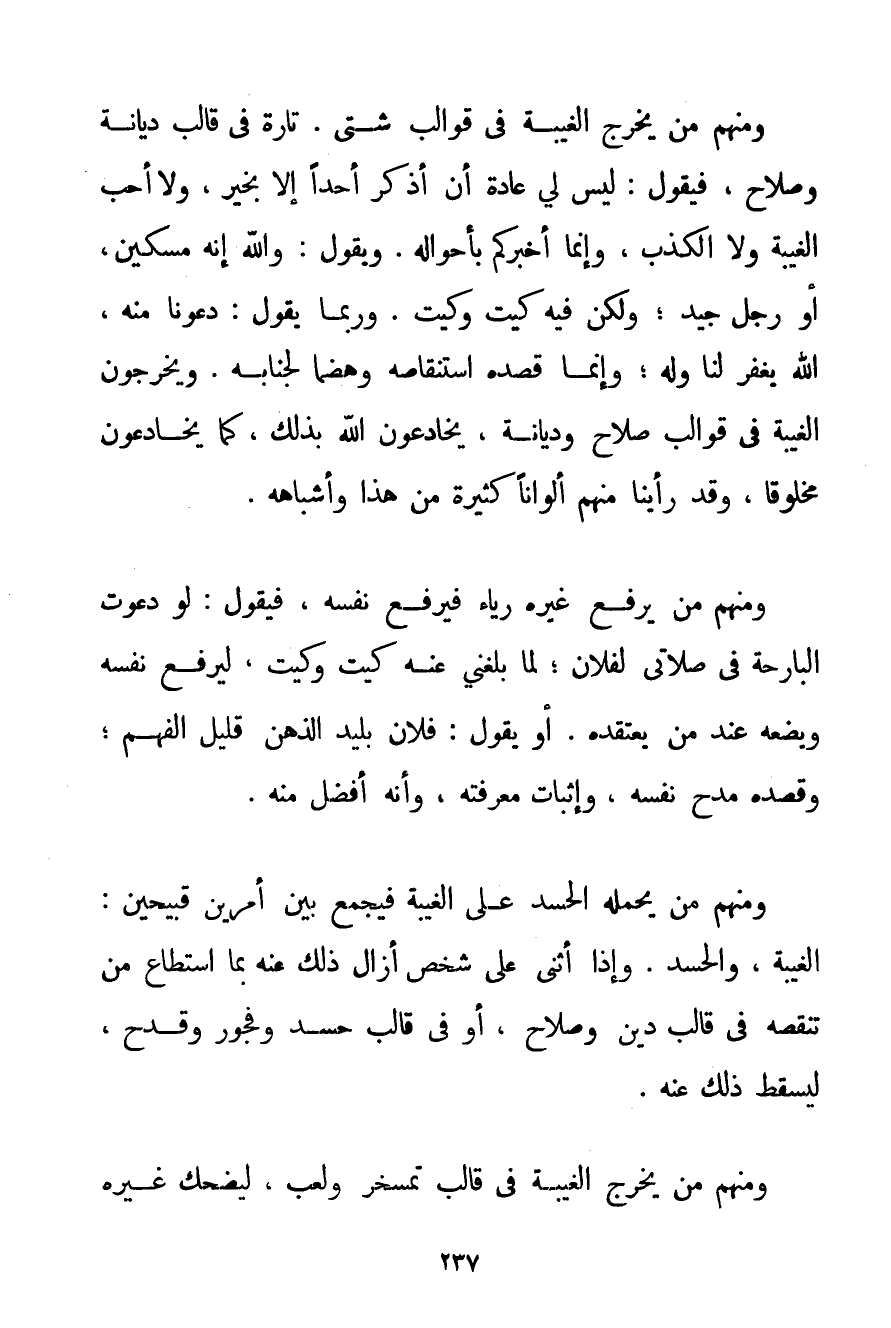 وَمِنْهُمْ مَنْ يُخْرِجُ الْغِيبَةَ فِي قَوَالِبَ شَتَّى. تَارَةً فِي قَالِبِ دِيَانَةٍ وَصَلَاحٍ فَيَقُولُ: لَيْسَ لِي عَادَةً أَنْ أَذْكُرَ أَحَدًا إلَّا بِخَيْرِ وَلَا أُحِبُّ الْغِيبَةَ وَلَا الْكَذِبَ؛ وَإِنَّمَا أُخْبِرُكُمْ بِأَحْوَالِهِ. وَيَقُولُ: وَاَللَّهِ إنَّهُ مِسْكِينٌ أَوْ رَجُلٌ جَيِّدٌ؛ وَلَكِنْ فِيهِ كَيْت وَكَيْت. وَرُبَّمَا يَقُولُ: دَعُونَا مِنْهُ اللَّهُ يَغْفِرُ لَنَا وَلَهُ؛ وَإِنَّمَا قَصْدُهُ اسْتِنْقَاصُهُ وَهَضْمٌ لِجَانِبِهِ. وَيُخْرِجُونَ الْغِيبَةَ فِي قَوَالِبَ صَلَاحٍ وَدِيَانَةٍ يُخَادِعُونَ اللَّهَ بِذَلِكَ كَمَا يُخَادِعُونَ مَخْلُوقًا؛ وَقَدْ رَأَيْنَا مِنْهُمْ أَلْوَانًا كَثِيرَةً مِنْ هَذَا وَأَشْبَاهِهِ. وَمِنْهُمْ مَنْ يَرْفَعُ غَيْرَهُ رِيَاءً فَيَرْفَعُ نَفْسَهُ فَيَقُولُ: لَوْ دَعَوْت الْبَارِحَةَ فِي صَلَاتِي لِفُلَانِ؛ لَمَا بَلَغَنِي عَنْهُ كَيْت وَكَيْت لِيَرْفَعَ نَفْسَهُ وَيَضَعَهُ عِنْدَ مَنْ يَعْتَقِدُهُ. أَوْ يَقُولُ: فُلَانٌ بَلِيدُ الذِّهْنِ قَلِيلُ الْفَهْمِ؛ وَقَصْدُهُ مَدْحُ نَفْسِهِ وَإِثْبَاتُ مَعْرِفَتِهِ وَأَنَّهُ أَفْضَلُ مِنْهُ. وَمِنْهُمْ مَنْ يَحْمِلُهُ الْحَسَدُ عَلَى الْغِيبَةِ فَيَجْمَعُ بَيْنَ أَمْرَيْنِ قَبِيحَيْنِ: الْغِيبَةِ وَالْحَسَدِ. وَإِذَا أَثْنَى عَلَى شَخْصٍ أَزَالَ ذَلِكَ عَنْهُ بِمَا اسْتَطَاعَ مِنْ تَنَقُّصِهِ فِي قَالِبِ دِينٍ وَصَلَاحٍ أَوْ فِي قَالِبِ حَسَدٍ وَفُجُورٍ وَقَدْحٍ لِيُسْقِطَ ذَلِكَ عَنْهُ. وَمِنْهُمْ مَنْ يُخْرِجُ الْغِيبَةَ فِي قَالِبِ تمسخر وَلَعِبٍ لَيُضْحِكَ غَيْرَهُ