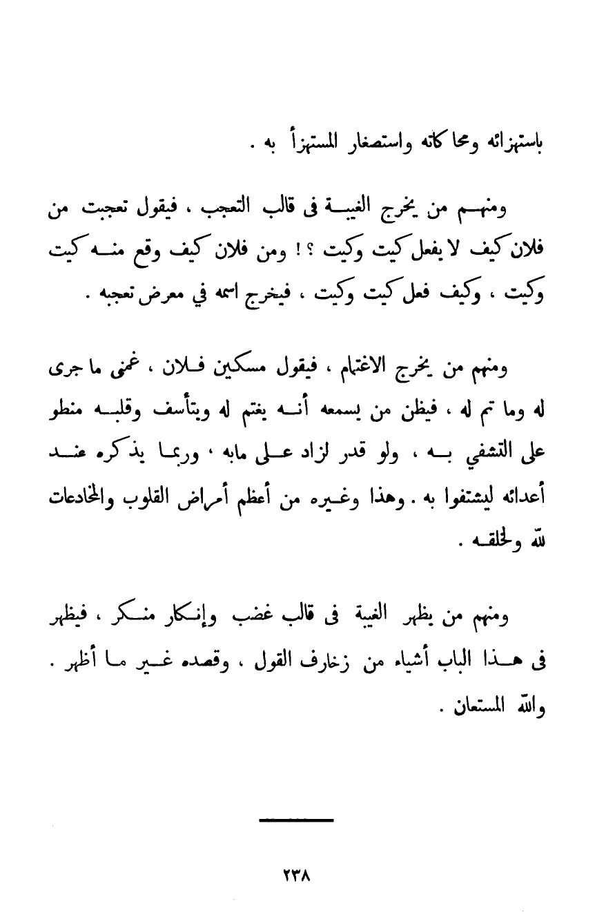 بِاسْتِهْزَائِهِ وَمُحَاكَاتِهِ وَاسْتِصْغَارِ الْمُسْتَهْزَأِ بِهِ. وَمِنْهُمْ مَنْ يُخْرِجُ الْغِيبَةَ فِي قَالِبِ التَّعَجُّبِ فَيَقُولُ تَعَجَّبْت مِنْ فُلَانٍ كَيْفَ لَا يَفْعَلُ كَيْت وَكَيْت وَمِنْ فُلَانٍ كَيْفَ وَقَعَ مِنْهُ كَيْت وَكَيْت وَكَيْفَ فَعَلَ كَيْت وَكَيْت فَيُخْرِجُ اسْمَهُ فِي مَعْرِضِ تَعَجُّبِهِ. وَمِنْهُمْ مَنْ يُخْرِجُ الِاغْتِمَامَ فَيَقُولُ مِسْكِينٌ فُلَانٌ غَمَّنِي مَا جَرَى لَهُ وَمَا تَمَّ لَهُ فَيَظُنُّ مَنْ يَسْمَعُهُ أَنَّهُ يَغْتَمُّ لَهُ وَيَتَأَسَّفُ وَقَلْبُهُ مُنْطَوٍ عَلَى التَّشَفِّي بِهِ وَلَوْ قَدَرَ لَزَادَ عَلَى مَا بِهِ وَرُبَّمَا يَذْكُرُهُ عِنْدَ أَعْدَائِهِ لِيَشْتَفُوا بِهِ. وَهَذَا وَغَيْرُهُ مِنْ أَعْظَمِ أَمْرَاضِ الْقُلُوبِ وَالْمُخَادَعَاتِ لِلَّهِ وَلِخَلْقِهِ. وَمِنْهُمْ مَنْ يُظْهِرُ الْغِيبَةَ فِي قَالِبِ غَضَبٍ وَإِنْكَارِ مُنْكَرٍ فَيُظْهِرُ فِي هَذَا الْبَابِ أَشْيَاءَ مِنْ زَخَارِفِ الْقَوْلِ وَقَصْدُهُ غَيْرُ مَا أَظْهَرَ. وَاَللَّهُ الْمُسْتَعَانُ.