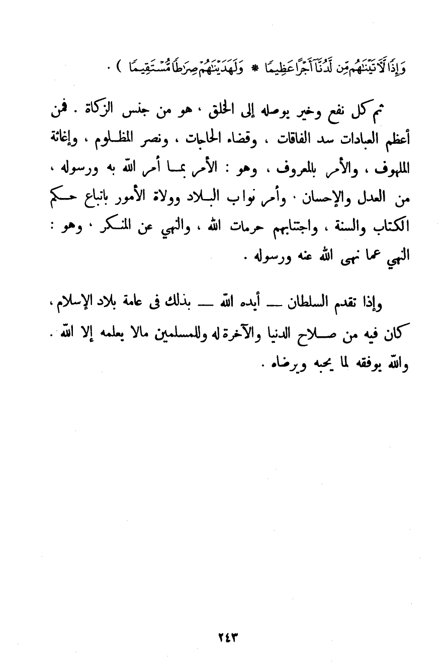 تَثْبِيتًا} {وَإِذًا لَآتَيْنَاهُمْ مِنْ لَدُنَّا أَجْرًا عَظِيمًا} {وَلَهَدَيْنَاهُمْ صِرَاطًا مُسْتَقِيمًا.} ثُمَّ كَلُّ نَفْعٍ وَخَيْرٍ يُوَصِّلُهُ إلَى الْخَلْقِ هُوَ مِنْ جِنْسِ الزَّكَاةِ. فَمِنْ أَعْظَمِ الْعِبَادَاتِ سَدُّ الفاقات وَقَضَاءُ الْحَاجَاتِ وَنَصْرُ الْمَظْلُومِ وَإِغَاثَةُ الْمَلْهُوفِ وَالْأَمْرُ بِالْمَعْرُوفِ وَهُوَ: الْأَمْرُ بِمَا أَمَرَ اللَّهُ بِهِ وَرَسُولُهُ مِنْ الْعَدْلِ وَالْإِحْسَانِ وَأَمْرُ نَوَائِبِ الْبِلَادِ وَوُلَاةِ الْأُمُورِ بِاتِّبَاعِ حُكْمِ الْكِتَابِ وَالسُّنَّةِ وَاجْتِنَابِهِمْ حُرُمَاتِ اللَّهِ وَالنَّهْيِ عَنْ الْمُنْكَرِ وَهُوَ: النَّهْيُ عَمَّا نَهَى اللَّهُ عَنْهُ وَرَسُولُهُ. وَإِذَا تَقَدَّمَ السُّلْطَانُ - أَيَّدَهُ اللَّهُ - بِذَلِكَ فِي عَامَّةِ بِلَادِ الْإِسْلَامِ كَانَ فِيهِ مِنْ صَلَاحِ الدُّنْيَا وَالْآخِرَةِ لَهُ وَلِلْمُسْلِمِينَ مَا لَا يَعْلَمُهُ إلَّا اللَّهُ. وَاَللَّهُ يُوَفِّقُهُ لِمَا يُحِبُّهُ وَيَرْضَاهُ.