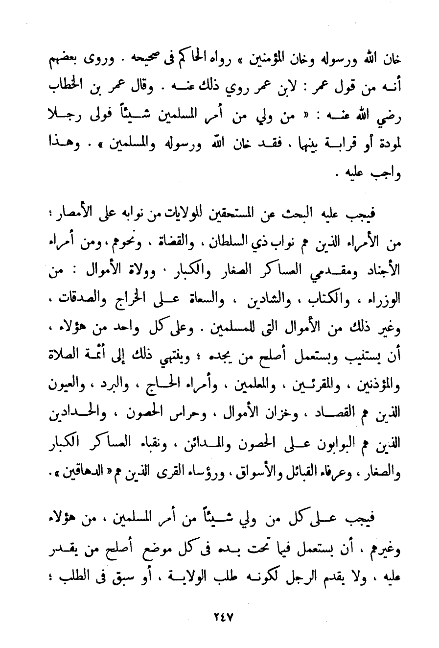 خَانَ اللَّهَ وَرَسُولَهُ وَخَانَ الْمُؤْمِنِينَ} رَوَاهُ الْحَاكِمُ فِي صَحِيحِهِ. وَرَوَى بَعْضُهُمْ أَنَّهُ مِنْ قَوْلِ عُمَرَ: لِابْنِ عُمَرَ رُوِيَ ذَلِكَ عَنْهُ. وَقَالَ عُمَرُ بْنُ الْخَطَّابِ رَضِيَ اللَّهُ عَنْهُ " مَنْ وَلِيَ مِنْ أَمْرِ الْمُسْلِمِينَ شَيْئًا فَوَلَّى رَجُلًا لِمَوَدَّةِ أَوْ قَرَابَةٍ بَيْنَهُمَا فَقَدْ خَانَ اللَّهَ وَرَسُولَهُ وَالْمُسْلِمِينَ ". وَهَذَا وَاجِبٌ عَلَيْهِ. فَيَجِبُ عَلَيْهِ الْبَحْثُ عَنْ الْمُسْتَحِقِّينَ لِلْوِلَايَاتِ مِنْ نُوَّابِهِ عَلَى الْأَمْصَارِ؛ مِنْ الْأُمَرَاءِ الَّذِينَ هُمْ نُوَّابُ ذِي السُّلْطَانِ وَالْقُضَاةِ وَنَحْوِهِمْ وَمِنْ أُمَرَاءِ الْأَجْنَادِ وَمُقَدِّمِي الْعَسَاكِرِ الصِّغَارِ وَالْكِبَارِ وَوُلَاةِ الْأَمْوَالِ: مِنْ الْوُزَرَاءِ وَالْكُتَّابِ وَالشَّادِينَ وَالسُّعَاةِ عَلَى الْخَرَاجِ وَالصَّدَقَاتِ وَغَيْرِ ذَلِكَ مِنْ الْأَمْوَالِ الَّتِي لِلْمُسْلِمِينَ. وَعَلَى كُلِّ وَاحِدٍ مِنْ هَؤُلَاءِ أَنْ يَسْتَنِيبَ وَيَسْتَعْمِلَ أَصْلَحَ مَنْ يَجِدُهُ؛ وَيَنْتَهِي ذَلِكَ إلَى أَئِمَّةِ الصَّلَاةِ وَالْمُؤَذِّنِينَ وَالْمُقْرِئِينَ وَالْمُعَلِّمِينَ وَأُمَرَاءِ الْحَاجِّ وَالْبَرَدِ وَالْعُيُونِ الَّذِينَ هُمْ الْقُصَّادُ وَخُزَّانِ الْأَمْوَالِ وَحُرَّاسِ الْحُصُونِ وَالْحَدَّادِينَ الَّذِينَ هُمْ الْبَوَّابُونَ عَلَى الْحُصُونِ وَالْمَدَائِنِ وَنُقَبَاءِ الْعَسَاكِرِ الْكِبَارِ وَالصِّغَارِ وَعَرْفَاءِ الْقَبَائِلِ وَالْأَسْوَاقِ وَرُؤَسَاءِ الْقُرَى الَّذِينَ هُمْ " الدَّهَاقِينُ ". فَيَجِبُ عَلَى كُلِّ مَنْ وَلِيَ شَيْئًا مِنْ أَمْرِ الْمُسْلِمِينَ مِنْ هَؤُلَاءِ وَغَيْرِهِمْ أَنْ يَسْتَعْمِلَ فِيمَا تَحْتَ يَدِهِ فِي كُلِّ مَوْضِعٍ أَصْلَحَ مَنْ يَقْدِرُ عَلَيْهِ وَلَا يُقَدِّمُ الرَّجُلَ لِكَوْنِهِ طَلَبَ الْوِلَايَةَ أَوْ سَبَقَ فِي الطَّلَبِ؛