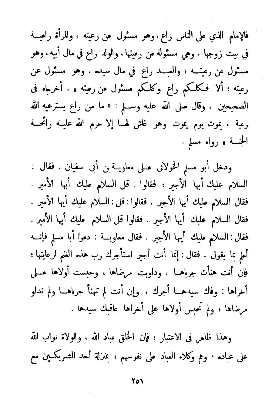 فَالْإِمَامُ الَّذِي عَلَى النَّاسِ رَاعٍ؛ وَهُوَ مَسْؤُولٌ عَنْ رَعِيَّتِهِ وَالْمَرْأَةُ رَاعِيَةٌ فِي بَيْتِ زَوْجِهَا وَهِيَ مَسْئُولَةٌ عَنْ رَعِيَّتِهَا وَالْوَلَدُ رَاعٍ فِي مَالِ أَبِيهِ وَهُوَ مَسْئُولٌ عَنْ رَعِيَّتِهِ؛ وَالْعَبْدُ رَاعٍ فِي مَالِ سَيِّدِهِ وَهُوَ مَسْئُولٌ عَنْ رَعِيَّتِهِ؛ أَلَا فَكُلُّكُمْ رَاعٍ وَكُلُّكُمْ مَسْئُولٌ عَنْ رَعِيَّتِهِ} . أَخْرَجَاهُ فِي الصَّحِيحَيْنِ وَقَالَ صَلَّى اللَّهُ عَلَيْهِ وَسَلَّمَ {مَا مِنْ رَاعٍ يَسْتَرْعِيهِ اللَّهُ رَعِيَّةً يَمُوتُ يَوْمَ يَمُوتُ وَهُوَ غَاشٌّ لَهَا إلَّا حَرَّمَ اللَّهُ عَلَيْهِ رَائِحَةَ الْجَنَّةِ} رَوَاهُ مُسْلِمٌ. وَدَخَلَ أَبُو مُسْلِمٍ الخولاني عَلَى مُعَاوِيَةَ بْنِ أَبِي سُفْيَانَ فَقَالَ: السَّلَامُ عَلَيْك أَيُّهَا الْأَجِيرُ؛ فَقَالُوا: قُلْ السَّلَامُ عَلَيْك أَيُّهَا الْأَمِيرُ. فَقَالَ السَّلَامُ عَلَيْك أَيُّهَا الْأَجِيرُ. فَقَالُوا: قُلْ: السَّلَامُ عَلَيْك أَيُّهَا الْأَمِيرُ. فَقَالَ السَّلَامُ عَلَيْك أَيُّهَا الْأَجِيرُ. فَقَالُوا قُلْ السَّلَامُ عَلَيْك أَيُّهَا الْأَمِيرُ. فَقَالَ: السَّلَامُ عَلَيْك أَيُّهَا الْأَجِيرُ. فَقَالَ مُعَاوِيَةُ: دَعُوا أَبَا مُسْلِمٍ فَإِنَّهُ أَعْلَمُ بِمَا يَقُولُ. فَقَالَ: إنَّمَا أَنْتَ أَجِيرٌ اسْتَأْجَرَك رَبُّ هَذِهِ الْغَنَمِ لِرِعَايَتِهَا؛ فَإِنْ أَنْتَ هَنَأْت جَرْبَاهَا وَدَاوَيْت مَرْضَاهَا وَحَبَسْت أُولَاهَا عَلَى أُخْرَاهَا: وَفَاك سَيِّدُهَا أَجْرَك وَإِنْ أَنْتَ لَمْ تَهْنَأْ جَرْبَاهَا وَلَمْ تداو مَرْضَاهَا؛ وَلَمْ تَحْبِسْ أُولَاهَا عَلَى أُخْرَاهَا عَاقَبَك سَيِّدُهَا. وَهَذَا ظَاهِرٌ فِي الِاعْتِبَارِ؛ فَإِنَّ الْخَلْقَ عِبَادُ اللَّهِ وَالْوُلَاةُ نُوَّابُ اللَّهِ عَلَى عِبَادِهِ وَهُمْ وُكَلَاءُ الْعِبَادِ عَلَى نُفُوسِهِمْ؛ بِمَنْزِلَةِ أَحَدِ الشَّرِيكَيْنِ مَعَ