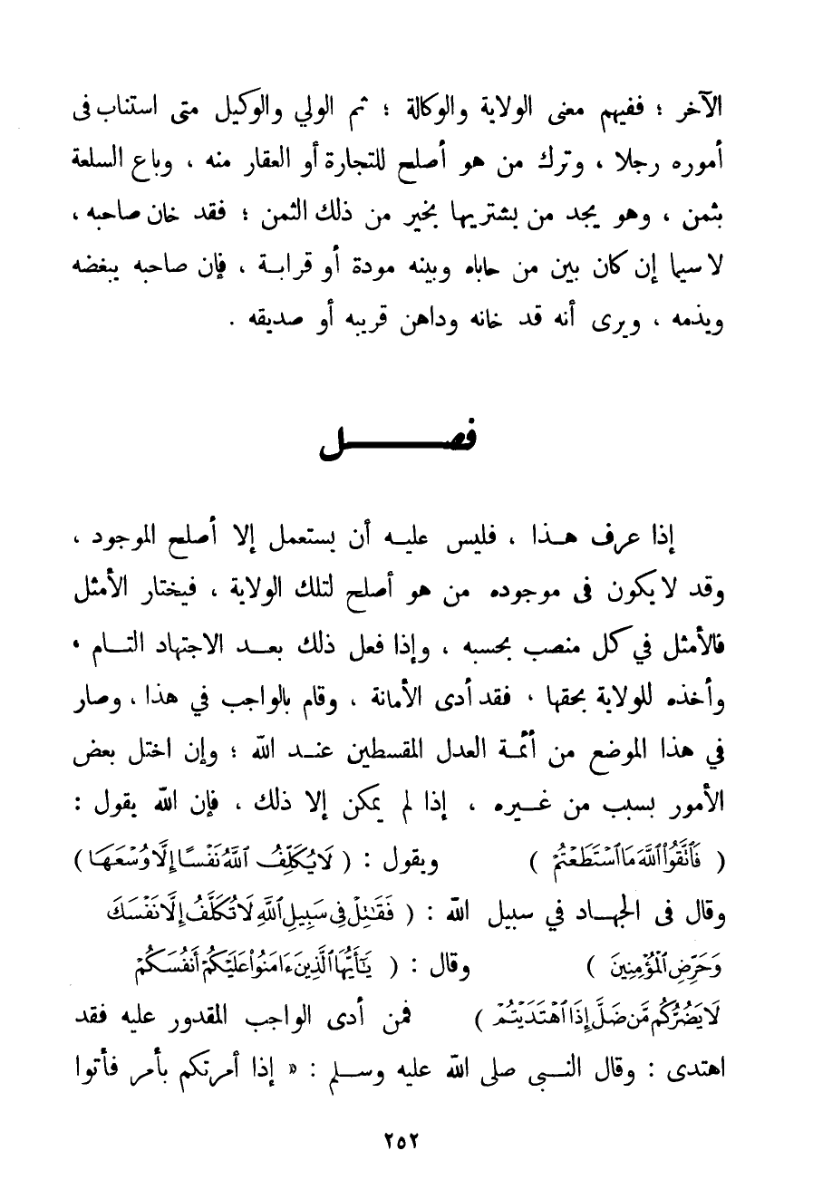 إذَا عُرِفَ هَذَا فَلَيْسَ عَلَيْهِ أَنْ يَسْتَعْمِلَ إلَّا أَصْلَحَ الْمَوْجُودِ وَقَدْ لَا يَكُونُ فِي مَوْجُودِهِ مَنْ هُوَ أَصْلَحُ لِتِلْكَ الْوِلَايَةِ فَيَخْتَارُ الْأَمْثَلَ فَالْأَمْثَلَ فِي كُلِّ مَنْصِبٍ بِحَسْبِهِ وَإِذَا فَعَلَ ذَلِكَ بَعْدَ الِاجْتِهَادِ التَّامِّ وَأَخَذَهُ لِلْوِلَايَةِ بِحَقِّهَا فَقَدْ أَدَّى الْأَمَانَةَ وَقَامَ بِالْوَاجِبِ فِي هَذَا وَصَارَ فِي هَذَا الْمَوْضِعِ مِنْ أَئِمَّةِ الْعَدْلِ الْمُقْسِطِينَ عِنْدَ اللَّهِ؛ وَإِنْ اخْتَلَّ بَعْضُ الْأُمُورِ بِسَبَبِ مِنْ غَيْرِهِ إذَا لَمْ يُمْكِنْ إلَّا ذَلِكَ فَإِنَّ اللَّهَ يَقُولُ: {فَاتَّقُوا اللَّهَ مَا اسْتَطَعْتُمْ} وَيَقُولُ: {لَا يُكَلِّفُ اللَّهُ نَفْسًا إلَّا وُسْعَهَا} وَقَالَ فِي الْجِهَادِ فِي سَبِيلِ اللَّهِ: {فَقَاتِلْ فِي سَبِيلِ اللَّهِ لَا تُكَلَّفُ إلَّا نَفْسَكَ وَحَرِّضِ الْمُؤْمِنِينَ} وَقَالَ: {يَا أَيُّهَا الَّذِينَ آمَنُوا عَلَيْكُمْ أَنْفُسَكُمْ لَا يَضُرُّكُمْ مَنْ ضَلَّ إذَا اهْتَدَيْتُمْ} فَمَنْ أَدَّى الْوَاجِبَ الْمَقْدُورَ عَلَيْهِ فَقَدْ اهْتَدَى: وَقَالَ النَّبِيُّ صَلَّى اللَّهُ عَلَيْهِ وَسَلَّمَ {إذَا أَمَرْتُكُمْ بِأَمْرِ فَأْتُوا