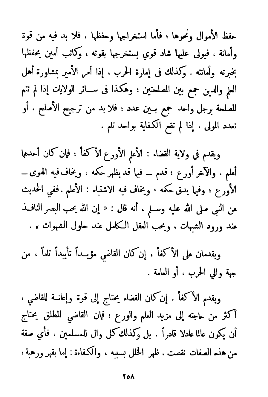 حِفْظِ الْأَمْوَالِ وَنَحْوِهَا؛ فَأَمَّا اسْتِخْرَاجُهَا وَحِفْظُهَا فَلَا بُدَّ فِيهِ مِنْ قُوَّةٍ وَأَمَانَةٍ فَيُوَلَّى عَلَيْهَا شَادٌّ قَوِيٌّ يَسْتَخْرِجُهَا بِقُوَّتِهِ وَكَاتِبٌ أَمِينٌ يَحْفَظُهَا بِخِبْرَتِهِ وَأَمَانَتِهِ. وَكَذَلِكَ فِي إمَارَةِ الْحَرْبِ إذَا أَمَرَ الْأَمِيرُ بِمُشَاوَرَةِ أَهْلِ الْعِلْمِ وَالدِّينِ جَمَعَ بَيْنَ الْمَصْلَحَتَيْنِ؛ وَهَكَذَا فِي سَائِرِ الْوِلَايَاتِ إذَا لَمْ تَتِمَّ الْمَصْلَحَةُ بِرَجُلِ وَاحِدٍ جَمَعَ بَيْنَ عَدَدٍ؛ فَلَا بُدَّ مِنْ تَرْجِيحِ الْأَصْلَحِ أَوْ تَعَدُّدِ الْمَوْلَى إذَا لَمْ تَقَعْ الْكِفَايَةُ بِوَاحِدِ تَامٍّ. وَيُقَدَّمُ فِي وِلَايَةِ الْقَضَاءِ: الْأَعْلَمُ الْأَوْرَعُ الْأَكْفَأُ؛ فَإِنْ كَانَ أَحَدُهُمَا أَعْلَمَ وَالْآخَرُ أَوْرَعَ؛ قُدِّمَ - فِيمَا قَدْ يَظْهَرُ حُكْمُهُ وَيُخَافُ فِيهِ الْهَوَى - الْأَوْرَعُ؛ وَفِيمَا يَدُقُّ حُكْمُهُ وَيُخَافُ فِيهِ الِاشْتِبَاهُ: الْأَعْلَمُ. فَفِي الْحَدِيثِ عَنْ النَّبِيِّ صَلَّى اللَّهُ عَلَيْهِ وَسَلَّمَ أَنَّهُ قَالَ: {إنَّ اللَّهَ يُحِبُّ الْبَصَرَ النَّافِذَ عِنْدَ وُرُودِ الشُّبُهَاتِ وَيُحِبُّ الْعَقْلَ الْكَامِلَ عِنْدَ حُلُولِ الشَّهَوَاتِ} . وَيُقَدَّمَانِ عَلَى الْأَكْفَأِ إنْ كَانَ الْقَاضِي مُؤَيَّدًا تَأْيِيدًا تَامًّا مِنْ جِهَةِ وَالِي الْحَرْبِ أَوْ الْعَامَّةِ. وَيُقَدِّمُ الْأَكْفَأَ. إنْ كَانَ الْقَضَاءُ يَحْتَاجُ إلَى قُوَّةٍ وَإِعَانَةٍ لِلْقَاضِي أَكْثَرَ مِنْ حَاجَتِهِ إلَى مَزِيدِ الْعِلْمِ وَالْوَرَعِ؛ فَإِنَّ الْقَاضِيَ الْمُطْلَقَ يَحْتَاجُ أَنْ يَكُونَ عَالِمًا عَادِلًا قَادِرًا. بَلْ كَذَلِكَ كُلُّ وَالٍ لِلْمُسْلِمِينَ فَأَيُّ صِفَةٍ مِنْ هَذِهِ الصِّفَاتِ نَقَصَتْ ظَهَرَ الْخَلَلُ بِسَبَبِهِ وَالْكَفَاءَةُ: إمَّا بِقَهْرِ وَرَهْبَةٍ،