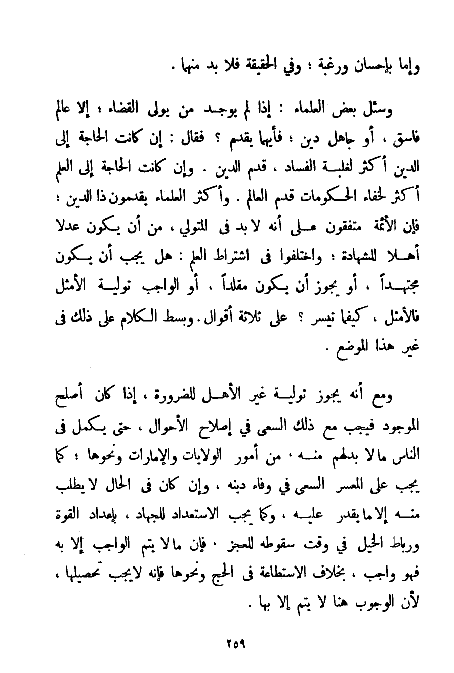 وَإِمَّا بِإِحْسَانِ وَرَغْبَةٍ وَفِي الْحَقِيقَةِ فَلَا بُدَّ مِنْهُمَا. وَسُئِلَ بَعْضُ الْعُلَمَاءِ: إذَا لَمْ يُوجَدْ مَنْ يُوَلَّى الْقَضَاءُ؛ إلَّا عَالِمٌ فَاسِقٌ أَوْ جَاهِلٌ دَيِّنٌ؛ فَأَيُّهُمَا يُقَدَّمُ؟ فَقَالَ: إنْ كَانَتْ الْحَاجَةُ إلَى الدَّيِّنِ أَكْثَرَ لِغَلَبَةِ الْفَسَادِ قُدِّمَ الدَّيِّنُ. وَإِنْ كَانَتْ الْحَاجَةُ إلَى الْعِلْمِ أَكْثَرَ لِخَفَاءِ الْحُكُومَاتِ قُدِّمَ الْعَالِمُ. وَأَكْثَرُ الْعُلَمَاءِ يُقَدِّمُونَ ذَا الدِّينِ؛ فَإِنَّ الْأَئِمَّةَ مُتَّفِقُونَ عَلَى أَنَّهُ لَا بُدَّ فِي الْمُتَوَلِّي مِنْ أَنْ يَكُونَ عَدْلًا أَهْلًا لِلشَّهَادَةِ؛ وَاخْتَلَفُوا فِي اشْتِرَاطِ الْعِلْمِ: هَلْ يَجِبُ أَنْ يَكُونَ مُجْتَهِدًا أَوْ يَجُوزُ أَنْ يَكُونَ مُقَلِّدًا أَوْ الْوَاجِبُ تَوْلِيَةُ الْأَمْثَلِ فَالْأَمْثَلِ كَيْفَمَا تَيَسَّرَ؟ عَلَى ثَلَاثَةِ أَقْوَالٍ. وَبُسِطَ الْكَلَامُ عَلَى ذَلِكَ فِي غَيْرِ هَذَا الْمَوْضِعِ. وَمَعَ أَنَّهُ يَجُوزُ تَوْلِيَةُ غَيْرِ الْأَهْلِ لِلضَّرُورَةِ إذَا كَانَ أَصْلَحَ الْمَوْجُودِ فَيَجِبُ مَعَ ذَلِكَ السَّعْيُ فِي إصْلَاحِ الْأَحْوَالِ حَقًّا يَكْمُلُ فِي النَّاسِ مَا لَا بُدَّ لَهُمْ مِنْهُ مِنْ أُمُورِ الْوِلَايَاتِ وَالْإِمَارَاتِ وَنَحْوِهَا؛ كَمَا يَجِبُ عَلَى الْمُعْسِرِ السَّعْيُ فِي وَفَاءِ دَيْنِهِ وَإِنْ كَانَ فِي الْحَالِ لَا يُطْلَبُ مِنْهُ إلَّا مَا يَقْدِرُ عَلَيْهِ وَكَمَا يَجِبُ الِاسْتِعْدَادُ لِلْجِهَادِ بِإِعْدَادِ الْقُوَّةِ وَرِبَاطِ الْخَيْلِ فِي وَقْتِ سُقُوطِهِ لِلْعَجْزِ فَإِنَّ مَا لَا يَتِمُّ الْوَاجِبُ إلَّا بِهِ فَهُوَ وَاجِبٌ بِخِلَافِ الِاسْتِطَاعَةِ فِي الْحَجِّ وَنَحْوِهَا فَإِنَّهُ لَا يَجِبُ تَحْصِيلُهَا لِأَنَّ الْوُجُوبَ هُنَا لَا يَتِمُّ إلَّا بِهَا.