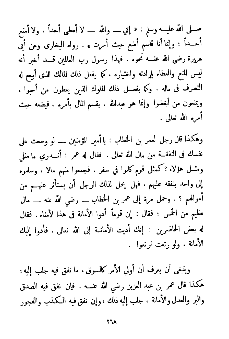 صَلَّى اللَّهُ عَلَيْهِ وَسَلَّمَ {إنِّي - وَاَللَّهِ - لَا أُعْطِي أَحَدًا وَلَا أَمْنَعُ أَحَدًا؛ وَإِنَّمَا أَنَا قَاسِمٌ أَضَعُ حَيْثُ أُمِرْت} . رَوَاهُ الْبُخَارِيُّ وَعَنْ أَبِي هُرَيْرَةَ رَضِيَ اللَّهُ عَنْهُ نَحْوُهُ. فَهَذَا رَسُولُ رَبِّ الْعَالَمِينَ قَدْ أَخْبَرَ أَنَّهُ لَيْسَ الْمَنْعُ وَالْعَطَاءُ بِإِرَادَتِهِ وَاخْتِيَارِهِ كَمَا يَفْعَلُ ذَلِكَ الْمَالِكُ الَّذِي أُبِيحَ لَهُ التَّصَرُّفُ فِي مَالِهِ وَكَمَا يَفْعَلُ ذَلِكَ الْمُلُوكُ الَّذِينَ يُعْطُونَ مَنْ أَحَبُّوا وَيَمْنَعُونَ مَنْ أَبْغَضُوا وَإِنَّمَا هُوَ عَبْدُ اللَّهِ يَقْسِمُ الْمَالَ بِأَمْرِهِ فَيَضَعُهُ حَيْثُ أَمَرَهُ اللَّهُ تَعَالَى. وَهَكَذَا قَالَ رَجُلٌ لِعُمَرِ بْنِ الْخَطَّابِ: يَا أَمِيرَ الْمُؤْمِنِينَ - لَوْ وَسَّعْت عَلَى نَفْسِك فِي النَّفَقَةِ مِنْ مَالِ اللَّهِ تَعَالَى. فَقَالَ لَهُ عُمَرُ: أَتَدْرِي مَا مَثَلِي وَمَثَلُ هَؤُلَاءِ؟ كَمَثَلِ قَوْمٍ كَانُوا فِي سَفَرٍ فَجَمَعُوا مِنْهُمْ مَالًا وَسَلَّمُوهُ إلَى وَاحِدٍ يُنْفِقُهُ عَلَيْهِمْ فَهَلْ يَحِلُّ لِذَلِكَ الرَّجُلِ أَنْ يَسْتَأْثِرَ عَنْهُمْ مِنْ أَمْوَالِهِمْ؟ . وَحُمِلَ مَرَّةً إلَى عُمَرَ بْنِ الْخَطَّابِ - رَضِيَ اللَّهُ عَنْهُ - مَالٌ عَظِيمٌ مِنْ الْخُمُسِ؛ فَقَالَ: إنَّ قَوْمًا أَدَّوْا الْأَمَانَةَ فِي هَذَا لِأُمَنَاءَ. فَقَالَ لَهُ بَعْضُ الْحَاضِرِينَ: إنَّك أَدَّيْت الْأَمَانَةَ إلَى اللَّهِ تَعَالَى فَأَدَّوْا إلَيْك الْأَمَانَةَ وَلَوْ رَتَعْت لَرَتَعُوا. وَيَنْبَغِي أَنْ يَعْرِفَ أَنَّ أُولِي الْأَمْرِ كَالسُّوقِ مَا نَفَقَ فِيهِ جُلِبَ إلَيْهِ؛ هَكَذَا قَالَ عُمَرُ بْنُ عَبْدِ الْعَزِيزِ رَضِيَ اللَّهُ عَنْهُ. فَإِنْ نَفَقَ فِيهِ الصِّدْقُ وَالْبِرُّ وَالْعَدْلُ وَالْأَمَانَةُ جُلِبَ إلَيْهِ ذَلِكَ؛ وَإِنْ نَفَقَ فِيهِ الْكَذِبُ وَالْفُجُورُ