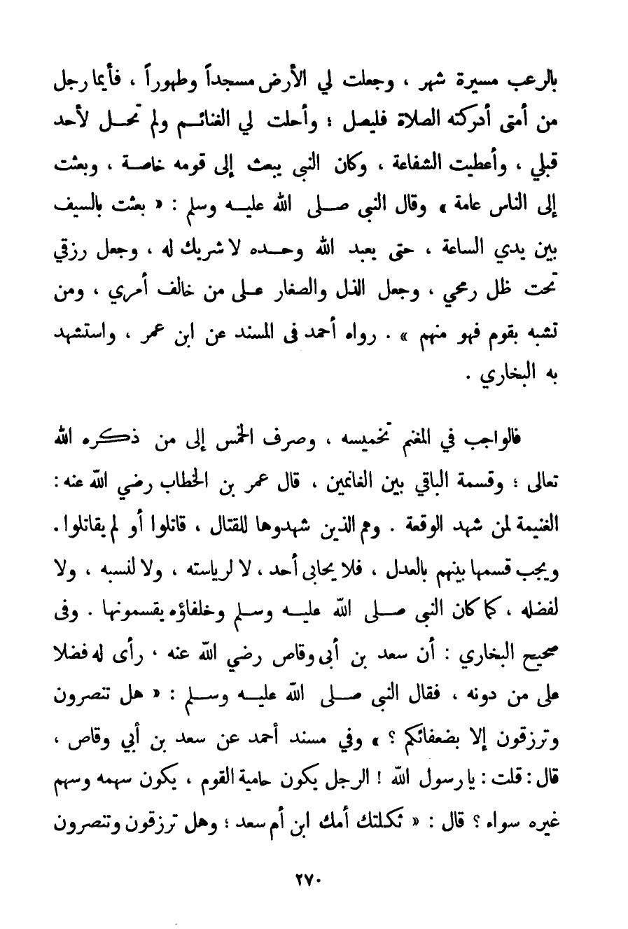 بِالرُّعْبِ مَسِيرَةَ شَهْرٍ وَجُعِلَتْ لِي الْأَرْضُ مَسْجِدًا وَطَهُورًا فَأَيُّمَا رَجُلٍ مِنْ أُمَّتِي أَدْرَكَتْهُ الصَّلَاةُ فَلْيُصَلِّ؛ وَأُحِلَّتْ لِي الْغَنَائِمُ وَلَمْ تَحِلَّ لِأَحَدِ قَبْلِي وَأُعْطِيت الشَّفَاعَةُ وَكَانَ النَّبِيُّ بُعِثَ إلَى قَوْمِهِ خَاصَّةً وَبُعِثْت إلَى النَّاسِ عَامَّةً} وَقَالَ النَّبِيُّ صَلَّى اللَّهُ عَلَيْهِ وَسَلَّمَ {بُعِثْت بِالسَّيْفِ بَيْنَ يَدَيْ السَّاعَةِ حَتَّى يُعْبَدَ اللَّهُ وَحْدَهُ لَا شَرِيكَ لَهُ وَجُعِلَ رِزْقِي تَحْتَ ظِلِّ رُمْحِي وَجُعِلَ الذُّلُّ وَالصَّغَارُ عَلَى مَنْ خَالَفَ أَمْرِي وَمَنْ تَشَبَّهَ بِقَوْمِ فَهُوَ مِنْهُمْ} . رَوَاهُ أَحْمَد فِي الْمُسْنَدِ عَنْ ابْنِ عُمَرَ وَاسْتَشْهَدَ بِهِ الْبُخَارِيُّ. فَالْوَاجِبُ فِي الْمَغْنَمِ تَخْمِيسُهُ وَصَرْفُ الْخُمُسِ إلَى مَنْ ذَكَرَهُ اللَّهُ تَعَالَى؛ وَقِسْمَةُ الْبَاقِي بَيْنَ الْغَانِمِينَ قَالَ عُمَرُ بْنُ الْخَطَّابِ رَضِيَ اللَّهُ عَنْهُ الْغَنِيمَةُ لِمَنْ شَهِدَ الْوَقْعَةَ. وَهُمْ الَّذِينَ شَهِدُوهَا لِلْقِتَالِ قَاتَلُوا أَوْ لَمْ يُقَاتِلُوا. وَيَجِبُ قَسَمُهَا بَيْنَهُمْ بِالْعَدْلِ فَلَا يُحَابَى أَحَدٌ لَا لِرِيَاسَتِهِ وَلَا لِنَسَبِهِ وَلَا لِفَضْلِهِ كَمَا كَانَ النَّبِيُّ صَلَّى اللَّهُ عَلَيْهِ وَسَلَّمَ وَخُلَفَاؤُهُ يَقْسِمُونَهَا. وَفِي صَحِيحِ الْبُخَارِيِّ: {أَنَّ سَعْدَ بْنَ أَبِي وَقَّاصٍ رَضِيَ اللَّهُ عَنْهُ رَأَى لَهُ فَضْلًا عَلَى مَنْ دُونَهُ فَقَالَ النَّبِيُّ صَلَّى اللَّهُ عَلَيْهِ وَسَلَّمَ هَلْ تُنْصَرُونَ وَتُرْزَقُونَ إلَّا بِضُعَفَائِكُمْ؟} وَفِي مُسْنَدِ أَحْمَد {عَنْ سَعْدِ بْنِ أَبِي وَقَّاصٍ قَالَ: قُلْت: يَا رَسُولَ اللَّهِ الرَّجُلُ يَكُونُ حَامِيَةَ الْقَوْمِ يَكُونُ سَهْمُهُ وَسَهْمُ غَيْرِهِ سَوَاءً؟ قَالَ: ثَكِلَتْك أُمُّك ابْنَ أُمِّ سَعْدٍ؛ وَهَلْ تُرْزَقُونَ وَتُنْصَرُونَ