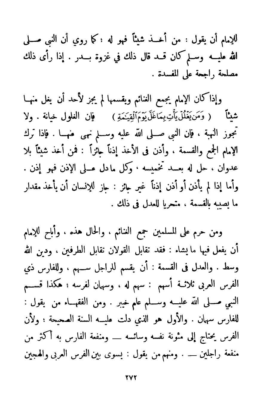 لِلْإِمَامِ أَنْ يَقُولَ: مَنْ أَخَذَ شَيْئًا فَهُوَ لَهُ؛ كَمَا رُوِيَ أَنَّ النَّبِيَّ صَلَّى اللَّهُ عَلَيْهِ وَسَلَّمَ كَانَ قَدْ قَالَ ذَلِكَ فِي غَزْوَةِ بَدْرٍ. إذَا رَأَى ذَلِكَ مَصْلَحَةً رَاجِحَةً عَلَى الْمَفْسَدَةِ. وَإِذَا كَانَ الْإِمَامُ يَجْمَعُ الْغَنَائِمَ وَيَقْسِمُهَا لَمْ يَجُزْ لِأَحَدِ أَنْ يَغُلَّ مِنْهَا شَيْئًا {وَمَنْ يَغْلُلْ يَأْتِ بِمَا غَلَّ يَوْمَ الْقِيَامَةِ} فَإِنَّ الْغُلُولَ خِيَانَةٌ. وَلَا تَجُوزُ النُّهْبَةُ فَإِنَّ النَّبِيَّ صَلَّى اللَّهُ عَلَيْهِ وَسَلَّمَ نَهَى عَنْهَا. فَإِذَا تَرَكَ الْإِمَامُ الْجَمْعَ وَالْقِسْمَةَ وَأَذِنَ فِي الْأَخْذِ إذْنًا جَائِزًا: فَمَنْ أَخَذَ شَيْئًا بِلَا عُدْوَانٍ حَلَّ لَهُ بَعْدَ تَخْمِيسِهِ وَكُلُّ مَا دَلَّ عَلَى الْإِذْنِ فَهُوَ إذْنٌ. وَأَمَّا إذَا لَمْ يَأْذَنْ أَوْ أَذِنَ إذْنًا غَيْرَ جَائِزٍ: جَازَ لِلْإِنْسَانِ أَنْ يَأْخُذَ مِقْدَارَ مَا يُصِيبُهُ بِالْقِسْمَةِ مُتَحَرِّيًا لِلْعَدْلِ فِي ذَلِكَ. وَمَنْ حَرَّمَ عَلَى الْمُسْلِمِينَ جَمْعَ الْغَنَائِمِ وَالْحَالُ هَذِهِ وَأَبَاحَ لِلْإِمَامِ أَنْ يَفْعَلَ فِيهَا ما يَشَاءُ: فَقَدْ تَقَابَلَ الْقَوْلَانِ تَقَابُلَ الطَّرَفَيْنِ وَدِينُ اللَّهِ وَسَطٌ. وَالْعَدْلُ فِي الْقِسْمَةِ: أَنْ يُقْسَمَ لِلرَّاجِلِ سَهْمٌ وَلِلْفَارِسِ ذِي الْفَرَسِ الْعَرَبِيِّ ثَلَاثَةُ أَسْهُمٍ: سَهْمٌ لَهُ وَسَهْمَانِ لِفَرَسِهِ؛ هَكَذَا قَسَمَ النَّبِيُّ صَلَّى اللَّهُ عَلَيْهِ وَسَلَّمَ عَامَ خَيْبَرَ. وَمِنْ الْفُقَهَاءِ مَنْ يَقُولُ: لِلْفَارِسِ سَهْمَانِ. وَالْأَوَّلُ هُوَ الَّذِي دَلَّتْ عَلَيْهِ السُّنَّةُ الصَّحِيحَةُ؛ وَلِأَنَّ الْفَرَسَ يَحْتَاجُ إلَى مَئُونَةِ نَفْسِهِ وَسَائِسِهِ - وَمَنْفَعَةُ الْفَارِسِ بِهِ أَكْثَرُ مِنْ مَنْفَعَةِ رَاجِلِينَ - وَمِنْهُمْ مَنْ يَقُولُ: يُسَوَّى بَيْنَ الْفَرَسِ الْعَرَبِيِّ وَالْهَجِينِ