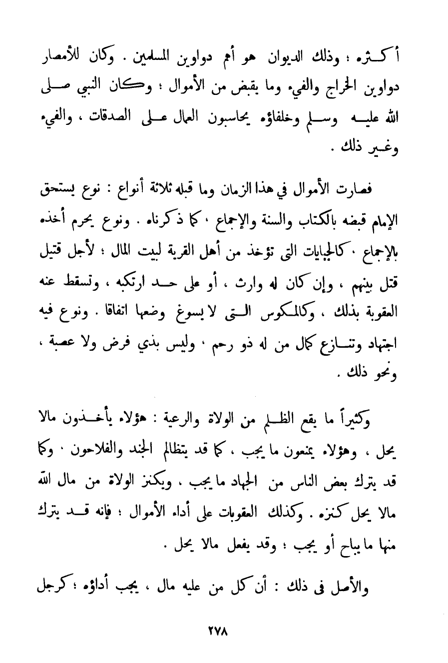 أَكْثَرِهِ؛ وَذَلِكَ الدِّيوَانُ هُوَ أَهَمُّ دَوَاوِينِ الْمُسْلِمِينَ. وَكَانَ لِلْأَمْصَارِ دَوَاوِينُ الْخَرَاجِ وَالْفَيْءِ وَمَا يُقْبَضُ مِنْ الْأَمْوَالِ؛ وَكَانَ النَّبِيُّ صَلَّى اللَّهُ عَلَيْهِ وَسَلَّمَ وَخُلَفَاؤُهُ يُحَاسِبُونَ الْعُمَّالَ عَلَى الصَّدَقَاتِ وَالْفَيْءِ وَغَيْرِ ذَلِكَ. فَصَارَتْ الْأَمْوَالُ فِي هَذَا الزَّمَانِ وَمَا قَبْلَهُ ثَلَاثَةَ أَنْوَاعٍ: نَوْعٌ يَسْتَحِقُّ الْإِمَامُ قَبْضَهُ بِالْكِتَابِ وَالسُّنَّةِ وَالْإِجْمَاعِ كَمَا ذَكَرْنَاهُ وَنَوْعٌ يَحْرُمُ أَخْذُهُ بِالْإِجْمَاعِ كَالْجِبَايَاتِ الَّتِي تُؤْخَذُ مِنْ أَهْلِ الْقَرْيَةِ لِبَيْتِ الْمَالِ؛ لِأَجْلِ قَتِيلٍ قُتِلَ بَيْنَهُمْ وَإِنْ كَانَ لَهُ وَارِثٌ أَوْ عَلَى حَدٍّ ارْتَكَبَهُ وَتَسْقُطُ عَنْهُ الْعُقُوبَةُ بِذَلِكَ وَكَالْمُكُوسِ الَّتِي لَا يَسُوغُ وَضْعُهَا اتِّفَاقًا. وَنَوْعٌ فِيهِ اجْتِهَادٌ وَتَنَازُعٌ كَمَالٍ مَنْ لَهُ ذُو رَحِمٍ وَلَيْسَ بِذِي فَرْضٍ وَلَا عَصَبَةٍ وَنَحْوِ ذَلِكَ. وَكَثِيرًا مَا يَقَعُ الظُّلْمُ مِنْهُ الْوُلَاةُ وَالرَّعِيَّةُ: هَؤُلَاءِ يَأْخُذُونَ مَا لَا يَحِلُّ وَهَؤُلَاءِ يَمْنَعُونَ مَا يَجِبُ كَمَا قَدْ يَتَظَالَمُ الْجُنْدُ وَالْفَلَّاحُونَ. وَكَمَا قَدْ يَتْرُكُ بَعْضُ النَّاسِ مِنْ الْجِهَادِ مَا يَجِبُ وَيَكْنِزُ الْوُلَاةُ مِنْ مَالِ اللَّهِ مَا لَا يَحِلُّ كَنْزُهُ. وَكَذَلِكَ الْعُقُوبَاتُ عَلَى أَدَاءِ الْأَمْوَالِ؛ فَإِنَّهُ قَدْ يَتْرُكُ مِنْهَا مَا يُبَاحُ أَوْ يَجِبُ؛ وَقَدْ يَفْعَلُ مَا لَا يَحِلُّ. وَالْأَصْلُ فِي ذَلِكَ: إنَّ كُلَّ مَنْ عَلَيْهِ مَالٌ يَجِبُ أَدَاؤُهُ؛ كَرَجُلِ
