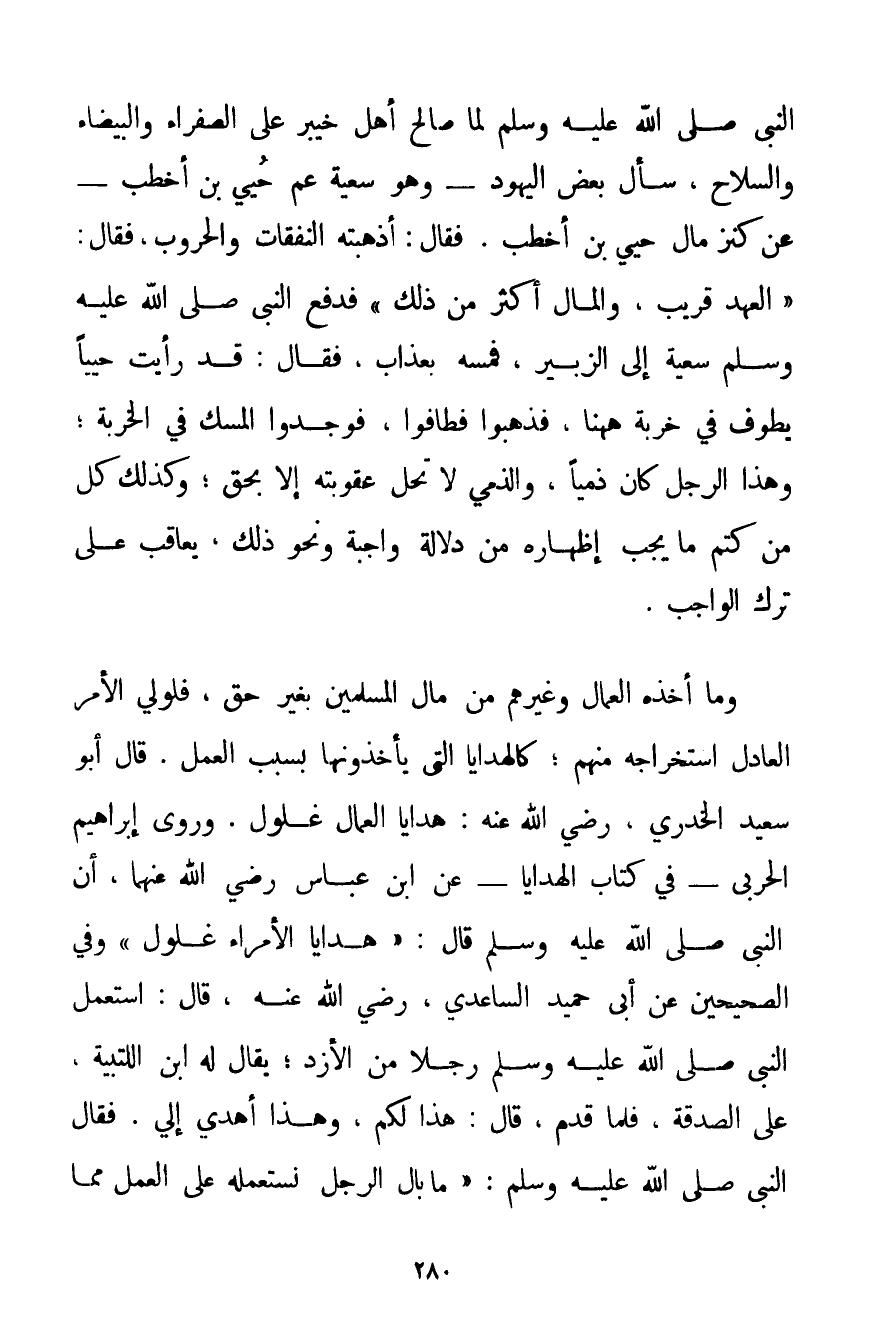 النَّبِيَّ صَلَّى اللَّهُ عَلَيْهِ وَسَلَّمَ لَمَّا صَالَحَ أَهْلَ خَيْبَرَ عَلَى الصَّفْرَاءِ وَالْبَيْضَاءِ وَالسِّلَاحِ سَأَلَ بَعْضَ الْيَهُودِ - وَهُوَ سَعْيَةَ عَمَّ حيي بْنِ أَخْطَبَ - عَنْ كَنْزِ مَالِ حيي بْنِ أَخْطَبَ. فَقَالَ: أَذْهَبَتْهُ النَّفَقَاتُ وَالْحُرُوبُ فَقَالَ: الْعَهْدُ قَرِيبٌ وَالْمَالُ أَكْثَرُ مِنْ ذَلِكَ فَدَفَعَ النَّبِيُّ صَلَّى اللَّهُ عَلَيْهِ وَسَلَّمَ سَعْيَةَ إلَى الزُّبَيْرِ فَمَسَّهُ بِعَذَابِ فَقَالَ: قَدْ رَأَيْت حييا يَطُوفُ فِي خَرِبَةٍ هَهُنَا فَذَهَبُوا فَطَافُوا فَوَجَدُوا الْمِسْكَ فِي الْخَرِبَةِ} وَهَذَا الرَّجُلُ كَانَ ذِمِّيًّا وَالذِّمِّيُّ لَا تَحِلُّ عُقُوبَتُهُ إلَّا بِحَقِّ؛ وَكَذَلِكَ كُلُّ مَنْ كَتَمَ مَا يَجِبُ إظْهَارُهُ مِنْ دَلَالَةٍ وَاجِبَةٍ وَنَحْوِ ذَلِكَ يُعَاقَبُ عَلَى تَرْكِ الْوَاجِبِ. وَمَا أَخَذَهُ الْعُمَّالُ وَغَيْرُهُمْ مِنْ مَالِ الْمُسْلِمِينَ بِغَيْرِ حَقٍّ فَلِوَلِيِّ الْأَمْرِ الْعَادِلِ اسْتِخْرَاجُهُ مِنْهُمْ؛ كَالْهَدَايَا الَّتِي يَأْخُذُونَهَا بِسَبَبِ الْعَمَلِ. قَالَ أَبُو سَعِيدٍ الخدري رَضِيَ اللَّهُ عَنْهُ هَدَايَا الْعُمَّالِ غُلُولٌ. وَرَوَى إبْرَاهِيمُ الْحَرْبِيُّ - فِي كِتَابِ الْهَدَايَا - عَنْ ابْنِ عَبَّاسٍ رَضِيَ اللَّهُ عَنْهُمَا أَنَّ النَّبِيَّ صَلَّى اللَّهُ عَلَيْهِ وَسَلَّمَ قَالَ: {هَدَايَا الْأُمَرَاءِ غُلُولٌ} وَفِي الصَّحِيحَيْنِ {عَنْ أَبِي حميد الساعدي رَضِيَ اللَّهُ عَنْهُ قَالَ: اسْتَعْمَلَ النَّبِيُّ صَلَّى اللَّهُ عَلَيْهِ وَسَلَّمَ رَجُلًا مِنْ الأزد؛ يُقَالُ لَهُ ابْنُ اللتبية عَلَى الصَّدَقَةِ فَلَمَّا قَدِمَ قَالَ: هَذَا لَكُمْ وَهَذَا أُهْدِيَ إلَيَّ. فَقَالَ النَّبِيُّ صَلَّى اللَّهُ عَلَيْهِ وَسَلَّمَ مَا بَالُ الرَّجُلِ نَسْتَعْمِلُهُ عَلَى الْعَمَلِ مِمَّا