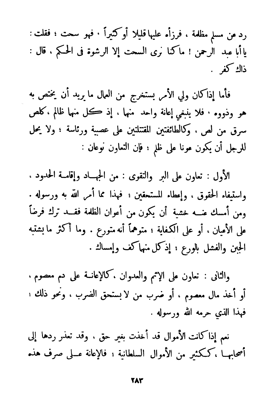 رَدَّ عَنْ مُسْلِمٍ مَظْلِمَةً فَرَزَأَهُ عَلَيْهَا قَلِيلًا أَوْ كَثِيرًا فَهُوَ سُحْتٌ؛ فَقُلْت: يَا أَبَا عَبْدِ الرَّحْمَنِ مَا كُنَّا نَرَى السُّحْتَ إلَّا الرِّشْوَةَ فِي الْحُكْمِ قَالَ: ذَاكَ كُفْرٌ. فَأَمَّا إذَا كَانَ وَلِيُّ الْأَمْرِ يَسْتَخْرِجُ مِنْ الْعُمَّالِ مَا يُرِيدُ أَنْ يَخْتَصَّ بِهِ هُوَ وَذَوُوه فَلَا يَنْبَغِي إعَانَةُ وَاحِدٍ مِنْهُمَا إذْ كُلٌّ مِنْهَا ظَالِمٌ كَلِصِّ سَرَقَ مِنْ لِصّ وَكَالطَّائِفَتَيْن الْمُقْتَتِلَتَيْن عَلَى عَصَبَيْهِ وَرِئَاسَةٍ؛ وَلَا يَحِلُّ لِلرَّجُلِ أَنْ يَكُونَ عَوْنًا عَلَى ظُلْمٍ؛ فَإِنَّ التَّعَاوُنَ نَوْعَانِ: الْأَوَّلُ: تَعَاوُنٌ عَلَى الْبِرِّ وَالتَّقْوَى: مِنْ الْجِهَادِ وَإِقَامَةِ الْحُدُودِ وَاسْتِيفَاءِ الْحُقُوقِ وَإِعْطَاءِ الْمُسْتَحَقِّينَ؛ فَهَذَا مِمَّا أَمَرَ اللَّهُ بِهِ وَرَسُولُهُ. وَمَنْ أَمْسَكَ عَنْهُ خَشْيَةَ أَنْ يَكُونَ مِنْ أَعْوَانِ الظَّلَمَةِ فَقَدْ تَرَكَ فَرْضًا عَلَى الْأَعْيَانِ أَوْ عَلَى الْكِفَايَةِ؛ مُتَوَهِّمًا أَنَّهُ مُتَوَرِّعٌ. وَمَا أَكْثَرَ مَا يَشْتَبِهُ الْجُبْنُ وَالْفَشَلُ بِالْوَرَعِ إذْ كَلٌّ مِنْهُمَا كَفٌّ وَإِمْسَاكٌ. وَالثَّانِي: تَعَاوُنٌ عَلَى الْإِثْمِ وَالْعُدْوَانِ كَالْإِعَانَةِ عَلَى دَمٍ مَعْصُومٍ أَوْ أَخْذِ مَالٍ مَعْصُومٍ أَوْ ضَرْبِ مَنْ لَا يَسْتَحِقُّ الضَّرْبَ وَنَحْوَ ذَلِكَ فَهَذَا الَّذِي حَرَّمَهُ اللَّهُ وَرَسُولُهُ. نَعَمْ إذَا كَانَتْ الْأَمْوَالُ قَدْ أُخِذَتْ بِغَيْرِ حَقٍّ وَقَدْ تَعَذَّرَ رَدُّهَا إلَى أَصْحَابِهَا كَكَثِيرِ مِنْ الْأَمْوَالِ السُّلْطَانِيَّةِ؛ فَالْإِعَانَةُ عَلَى صَرْفِ هَذِهِ