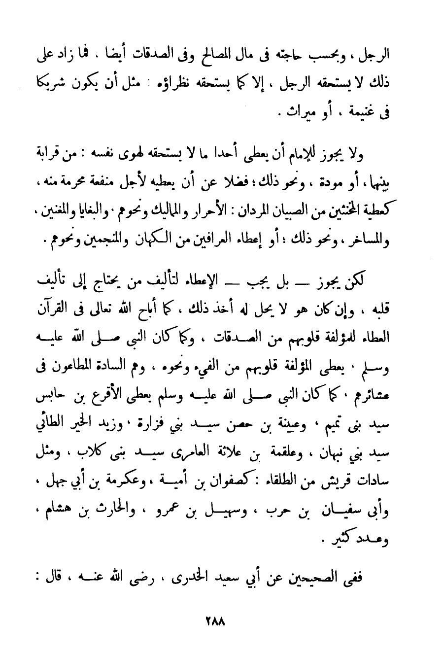 الرَّجُلِ وَبِحَسَبِ حَاجَتِهِ فِي مَالِ الْمَصَالِحِ وَفِي الصَّدَقَاتِ أَيْضًا فَمَا زَادَ عَلَى ذَلِكَ لَا يَسْتَحِقُّهُ الرَّجُلُ إلَّا كَمَا يَسْتَحِقُّهُ نُظَرَاؤُهُ مِثْلَ أَنْ يَكُونَ شَرِيكًا فِي غَنِيمَةٍ أَوْ مِيرَاثٍ. وَلَا يَجُوزُ لِلْإِمَامِ أَنْ يُعْطِيَ أَحَدًا مَا لَا يَسْتَحِقُّهُ لِهَوَى نَفْسِهِ: مِنْ قَرَابَةٍ بَيْنَهُمَا أَوْ مَوَدَّةٍ وَنَحْوِ ذَلِكَ؛ فَضْلًا عَنْ أَنْ يُعْطِيَهُ لِأَجْلِ مَنْفَعَةٍ مُحَرَّمَةٍ مِنْهُ كَعَطِيَّةِ الْمُخَنَّثِينَ مِنْ الصِّبْيَانِ المردان: الْأَحْرَارِ وَالْمَمَالِيكِ وَنَحْوِهِمْ وَالْبَغَايَا وَالْمُغَنِّينَ وَالْمَسَاخِرِ وَنَحْوِ ذَلِكَ؛ أَوْ إعْطَاءِ الْعَرَّافِينَ مِنْ الْكُهَّانِ وَالْمُنَجِّمِينَ وَنَحْوِهِمْ. لَكِنْ يَجُوزُ - بَلْ يَجِبُ - الْإِعْطَاءُ لِتَأْلِيفِ مَنْ يَحْتَاجُ إلَى تَأْلِيفِ قَلْبِهِ وَإِنْ كَانَ هُوَ لَا يَحِلُّ لَهُ أَخْذُ ذَلِكَ كَمَا أَبَاحَ اللَّهُ تَعَالَى فِي الْقُرْآنِ الْعَطَاءَ لِلْمُؤَلَّفَةِ قُلُوبُهُمْ مِنْ الصَّدَقَاتِ وَكَمَا كَانَ النَّبِيُّ صَلَّى اللَّهُ عَلَيْهِ وَسَلَّمَ يُعْطِي الْمُؤَلَّفَةَ قُلُوبُهُمْ مِنْ الْفَيْءِ وَنَحْوِهِ وَهُمْ السَّادَةُ الْمُطَاعُونَ فِي عَشَائِرِهِمْ كَمَا كَانَ النَّبِيُّ صَلَّى اللَّهُ عَلَيْهِ وَسَلَّمَ يُعْطِي الْأَقْرَعَ بْنَ حَابِسٍ سَيِّدَ بَنِي تَمِيمٍ وعُيَيْنَة بْنَ حِصْنٍ سَيِّدَ بَنِي فَزَارَةَ وَزَيْدَ الْخَيْرِ الطَّائِيَّ سَيِّدَ بَنِي نَبْهَانَ وَعَلْقَمَةَ بْنَ عُلَاثَةَ الْعَامِرِيَّ سَيِّدَ بَنِي كِلَابٍ وَمِثْلَ سَادَاتِ قُرَيْشٍ مِنْ الطُّلَقَاءِ: كَصَفْوَانَ بْنِ أُمَيَّةَ وَعِكْرِمَةَ بْنِ أَبِي جَهْلٍ وَأَبِي سُفْيَانَ بْنِ حَرْبٍ وَسُهَيْلِ بْنِ عَمْرٍو وَالْحَارِثِ بْنِ هِشَامٍ وَعَدَدٍ كَثِيرٍ. فَفِي الصَّحِيحَيْنِ عَنْ أَبِي سَعِيدٍ الخدري رَضِيَ اللَّهُ عَنْهُ قَالَ: