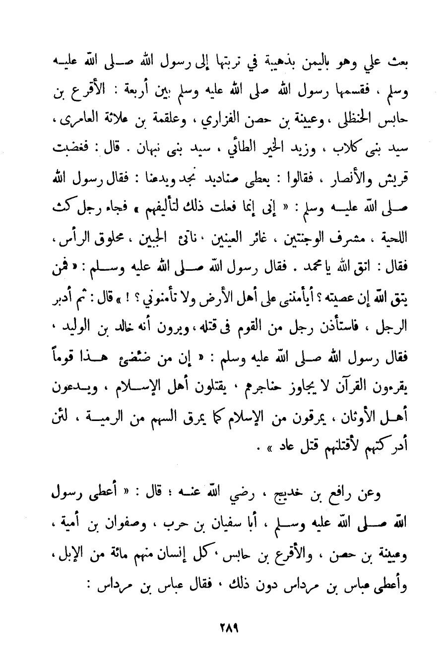 {بَعَثَ عَلِيٌّ وَهُوَ بِالْيَمَنِ بِذُهَيْبَةِ فِي تُرْبَتِهَا إلَى رَسُولِ اللَّهِ صَلَّى اللَّهُ عَلَيْهِ وَسَلَّمَ فَقَسَمَهَا رَسُولُ اللَّهِ صَلَّى اللَّهُ عَلَيْهِ وَسَلَّمَ بَيْنَ أَرْبَعَةٍ: الْأَقْرَعِ بْنِ حَابِسٍ الحنظلي وعُيَيْنَة بْنِ حِصْنٍ الفزاري وَعَلْقَمَةَ بْنِ عُلَاثَةَ الْعَامِرِيِّ سَيِّدِ بَنِي كِلَابٍ وَزَيْدِ الْخَيْرِ الطَّائِيِّ سَيِّدِ بَنِي نَبْهَانَ. قَالَ: فَغَضِبَتْ قُرَيْشٌ وَالْأَنْصَارُ فَقَالُوا: يُعْطِي صَنَادِيدَ نَجْدٍ وَيَدَعُنَا: فَقَالَ رَسُولُ اللَّهِ صَلَّى اللَّهُ عَلَيْهِ وَسَلَّمَ إنِّي إنَّمَا فَعَلْت ذَلِكَ لِتَأْلِيفِهِمْ فَجَاءَ رَجُلٌ كَثُّ اللِّحْيَةِ مُشْرِفُ الْوَجْنَتَيْنِ غَائِرُ الْعَيْنَيْنِ نَاتِئُ الْجَبِينِ مَحْلُوقُ الرَّأْسِ فَقَالَ: اتَّقِ اللَّهَ يَا مُحَمَّدُ. فَقَالَ رَسُولُ اللَّهِ صَلَّى اللَّهُ عَلَيْهِ وَسَلَّمَ فَمَنْ يَتَّقِ اللَّهَ إنْ عَصَيْته؟ أَيَأْمَنُنِي عَلَى أَهْلِ الْأَرْضِ وَلَا تَأْمَنُونِي قَالَ: ثُمَّ أَدْبَرَ الرِّجْلُ فَاسْتَأْذَنَ رَجُلٌ مِنْ الْقَوْمِ فِي قَتْلِهِ وَيَرَوْنَ أَنَّهُ خَالِدُ بْنُ الْوَلِيدِ فَقَالَ رَسُولُ اللَّهِ صَلَّى اللَّهُ عَلَيْهِ وَسَلَّمَ إنَّ مِنْ ضئضئ هَذَا قَوْمًا يَقْرَءُونَ الْقُرْآنَ لَا يُجَاوِزُ حَنَاجِرَهُمْ يَقْتُلُونَ أَهْلَ الْإِسْلَامِ وَيَدَعُونَ أَهْلَ الْأَوْثَانِ يَمْرُقُونَ مِنْ الْإِسْلَامِ كَمَا يَمْرُقُ السَّهْمُ مِنْ الرَّمِيَّةِ لَئِنْ أَدْرَكْتهمْ لَأَقْتُلَنَّهُمْ قَتْلَ عَادٍ} . وَعَنْ رَافِعِ بْنِ خَدِيجٍ رَضِيَ اللَّهُ عَنْهُ قَالَ: {أَعْطَى رَسُولُ اللَّهِ صَلَّى اللَّهُ عَلَيْهِ وَسَلَّمَ أَبَا سُفْيَانَ بْنَ حَرْبٍ وَصَفْوَانَ بْنَ أُمَيَّةَ وعُيَيْنَة بْنَ حِصْنٍ وَالْأَقْرَعَ بْنَ حَابِسٍ كُلُّ إنْسَانٍ مِنْهُمْ مِائَةً مِنْ الْإِبِلِ وَأَعْطَى عَبَّاسَ بْنَ مِرْدَاسٍ دُونَ ذَلِكَ فَقَالَ عَبَّاسُ بْنُ مِرْدَاسٍ: