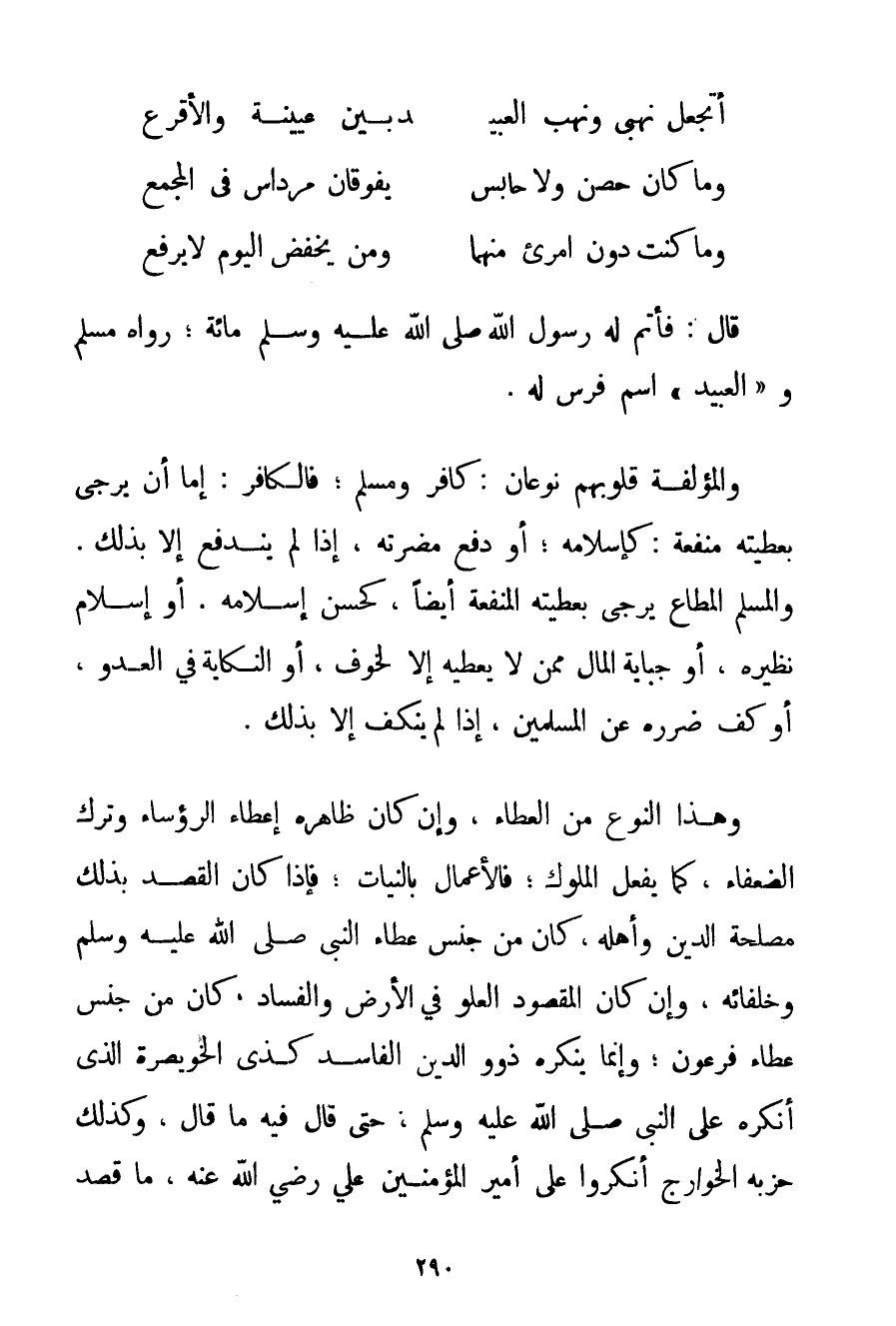 وَالْمُؤَلَّفَةُ قُلُوبُهُمْ نَوْعَانِ: كَافِرٌ وَمُسْلِمٌ. فَالْكَافِرُ: إمَّا أَنْ يُرْجَى بِعَطِيَّتِهِ مَنْفَعَةٌ: كَإِسْلَامِهِ؛ أَوْ دَفْعُ مَضَرَّتِهِ إذَا لَمْ يَنْدَفِعْ إلَّا بِذَلِكَ. وَالْمُسْلِمُ الْمُطَاعُ يُرْجَى. بِعَطِيَّتِهِ الْمَنْفَعَةُ أَيْضًا كَحُسْنِ إسْلَامِهِ. أَوْ إسْلَامُ نَظِيرِهِ أَوْ جِبَايَةُ الْمَالِ مِمَّنْ لَا يُعْطِيهِ إلَّا لِخَوْفِ أَوْ النِّكَايَةِ فِي الْعَدُوِّ. أَوْ كَفُّ ضَرَرِهِ عَنْ الْمُسْلِمِينَ إذَا لَمْ يَنْكَفَّ إلَّا بِذَلِكَ. وَهَذَا النَّوْعُ مِنْ الْعَطَاءِ وَإِنْ كَانَ ظَاهِرُهُ إعْطَاءَ الرُّؤَسَاءِ وَتَرْكُ الضُّعَفَاءِ كَمَا يَفْعَلُ الْمُلُوكُ؛ فَالْأَعْمَالُ بِالنِّيَّاتِ؛ فَإِذَا كَانَ الْقَصْدُ بِذَلِكَ مَصْلَحَةَ الدِّينِ وَأَهْلِهِ كَانَ مِنْ جِنْسِ عَطَاءِ النَّبِيِّ صَلَّى اللَّهُ عَلَيْهِ وَسَلَّمَ وَخُلَفَائِهِ وَإِنْ كَانَ الْمَقْصُودُ الْعُلُوَّ فِي الْأَرْضِ وَالْفَسَادَ كَانَ مِنْ جِنْسِ عَطَاءِ فِرْعَوْنَ؛ وَإِنَّمَا يُنْكِرُهُ ذَوُو الدِّينِ الْفَاسِدِ كَذِي الخويصرة الَّذِي أَنْكَرَهُ عَلَى النَّبِيِّ صَلَّى اللَّهُ عَلَيْهِ وَسَلَّمَ حَتَّى قَالَ فِيهِ مَا قَالَ وَكَذَلِكَ حِزْبُهُ الْخَوَارِجُ أَنْكَرُوا عَلَى أَمِيرِ الْمُؤْمِنِينَ عَلِيٍّ رَضِيَ اللَّهُ عَنْهُ مَا قَصَدَ