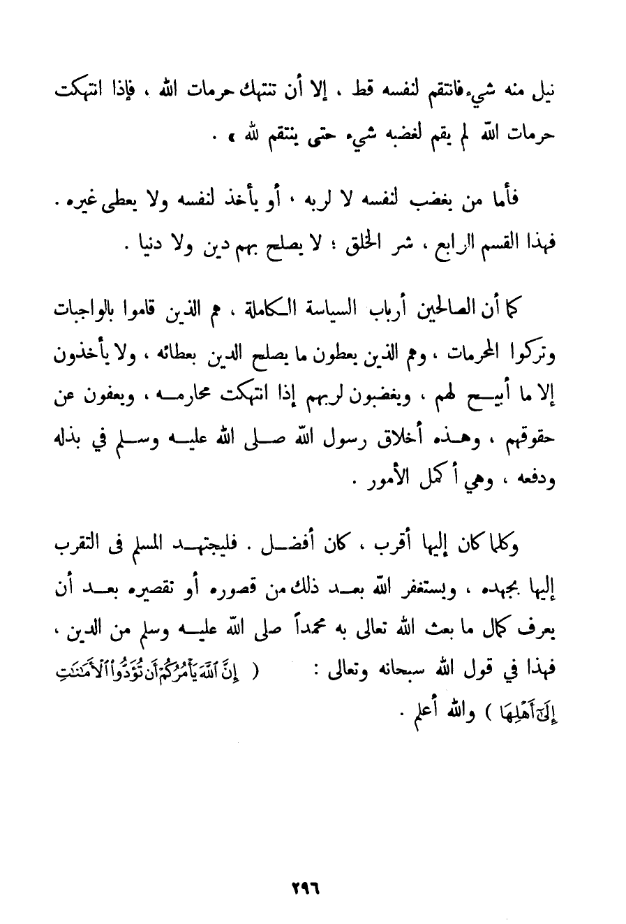 نِيلَ مِنْهُ شَيْءٌ فَانْتَقَمَ لِنَفْسِهِ قَطُّ إلَّا أَنْ تُنْتَهَكَ حُرُمَاتُ اللَّهِ فَإِذَا اُنْتُهِكَتْ حُرُمَاتُ اللَّهِ لَمْ يَقُمْ لِغَضَبِهِ شَيْءٌ حَتَّى يَنْتَقِمَ لِلَّهِ} . فَأَمَّا مَنْ يَغْضَبُ لِنَفْسِهِ لَا لِرَبِّهِ أَوْ يَأْخُذُ لِنَفْسِهِ وَلَا يُعْطِي غَيْرَهُ. فَهَذَا الْقِسْمُ الرَّابِعُ شَرُّ الْحَلْقِ؛ لَا يَصْلُحُ بِهِمْ دِينٌ وَلَا دُنْيَا. كَمَا أَنَّ الصَّالِحِينَ أَرْبَابُ السِّيَاسَةِ الْكَامِلَةِ هُمْ الَّذِينَ قَامُوا بِالْوَاجِبَاتِ وَتَرَكُوا الْحُرُمَاتِ وَهُمْ الَّذِينَ يُعْطُونَ مَا يُصْلِحُ الدِّينَ بِعَطَائِهِ وَلَا يَأْخُذُونَ إلَّا مَا أُبِيحَ لَهُمْ وَيَغْضَبُونَ لِرَبِّهِمْ إذَا اُنْتُهِكَتْ مَحَارِمُهُ وَيَعْفُونَ عَنْ حُقُوقِهِمْ وَهَذِهِ أَخْلَاقُ رَسُولِ اللَّهِ صَلَّى اللَّهُ عَلَيْهِ وَسَلَّمَ فِي بَذْلِهِ وَدَفْعِهِ وَهِيَ أَكْمَلُ الْأُمُورِ. وَكُلَّمَا كَانَ إلَيْهَا أَقْرَبُ كَانَ أَفْضَلَ. فَلْيَجْتَهِدْ الْمُسْلِمُ فِي التَّقَرُّبِ إلَيْهَا بِجُهْدِهِ وَيَسْتَغْفِرُ اللَّهَ بَعْدَ ذَلِكَ مِنْ قُصُورٍ. أَوْ تَقْصِيرِهِ بَعْدَ أَنْ يَعْرِفَ كَمَالَ مَا بَعَثَ اللَّهُ تَعَالَى بِهِ مُحَمَّدًا صَلَّى اللَّهُ عَلَيْهِ وَسَلَّمَ مِنْ الدِّينِ فَهَذَا فِي قَوْلِ اللَّهِ سُبْحَانَهُ وَتَعَالَى: {إنَّ اللَّهَ يَأْمُرُكُمْ أَنْ تُؤَدُّوا الْأَمَانَاتِ إلَى أَهْلِهَا} وَاَللَّهُ أَعْلَمُ.