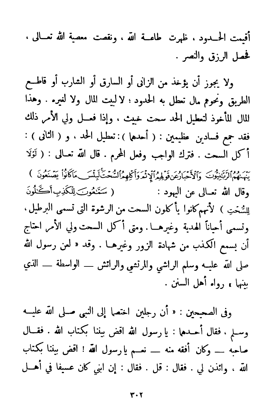 أَحَدُهُمَا: تَعْطِيلُ الْحَدِّ وَالثَّانِي: أَكْلُ السُّحْتِ. فَتَرْكُ الْوَاجِبِ وَفِعْلُ الْمُحَرَّمِ. قَالَ اللَّهُ تَعَالَى: {لَوْلَا يَنْهَاهُمُ الرَّبَّانِيُّونَ وَالْأَحْبَارُ عَنْ قَوْلِهِمُ الْإِثْمَ وَأَكْلِهِمُ السُّحْتَ لَبِئْسَ مَا كَانُوا يَصْنَعُونَ} وَقَالَ اللَّهُ تَعَالَى عَنْ الْيَهُودِ: {سَمَّاعُونَ لِلْكَذِبِ أَكَّالُونَ لِلسُّحْتِ} لِأَنَّهُمْ كَانُوا يَأْكُلُونَ السُّحْتَ مِنْ الرِّشْوَةِ الَّتِي تُسَمَّى الْبِرْطِيلَ وَتُسَمَّى أَحْيَانًا الْهَدِيَّةَ وَغَيْرَهَا. وَمَتَى أَكَلَ السُّحْتَ وَلِيُّ الْأَمْرِ احْتَاجَ أَنْ يَسْمَعَ الْكَذِبَ مِنْ شَهَادَةِ الزُّورِ وَغَيْرِهَا. وَقَدْ {لَعَنَ رَسُولُ اللَّهِ صَلَّى اللَّهُ عَلَيْهِ وَسَلَّمَ الرَّاشِيَ وَالْمُرْتَشِيَ وَالرَّائِشَ - الْوَاسِطَةُ - الَّذِي بَيْنَهُمَا} رَوَاهُ أَهْلُ السُّنَنِ. وَفِي الصَّحِيحَيْنِ: {أَنَّ رَجُلَيْنِ اخْتَصَمَا إلَى النَّبِيِّ صَلَّى اللَّهُ عَلَيْهِ وَسَلَّمَ فَقَالَ أَحَدُهُمَا: يَا رَسُولَ اللَّهِ اقْضِ بَيْنَنَا بِكِتَابِ اللَّهِ. فَقَالَ صَاحِبُهُ - وَكَانَ أَفْقَهَ مِنْهُ - نَعَمْ يَا رَسُولَ اللَّهِ اقْضِ بَيْنَنَا بِكِتَابِ اللَّهِ وائذن لِي. فَقَالَ: قُلْ. فَقَالَ: إنَّ ابْنِي كَانَ عَسِيفًا فِي أَهْلِ