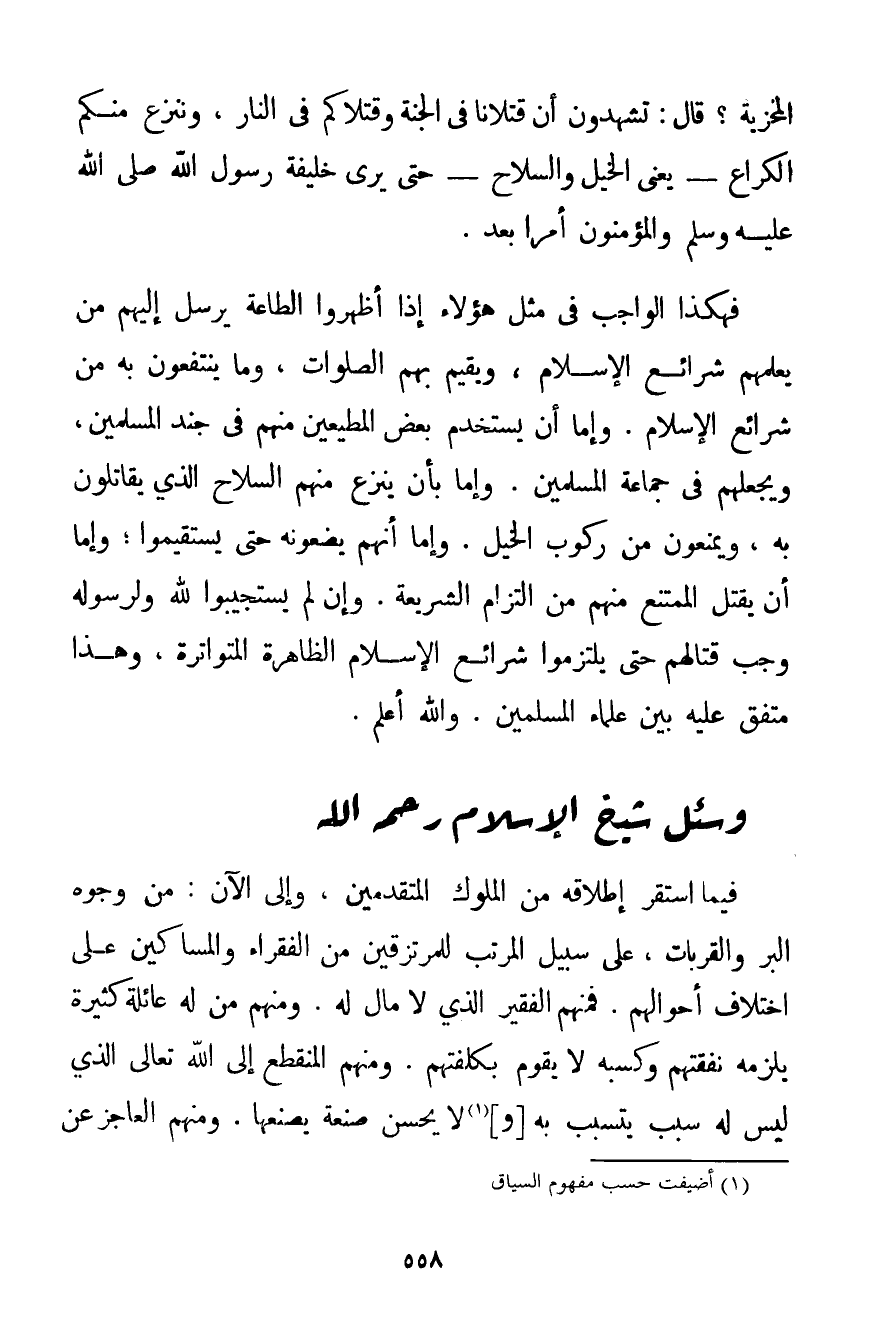 الْمُخْزِيَةُ؟ قَالَ: تَشْهَدُونَ أَنَّ قَتْلَانَا فِي الْجَنَّةِ وَقَتْلَاكُمْ فِي النَّارِ وَنَنْزِعُ مِنْكُمْ الْكُرَاعَ - يَعْنِي الْخَيْلَ وَالسِّلَاحَ - حَتَّى يَرَى خَلِيفَةُ رَسُولِ اللَّهِ صَلَّى اللَّهُ عَلَيْهِ وَسَلَّمَ وَالْمُؤْمِنُونَ أَمْرًا بَعْدُ. فَهَكَذَا الْوَاجِبُ فِي مِثْلِ هَؤُلَاءِ إذَا أَظْهَرُوا الطَّاعَةَ يُرْسَلُ إلَيْهِمْ مَنْ يُعَلِّمُهُمْ شَرَائِعَ الْإِسْلَامِ وَيُقِيمُ بِهِمْ الصَّلَوَاتِ وَمَا يَنْتَفِعُونَ بِهِ مِنْ شَرَائِعِ الْإِسْلَامِ. وَإِمَّا أَنْ يَسْتَخْدِمَ بَعْضُ الْمُطِيعِينَ مِنْهُمْ فِي جُنْدِ الْمُسْلِمِينَ وَيَجْعَلُهُمْ فِي جَمَاعَةِ الْمُسْلِمِينَ. وَإِمَّا بِأَنْ يَنْزِعَ مِنْهُمْ السِّلَاحَ الَّذِي يُقَاتِلُونَ بِهِ وَيُمْنَعُونَ مِنْ رُكُوبِ الْخَيْلِ. وَإِمَّا أَنَّهُمْ يَضَعُوهُ حَتَّى يَسْتَقِيمُوا؛ وَإِمَّا أَنْ يُقْتَلَ الْمُمْتَنِعُ مِنْهُمْ مِنْ الْتِزَامِ الشَّرِيعَةِ. وَإِنْ لَمْ يَسْتَجِيبُوا لِلَّهِ وَلِرَسُولِهِ وَجَبَ قِتَالُهُمْ حَتَّى يَلْتَزِمُوا شَرَائِعَ الْإِسْلَامِ الظَّاهِرَةَ الْمُتَوَاتِرَةَ وَهَذَا مُتَّفَقٌ عَلَيْهِ بَيْنَ عُلَمَاءِ الْمُسْلِمِينَ. وَاَللَّهُ أَعْلَمُ.