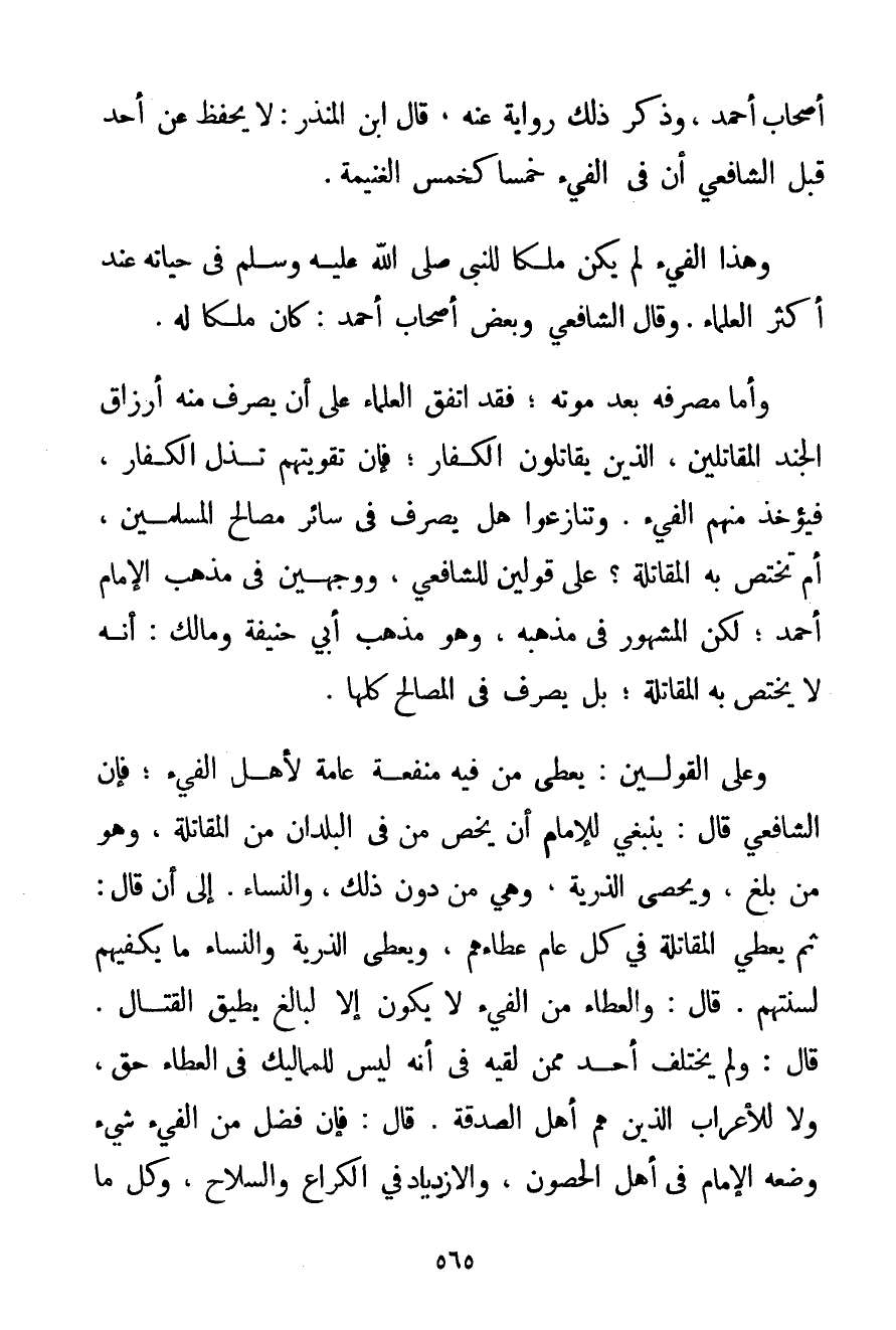 أَصْحَابِ أَحْمَد وَذَكَرَ ذَلِكَ رِوَايَةً عَنْهُ قَالَ ابْنُ الْمُنْذِرِ: لَا يُحْفَظُ عَنْ أَحَدٍ قَبْلَ الشَّافِعِيِّ أَنَّ فِي الْفَيْءِ خُمُسًا كَخُمُسِ الْغَنِيمَةِ. وَهَذَا الْفَيْءُ لَمْ يَكُنْ مِلْكًا لِلنَّبِيِّ صَلَّى اللَّهُ عَلَيْهِ وَسَلَّمَ فِي حَيَاتِهِ عِنْدَ أَكْثَرِ الْعُلَمَاءِ. وَقَالَ الشَّافِعِيُّ وَبَعْضُ أَصْحَابِ أَحْمَد: كَانَ مِلْكًا لَهُ. وَأَمَّا مَصْرِفُهُ بَعْدَ مَوْتِهِ؛ فَقَدْ اتَّفَقَ الْعُلَمَاءُ عَلَى أَنْ يَصْرِفَ مِنْهُ أَرْزَاقَ الْجُنْدِ الْمُقَاتِلِينَ الَّذِينَ يُقَاتِلُونَ الْكُفَّارَ؛ فَإِنَّ تَقْوِيَتَهُمْ تُذِلُّ الْكُفَّارَ فَيُؤْخَذُ مِنْهُمْ الْفَيْءُ. وَتَنَازَعُوا هَلْ يُصْرَفُ فِي سَائِرِ مَصَالِحِ الْمُسْلِمِينَ أَمْ تُخْتَصُّ بِهِ الْمُقَاتِلَةُ؟ عَلَى قَوْلَيْنِ لِلشَّافِعِيِّ وَوَجْهَيْنِ فِي مَذْهَبِ الْإِمَامِ أَحْمَد؛ لَكِنَّ الْمَشْهُورَ فِي مَذْهَبِهِ وَهُوَ مَذْهَبُ أَبِي حَنِيفَةَ وَمَالِكٍ: أَنَّهُ لَا يُخْتَصُّ بِهِ الْمُقَاتِلَةُ؛ بَلْ يُصْرَفُ فِي الْمَصَالِحِ كُلِّهَا. وَعَلَى الْقَوْلَيْنِ: يُعْطَى مَنْ فِيهِ مَنْفَعَةٌ عَامَّةٌ لِأَهْلِ الْفَيْءِ؛ فَإِنَّ الشَّافِعِيَّ قَالَ: يَنْبَغِي لِلْإِمَامِ أَنْ يَخُصَّ مَنْ فِي الْبُلْدَانِ مِنْ الْمُقَاتِلَةِ وَهُوَ مَنْ بَلَغَ وَيُحْصِي الذَّرِّيَّةَ وَهِيَ مِنْ دُونِ ذَلِكَ وَالنِّسَاءَ. إلَى أَنْ قَالَ: ثُمَّ يُعْطِي الْمُقَاتِلَةَ فِي كُلِّ عَامٍ عَطَاءَهُمْ وَيُعْطِي الذُّرِّيَّةَ وَالنِّسَاءَ مَا يَكْفِيهِمْ لِسَنَتِهِمْ. قَالَ: وَالْعَطَاءُ مِنْ الْفَيْءِ لَا يَكُونُ إلَّا لِبَالِغِ يُطِيقُ الْقِتَالَ. قَالَ: وَلَمْ يَخْتَلِفْ أَحَدٌ مِمَّنْ لَقِيَهُ فِي أَنَّهُ لَيْسَ لِلْمَمَالِيكِ فِي الْعَطَاءِ حَقٌّ وَلَا لِلْأَعْرَابِ الَّذِينَ هُمْ أَهْلُ الصَّدَقَةِ. قَالَ: فَإِنْ فَضَلَ مِنْ الْفَيْءِ شَيْءٌ وَضَعَهُ الْإِمَامُ فِي أَهْلِ الْحُصُونِ وَالِازْدِيَادِ فِي الْكُرَاعِ وَالسِّلَاحِ وَكُلِّ مَا