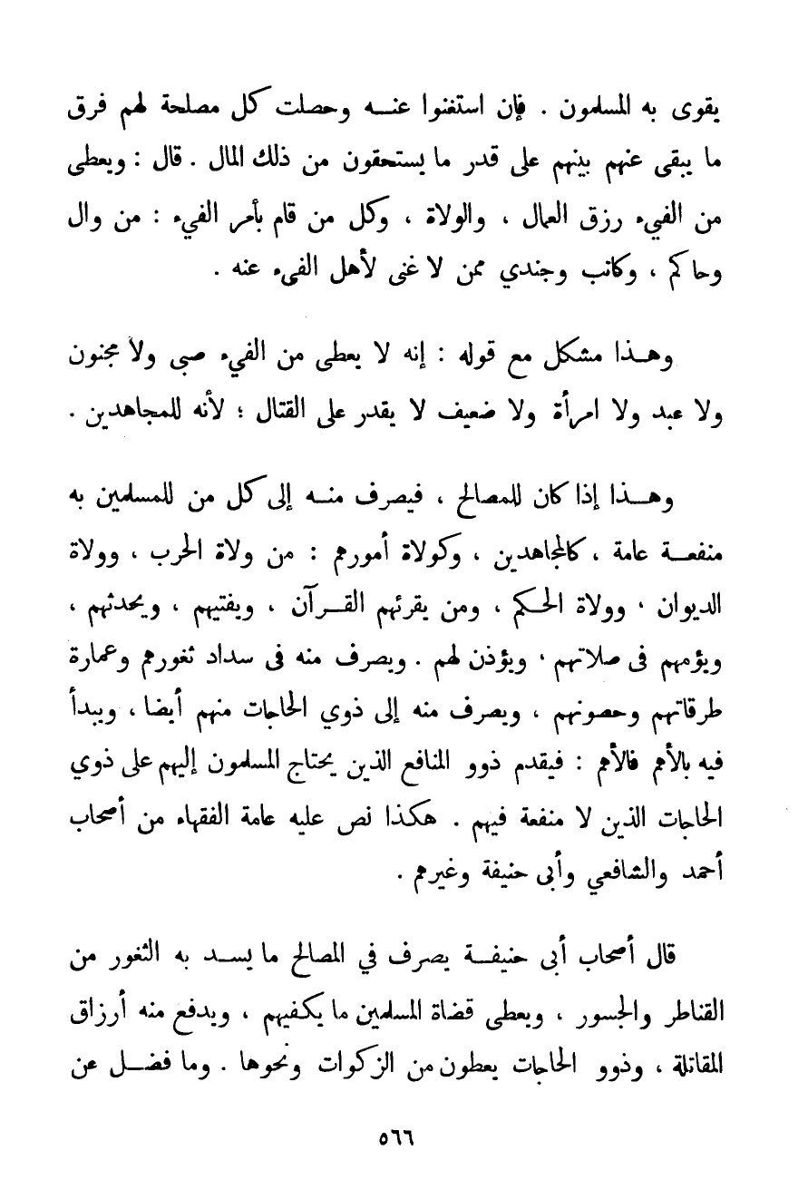 يَقْوَى بِهِ الْمُسْلِمُونَ. فَإِنْ اسْتَغْنَوْا عَنْهُ وَحَصَلَتْ كُلُّ مَصْلَحَةٍ لَهُمْ فَرَّقَ مَا يَبْقَى عَنْهُمْ بَيْنَهُمْ عَلَى قَدْرِ مَا يَسْتَحِقُّونَ مِنْ ذَلِكَ الْمَالِ. قَالَ: وَيُعْطِي مِنْ الْفَيْءِ رِزْقَ الْعُمَّالِ وَالْوُلَاةِ وَكُلَّ مَنْ قَامَ بِأَمْرِ الْفَيْءِ: مِنْ وَالٍ وَحَاكِمٍ وَكَاتِبٍ وَجُنْدِيٍّ مِمَّنْ لَا غِنَى لِأَهْلِ الْفَيْءِ عَنْهُ. وَهَذَا مُشْكِلٌ مَعَ قَوْلِهِ: إنَّهُ لَا يُعْطَى مِنْ الْفَيْءِ صَبِيٌّ وَلَا مَجْنُونٌ وَلَا عَبْدٌ وَلَا امْرَأَةٌ وَلَا ضَعِيفٌ لَا يَقْدِرُ عَلَى الْقِتَالِ؛ لِأَنَّهُ لِلْمُجَاهِدِينَ. وَهَذَا إذَا كَانَ لِلْمَصَالِحِ فَيَصْرِفُ مِنْهُ إلَى كُلِّ مَنْ لِلْمُسْلِمِينَ بِهِ مَنْفَعَةٌ عَامَّةٌ كَالْمُجَاهِدِينَ وَكَوُلَاةِ أُمُورِهِمْ: مِنْ وُلَاةِ الْحَرْبِ وَوُلَاةِ الدِّيوَانِ وَوُلَاةِ الْحُكْمِ وَمَنْ يُقْرِئُهُمْ الْقُرْآنَ وَيُفْتِيهِمْ وَيُحَدِّثُهُمْ وَيَؤُمُّهُمْ فِي صَلَاتِهِمْ وَيُؤَذِّنُ لَهُمْ. وَيَصْرِفُ مِنْهُ فِي سَدَادِ ثُغُورِهِمْ وَعِمَارَةِ طُرُقَاتِهِمْ وَحُصُونِهِمْ وَيَصْرِفُ مِنْهُ إلَى ذَوِي الْحَاجَاتِ مِنْهُمْ أَيْضًا وَيَبْدَأُ فِيهِ بِالْأَهَمِّ فَالْأَهَمِّ: فَيُقَدَّم ذَوُو الْمَنَافِعِ الَّذِينَ يَحْتَاجُ الْمُسْلِمُونَ إلَيْهِمْ عَلَى ذَوِي الْحَاجَاتِ الَّذِينَ لَا مَنْفَعَةَ فِيهِمْ. هَكَذَا نَصَّ عَلَيْهِ عَامَّةُ الْفُقَهَاءِ مِنْ أَصْحَابِ أَحْمَد وَالشَّافِعِيِّ وَأَبِي حَنِيفَةَ وَغَيْرِهِمْ. قَالَ أَصْحَابُ أَبِي حَنِيفَةَ يَصْرِفُ فِي الْمَصَالِحِ مَا يَسُدُّ بِهِ الثُّغُورَ مِنْ الْقَنَاطِرِ وَالْجُسُورِ وَيُعْطِي قُضَاةَ الْمُسْلِمِينَ مَا يَكْفِيهِمْ وَيَدْفَعُ مِنْهُ أَرْزَاقَ الْمُقَاتِلَةِ وَذَوُو الْحَاجَاتِ يُعْطُونَ مِنْ الزِّكْوَاتِ وَنَحْوِهَا. وَمَا فَضَلَ عَنْ