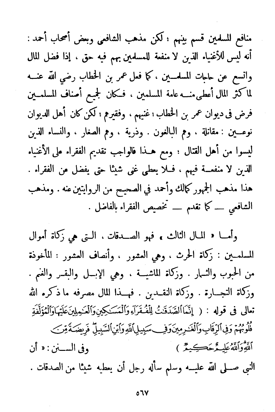 مَنَافِعِ الْمُسْلِمِينَ قُسِمَ بَيْنَهُمْ؛ لَكِنَّ مَذْهَبَ الشَّافِعِيِّ وَبَعْضِ أَصْحَابِ أَحْمَد: أَنَّهُ لَيْسَ لِلْأَغْنِيَاءِ الَّذِينَ لَا مَنْفَعَةَ لِلْمُسْلِمِينَ بِهِمْ فِيهِ حَقٌّ إذَا فَضَلَ الْمَالُ وَاتَّسَعَ عَنْ حَاجَاتِ الْمُسْلِمِينَ كَمَا فَعَلَ عُمَرُ بْنُ الْخَطَّابِ رَضِيَ اللَّهُ عَنْهُ لَمَّا كَثُرَ الْمَالُ أَعَطَا مِنْهُمْ عَامَّةَ الْمُسْلِمِينَ فَكَانَ لِجَمِيعِ أَصْنَافِ الْمُسْلِمِينَ فَرْضٌ فِي دِيوَانِ عُمَرَ بْنِ الْخَطَّابِ؛ غَنِيُّهُمْ وَفَقِيرُهُمْ؛ لَكِنْ كَانَ أَهْلُ الدِّيوَانِ نَوْعَيْنِ: مُقَاتِلَةٌ وَهُمْ الْبَالِغُونَ. وَذَرِّيَّةٌ وَهُمْ الصِّغَارُ وَالنِّسَاءُ الَّذِينَ لَيْسُوا مَنْ أَهْلِ الْقِتَالِ؛ وَمَعَ هَذَا فَالْوَاجِبُ تَقْدِيمُ الْفُقَرَاءِ عَلَى الْأَغْنِيَاءِ الَّذِينَ لَا مَنْفَعَةَ فِيهِمْ فَلَا يُعْطَى غَنِيٌّ شَيْئًا حَتَّى يَفْضُلَ عَنْ الْفُقَرَاءِ. هَذَا مَذْهَبُ الْجُمْهُورِ كَمَالِكِ وَأَحْمَد فِي الصَّحِيحِ مِنْ الرِّوَايَتَيْنِ عَنْهُ. وَمَذْهَبُ الشَّافِعِيِّ - كَمَا تَقَدَّمَ - تَخْصِيصُ الْفُقَرَاءِ بِالْفَاضِلِ. وَأَمَّا " الْمَالُ الثَّالِثُ " فَهُوَ الصَّدَقَاتُ الَّتِي هِيَ زَكَاةُ أَمْوَالِ الْمُسْلِمِينَ: زَكَاةُ الْحَرْثِ وَهِيَ الْعُشُورُ وَأَنْصَافُ الْعُشُورِ: الْمَأْخُوذَةُ مِنْ الْحُبُوبِ وَالثِّمَارِ. وَزَكَاةُ الْمَاشِيَةِ وَهِيَ الْإِبِلُ وَالْبَقَرُ وَالْغَنَمُ. وَزَكَاةُ التِّجَارَةِ. وَزَكَاةُ النَّقْدَيْنِ. فَهَذَا الْمَالُ مَصْرِفُهُ مَا ذَكَرَهُ اللَّهُ تَعَالَى فِي قَوْلِهِ: {إنَّمَا الصَّدَقَاتُ لِلْفُقَرَاءِ وَالْمَسَاكِينِ وَالْعَامِلِينَ عَلَيْهَا وَالْمُؤَلَّفَةِ قُلُوبُهُمْ وَفِي الرِّقَابِ وَالْغَارِمِينَ وَفِي سَبِيلِ اللَّهِ وَاِبْنِ السَّبِيلِ فَرِيضَةً مِنَ اللَّهِ وَاللَّهُ عَلِيمٌ حَكِيمٌ} وَفِي السُّنَنِ: {أَنَّ النَّبِيَّ صَلَّى اللَّهُ عَلَيْهِ وَسَلَّمَ سَأَلَهُ رَجُلٌ أَنْ يُعْطِيَهُ شَيْئًا مِنْ الصَّدَقَاتِ.