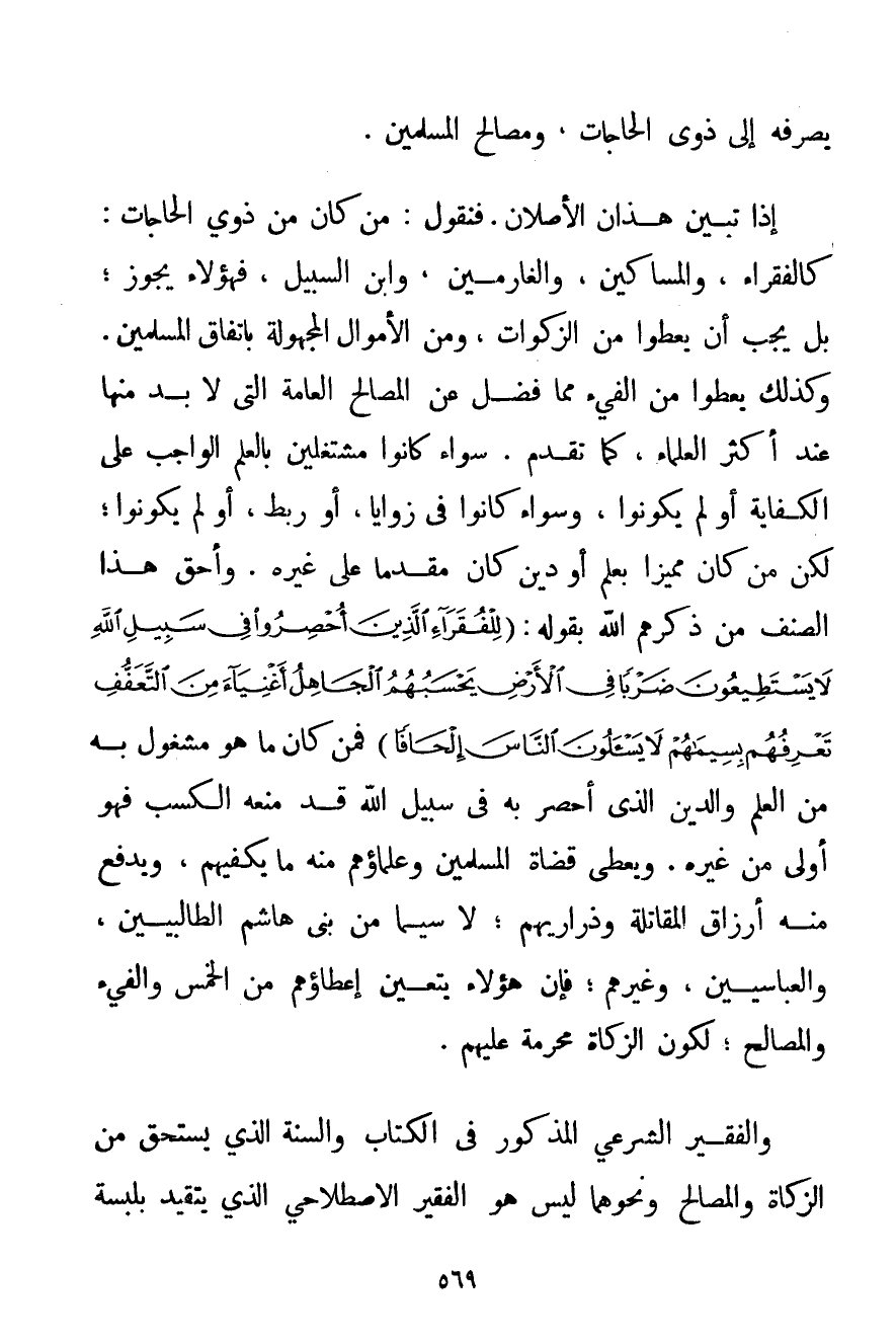 يَصْرِفُهُ إلَى ذَوِي الْحَاجَاتِ وَمَصَالِحِ الْمُسْلِمِينَ. إذَا تَبَيَّنَ هَذَانِ الْأَصْلَانِ. فَنَقُولُ: مَنْ كَانَ مِنْ ذَوِي الْحَاجَاتِ: كَالْفُقَرَاءِ وَالْمَسَاكِينِ وَالْغَارِمِينَ وَابْنِ السَّبِيلِ فَهَؤُلَاءِ يَجُوزُ؛ بَلْ يَجِبُ أَنْ يُعْطُوا مِنْ الزَّكَوَاتِ وَمِنْ الْأَمْوَالِ الْمَجْهُولَةِ بِاتِّفَاقِ الْمُسْلِمِينَ. وَكَذَلِكَ يُعْطُوا مِنْ الْفَيْءِ مِمَّا فَضَلَ مِنْ الْمَصَالِحِ الْعَامَّةِ الَّتِي لَا بُدَّ مِنْهَا عِنْدَ أَكْثَرِ الْعُلَمَاءِ كَمَا تَقَدَّمَ. سَوَاءٌ كَانُوا مُشْتَغِلِينَ بِالْعِلْمِ الْوَاجِبِ عَلَى الْكِفَايَةِ أَوْ لَمْ يَكُونُوا وَسَوَاءٌ كَانُوا فِي زَوَايَا أَوْ رَبْطٍ أَوْ لَمْ يَكُونُوا؛ لَكِنْ مَنْ كَانَ مُمَيَّزًا بِعِلْمِ أَوْ دِينٍ كَانَ مُقَدَّمًا عَلَى غَيْرِهِ. وَأَحَقُّ هَذَا الصِّنْفِ مَنْ ذَكَرَهُمْ اللَّهُ بِقَوْلِهِ: {لِلْفُقَرَاءِ الَّذِينَ أُحْصِرُوا فِي سَبِيلِ اللَّهِ لَا يَسْتَطِيعُونَ ضَرْبًا فِي الْأَرْضِ يَحْسَبُهُمُ الْجَاهِلُ أَغْنِيَاءَ مِنَ التَّعَفُّفِ تَعْرِفُهُمْ بِسِيمَاهُمْ لَا يَسْأَلُونَ النَّاسَ إلْحَافًا} فَمَنْ كَانَ مَا هُوَ مَشْغُولٌ بِهِ مِنْ الْعِلْمِ وَالدِّينِ الَّذِي أُحْصِرَ بِهِ فِي سَبِيلِ اللَّهِ قَدْ مَنَعَهُ الْكَسْبَ فَهُوَ أَوْلَى مِنْ غَيْرِهِ. وَيُعْطَى قُضَاةُ الْمُسْلِمِينَ وَعُلَمَاؤُهُمْ مِنْهُ مَا يَكْفِيهِمْ وَيَدْفَعُ مِنْهُ أَرْزَاقَ الْمُقَاتِلَةِ وَذَرَارِيِّهِمْ لَا سِيَّمَا مِنْ بَنِي هَاشِمٍ الطالبيين والعباسيين وَغَيْرِهِمْ؛ فَإِنَّ هَؤُلَاءِ يَتَعَيَّنُ إعْطَاؤُهُمْ مِنْ الْخُمُسِ وَالْفَيْءِ وَالْمَصَالِحِ؛ لِكَوْنِ الزَّكَاةِ مُحَرَّمَةٌ عَلَيْهِمْ. وَالْفَقِيرُ الشَّرْعِيُّ الْمَذْكُورُ فِي الْكِتَابِ وَالسُّنَّةِ الَّذِي يَسْتَحِقُّ مِنْ الزَّكَاةِ وَالْمَصَالِحِ وَنَحْوِهِمَا لَيْسَ هُوَ الْفَقِيرُ الِاصْطِلَاحِيِّ الَّذِي يَتَقَيَّدُ بِلُبْسَةِ