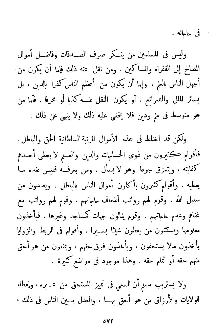 فِي حَاجَاتِهِ. وَلَيْسَ فِي الْمُسْلِمِينَ مَنْ يُنْكِرُ صَرْفَ الصَّدَقَاتِ وَفَاضِلِ أَمْوَالِ الْمَصَالِحِ إلَى الْفُقَرَاءِ وَالْمَسَاكِينِ. وَمَنْ نَقَلَ عَنْهُ ذَلِكَ فَإِمَّا أَنْ يَكُونَ مِنْ أَجْهَلِ النَّاسِ بِالْعِلْمِ وَإِمَّا أَنْ يَكُونَ مِنْ أَعْظَمِ النَّاسِ كُفْرًا بِالدِّينِ؛ بَلْ بِسَائِرِ الْمِلَلِ وَالشَّرَائِعِ أَوْ يَكُونُ النَّقْلُ عَنْهُ كَذِبًا أَوْ مُحَرَّفًا. فَإِمَّا مَنْ هُوَ مُتَوَسِّطٌ فِي عِلْمٍ وَدِينٍ فَلَا يَخْفَى عَلَيْهِ ذَلِكَ وَلَا يَنْهَى عَنْ ذَلِكَ. وَلَكِنْ قَدْ اخْتَلَطَ فِي هَذِهِ الْأَمْوَالِ الْمُرَتَّبَةِ السُّلْطَانِيَّةِ الْحَقُّ وَالْبَاطِلُ. فَأَقْوَامٌ كَثِيرُونَ مِنْ ذَوِي الْحَاجَاتِ وَالدِّينِ وَالْعِلْمِ لَا يُعْطَى أَحَدُهُمْ كِفَايَتَهُ وَيَتَمَزَّقُ جَوْعًا وَهُوَ لَا يَسْأَلُ وَمَنْ يَعْرِفُهُ فَلَيْسَ عِنْدَهُ مَا يُعْطِيهِ. وَأَقْوَامٌ كَثِيرُونَ يَأْكُلُونَ أَمْوَالَ النَّاسِ بِالْبَاطِلِ وَيَصُدُّونَ عَنْ سَبِيلِ اللَّهِ. وَقَوْمٌ لَهُمْ رَوَاتِبُ أَضْعَافُ حَاجَاتِهِمْ. وَقَوْمٌ لَهُمْ رَوَاتِبُ مَعَ غِنَاهُمْ وَعَدَمِ حَاجَاتِهِمْ. وَقَوْمٌ يَنَالُونَ جِهَاتٍ كَمَسَاجِدَ وَغَيْرِهَا فَيَأْخُذُونَ مَعْلُومَهَا وَيَسْتَثْنُونَ مَنْ يُعْطُونَ شَيْئًا يَسِيرًا. وَأَقْوَامٌ فِي الرَّبْطِ وَالزَّوَايَا يَأْخُذُونَ مَالًا يَسْتَحِقُّونَ وَيَأْخُذُونَ فَوْقَ حَقِّهِمْ وَيَمْنَعُونَ مَنْ هُوَ أَحَقُّ مِنْهُمْ حَقَّهُ أَوْ تَمَامَ حَقِّهِ. وَهَذَا مَوْجُودٌ فِي مَوَاضِعَ كَثِيرَةٍ. وَلَا يَسْتَرِيبُ مُسْلِمٌ أَنَّ السَّعْيَ فِي تَمْيِيزِ الْمُسْتَحِقِّ مِنْ غَيْرِهِ وَإِعْطَاءَ الْوِلَايَاتِ وَالْأَرْزَاقِ مَنْ هُوَ أَحَقُّ بِهَا وَالْعَدْلَ بَيْنَ النَّاسِ فِي ذَلِكَ