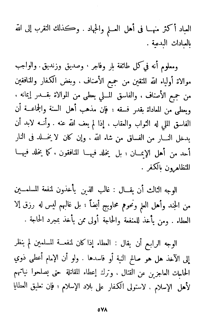 الْعِبَادِ أَكْثَرُ مِنْهَا فِي أَهْلِ الْعِلْمِ وَالْجِهَادِ. وَكَذَلِكَ التَّقَرُّبُ إلَى اللَّهِ بِالْعِبَادَاتِ الْبِدْعِيَّةِ. وَمَعْلُومٌ أَنَّهُ فِي كُلِّ طَائِفَةٍ بَارٌّ وَفَاجِرٌ وَصِدِّيقٌ وَزِنْدِيقٌ. وَالْوَاجِبُ مُوَالَاةُ أَوْلِيَاءِ اللَّهِ الْمُتَّقِينَ مِنْ جَمِيعِ الْأَصْنَافِ وَبُغْضُ الْكُفَّارِ وَالْمُنَافِقِينَ مِنْ جَمِيعِ الْأَصْنَافِ وَالْفَاسِقُ الْمَلِيُّ يُعْطَى مِنْ الْمُوَالَاةِ بِقَدْرِ إيمَانِهِ وَيُعْطَى مِنْ الْمُعَادَاةِ بِقَدْرِ فِسْقِهِ؛ فَإِنَّ مَذْهَبَ أَهْلِ السُّنَّةِ وَالْجَمَاعَةِ أَنَّ الْفَاسِقَ الْمَلِيَّ لَهُ الثَّوَابُ وَالْعِقَابُ إذَا لَمْ يَعْفُ اللَّهُ عَنْهُ. وَأَنَّهُ لَا بُدَّ أَنْ يَدْخُلَ النَّارَ مِنْ الْفُسَّاقِ مَنْ شَاءَ اللَّهُ وَإِنْ كَانَ لَا يُخَلَّدُ فِي النَّارِ أَحَدٌ مِنْ أَهْلِ الْإِيمَانِ. بَلْ يُخَلَّدُ فِيهَا الْمُنَافِقُونَ كَمَا يُخَلَّدُ فِيهَا الْمُتَظَاهِرُونَ بِالْكُفْرِ. الْوَجْهُ الثَّالِثُ أَنْ يُقَالَ: غَالِبُ الَّذِينَ يَأْخُذُونَ لِمَنْفَعَةِ الْمُسْلِمِينَ مِنْ الْجُنْدِ وَأَهْلِ الْعِلْمِ وَنَحْوِهِمْ مَحَاوِيجُ أَيْضًا؛ بَلْ غَالِبُهُمْ لَيْسَ لَهُ رِزْقٌ إلَّا الْعَطَاءَ. وَمَنْ يَأْخُذُ لِلْمَنْفَعَةِ وَالْحَاجَةُ أَوْلَى مِمَّنْ يَأْخُذُ بِمُجَرَّدِ الْحَاجَةِ. الْوَجْهُ الرَّابِعُ أَنْ يُقَالَ: الْعَطَاءُ إذَا كَانَ لِمَنْفَعَةِ الْمُسْلِمِينَ لَمْ يُنْظَرْ إلَى الْآخِذِ هَلْ هُوَ صَالِحُ النِّيَّةِ أَوْ فَاسِدُهَا. وَلَوْ أَنَّ الْإِمَامَ أَعْطَى ذَوِي الْحَاجَاتِ الْعَاجِزِينَ عَنْ الْقِتَالِ وَتَرَكَ إعْطَاءَ الْمُقَاتِلَةِ حَتَّى يُصْلِحُوا نِيَّاتِهِمْ لِأَهْلِ الْإِسْلَامِ لَاسْتَوْلَى الْكُفَّارُ عَلَى بِلَادِ الْإِسْلَامِ؛ فَإِنَّ تَعْلِيقَ الْعَطَايَا