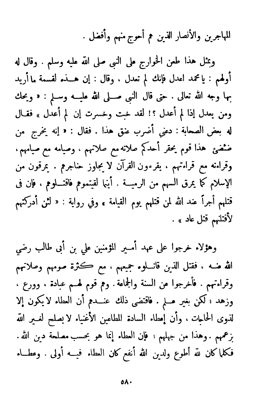 الْمُهَاجِرِينَ وَالْأَنْصَارِ الَّذِينَ هُمْ أَحْوَجُ مِنْهُمْ وَأَفْضَلُ. وَبِمِثْلِ هَذَا طَعَنَ الْخَوَارِجُ عَلَى النَّبِيِّ صَلَّى اللَّهُ عَلَيْهِ وَسَلَّمَ. {وَقَالَ لَهُ أَوَّلُهُمْ: يَا مُحَمَّدُ اعْدِلْ فَإِنَّك لَمْ تَعْدِلْ وَقَالَ: إنَّ هَذِهِ لَقِسْمَةٌ مَا أُرِيدَ بِهَا وَجْهُ اللَّهِ تَعَالَى. حَتَّى قَالَ النَّبِيُّ صَلَّى اللَّهُ عَلَيْهِ وَسَلَّمَ. وَيْحُك وَمَنْ يَعْدِلُ إذَا لَمْ أَعْدِلْ لَقَدْ خِبْت وَخَسِرْت إنْ لَمْ أَعْدِلْ فَقَالَ لَهُ بَعْضُ الصَّحَابَةِ: دَعْنِي أَضْرِبْ عُنُقَ هَذَا. فَقَالَ: إنَّهُ يَخْرُجُ مِنْ ضئضئ هَذَا قَوْمٌ يُحَقِّرُ أَحَدُكُمْ صَلَاتَهُ مَعَ صَلَاتِهِمْ وَصِيَامَهُ مَعَ صِيَامِهِمْ وَقِرَاءَتَهُ مَعَ قِرَاءَتِهِمْ يَقْرَءُونَ الْقُرْآنَ لَا يُجَاوِزُ حَنَاجِرَهُمْ. يَمْرُقُونَ مِنْ الْإِسْلَامِ كَمَا يَمْرُقُ السَّهْمُ مِنْ الرَّمِيَّةِ. أَيْنَمَا لَقِيتُمُوهُمْ فَاقْتُلُوهُمْ فَإِنَّ فِي قَتْلِهِمْ أَجْرًا عِنْدَ اللَّهِ لِمَنْ قَتَلَهُمْ يَوْمَ الْقِيَامَةِ} وَفِي رِوَايَةٍ: {لَئِنْ أَدْرَكْتهمْ لَأَقْتُلَنَّهُمْ قَتْلَ عَادٍ} . وَهَؤُلَاءِ خَرَجُوا عَلَى عَهْدِ أَمِيرِ الْمُؤْمِنِينَ عَلِيِّ بْنِ أَبِي طَالِبٍ رَضِيَ اللَّهُ عَنْهُ فَقَتَلَ الَّذِينَ قَاتَلُوهُ جَمِيعَهُمْ مَعَ كَثْرَةِ صَوْمِهِمْ وَصَلَاتِهِمْ وَقِرَاءَتِهِمْ. فَأُخْرِجُوا عَنْ السُّنَّةِ وَالْجَمَاعَةِ. وَهُمْ قَوْمٌ لَهُمْ عِبَادَةٌ وَوَرَعٌ وَزُهْدٌ؛ لَكِنْ بِغَيْرِ عِلْمٍ. فَاقْتَضَى ذَلِكَ عِنْدَهُمْ أَنَّ الْعَطَاءَ لَا يَكُونُ إلَّا لِذَوِي الْحَاجَاتِ وَأَنَّ إعْطَاءَ السَّادَةِ الْمُطَاعِينَ الْأَغْنِيَاءِ لَا يَصْلُحُ لِغَيْرِ اللَّهِ بِزَعْمِهِمْ. وَهَذَا مِنْ جَهْلِهِمْ؛ فَإِنَّ الْعَطَاءَ إنَّمَا هُوَ بِحَسَبِ مَصْلَحَةِ دِينِ اللَّهِ. فَكُلَّمَا كَانَ لِلَّهِ أَطْوَعَ وَلِدِينِ اللَّهِ أَنْفَعَ كَانَ الْعَطَاءُ فِيهِ أَوْلَى. وَعَطَاءٌ