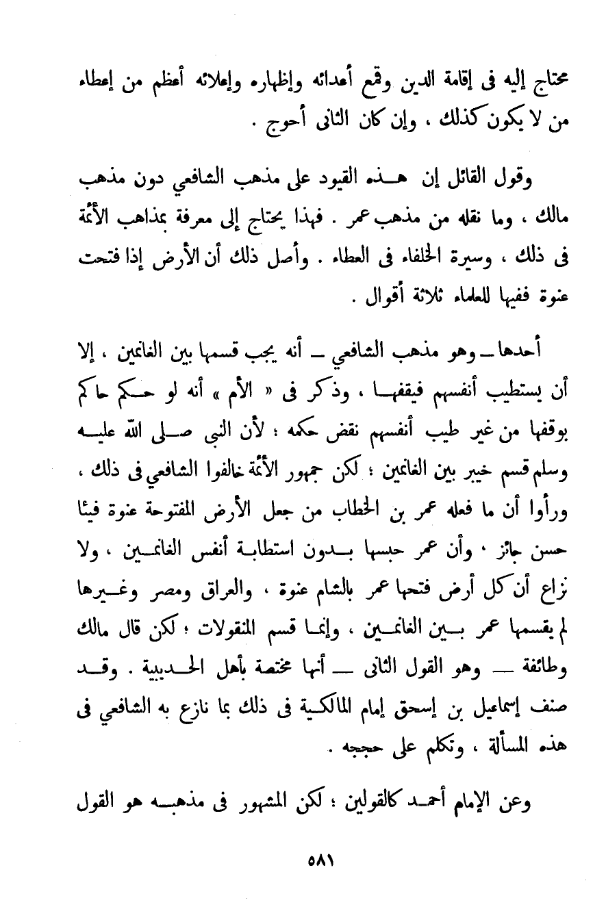 مُحْتَاجٌ إلَيْهِ فِي إقَامَةِ الدِّينِ وَقَمْعِ أَعْدَائِهِ وَإِظْهَارِهِ وَإِعْلَائِهِ أَعْظَمُ مِنْ إعْطَاءِ مَنْ لَا يَكُونُ كَذَلِكَ وَإِنْ كَانَ الثَّانِي أَحْوَجَ. وَقَوْلُ الْقَائِلِ أَنَّ هَذِهِ الْقُيُودَ عَلَى مَذْهَبِ الشَّافِعِيِّ دُونَ مَذْهَبِ مَالِكٍ وَمَا نَقَلَهُ مِنْ مَذْهَبِ عُمَرَ. فَهَذَا يَحْتَاجُ إلَى مَعْرِفَةِ بِمَذَاهِبِ الْأَئِمَّةِ فِي ذَلِكَ وَسِيرَةِ الْخُلَفَاءِ فِي الْعَطَاءِ. وَأَصْلُ ذَلِكَ أَنَّ الْأَرْضَ إذَا فُتِحَتْ عَنْوَةً فَفِيهَا لِلْعُلَمَاءِ ثَلَاثَةُ أَقْوَالٍ. أَحَدُهَا - وَهُوَ مَذْهَبُ الشَّافِعِيِّ - أَنَّهُ يَجِبُ قَسْمُهَا بَيْنَ الْغَانِمِينَ إلَّا أَنْ يَسْتَطِيبَ أَنْفُسُهُمْ فَيَقِفُهَا وَذُكِرَ فِي " الْأُمِّ " أَنَّهُ لَوْ حَكَمَ حَاكِمٌ بِوَقْفِهَا مِنْ غَيْرِ طِيبِ أَنْفُسِهِمْ نُقِضَ حُكْمُهُ؛ لَأَنَّ النَّبِيَّ صَلَّى اللَّهُ عَلَيْهِ وَسَلَّمَ قَسَمَ خَيْبَرَ بَيْنَ الْغَانِمِينَ؛ لَكِنَّ جُمْهُورَ الْأَئِمَّةِ خَالَفُوا الشَّافِعِيَّ فِي ذَلِكَ وَرَأَوْا أَنَّ مَا فَعَلَهُ عُمَرُ بْنُ الْخَطَّابِ مِنْ جَعْلِ الْأَرْضِ الْمَفْتُوحَةِ عَنْوَةً فَيْئًا حَسَنٌ جَائِزٌ وَأَنَّ عُمَرَ حَبَسَهَا بِدُونِ اسْتِطَابَةِ أَنْفُسِ الْغَانِمِينَ. وَلَا نِزَاعَ أَنَّ كُلَّ أَرْضٍ فَتَحَهَا عُمَرُ بِالشَّامِ عَنْوَةً. وَالْعِرَاقِ وَمِصْرَ وَغَيْرِهَا لَمْ يُقَسِّمْهَا عُمَرُ بَيْنَ الْغَانِمِينَ وَإِنَّمَا قَسَمَ الْمَنْقُولَاتِ لَكِنْ قَالَ مَالِكٌ وَطَائِفَةٌ - وَهُوَ الْقَوْلُ الثَّانِي - أَنَّهَا مُخْتَصَّةٌ بِأَهْلِ الْحُدَيْبِيَةِ. وَقَدْ صَنَّفَ إسْمَاعِيلُ بْنُ إسْحَاقَ إمَامُ الْمَالِكِيَّةِ فِي ذَلِكَ بِمَا نَازَعَ بِهِ الشَّافِعِيَّ فِي هَذِهِ الْمَسْأَلَةِ وَتَكَلَّمَ عَلَى حُجَجِهِ. وَعَنْ الْإِمَامِ أَحْمَد كَالْقَوْلَيْنِ؛ لَكِنَّ الْمَشْهُورَ فِي مَذْهَبِهِ هُوَ الْقَوْلُ
