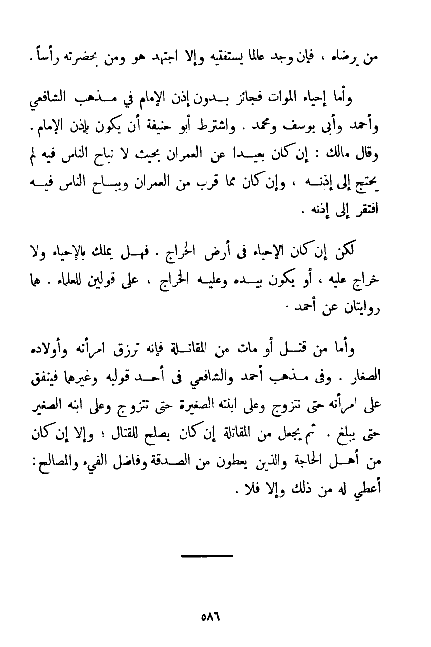 مَنْ يَرْضَاهُ فَإِنْ وُجِدَ عَالِمًا يَسْتَفْتِيهِ وَإِلَّا اجْتَهَدَ هُوَ وَمَنْ بِحَضْرَتِهِ رَأْسًا. وَأَمَّا إحْيَاءُ الْمَوَاتِ فَجَائِزٌ بِدُونِ إذْنِ الْإِمَامِ فِي مَذْهَبِ الشَّافِعِيِّ وَأَحْمَد وَأَبِي يُوسُفَ وَمُحَمَّدٍ. وَاشْتَرَطَ أَبُو حَنِيفَةَ أَنْ يَكُونَ بِإِذْنِ الْإِمَامِ. وَقَالَ مَالِكٌ: إنْ كَانَ بَعِيدًا عَنْ الْعُمْرَانِ بِحَيْثُ لَا تُبَاحُ النَّاسُ فِيهِ لَمْ يَحْتَجْ إلَى إذْنِهِ وَإِنْ كَانَ مِمَّا قَرُبَ مِنْ الْعُمْرَانِ وَيُبَاحُ النَّاسُ فِيهِ افْتَقَرَ إلَى إذْنِهِ. لَكِنْ إنْ كَانَ الْإِحْيَاءُ فِي أَرْضِ الْخَرَاجِ. فَهَلْ يُمَلَّكُ بِالْأَحْيَاءِ وَلَا خَرَاجَ عَلَيْهِ أَوْ يَكُونُ بِيَدِهِ وَعَلَيْهِ الْخَرَاجُ عَلَى قَوْلَيْنِ لِلْعُلَمَاءِ. هُمَا رِوَايَتَانِ عَنْ أَحْمَد. وَأَمَّا مَنْ قُتِلَ أَوْ مَاتَ مِنْ الْمُقَاتِلَةِ فَإِنَّهُ تُرْزَقُ امْرَأَتُهُ وَأَوْلَادُهُ الصِّغَارُ. وَفِي مَذْهَبِ أَحْمَد وَالشَّافِعِيِّ فِي أَحَدِ قَوْلَيْهِ وَغَيْرِهِمَا فَيُنْفَقُ عَلَى امْرَأَتِهِ حَتَّى تَتَزَوَّجَ وَعَلَى ابْنَتِهِ الصَّغِيرَةِ حَتَّى تَتَزَوَّجَ وَعَلَى ابْنِهِ الصَّغِيرِ حَتَّى يَبْلُغَ. ثُمَّ يُجْعَلُ مِنْ الْمُقَاتِلَةِ إنْ كَانَ يَصْلُحُ لِلْقِتَالِ؛ وَإِلَّا إنْ كَانَ مِنْ أَهْلِ الْحَاجَةِ وَاَلَّذِينَ يُعْطُونَ مِنْ الصَّدَقَةِ وَفَاضِلُ الْفَيْءِ وَالْمَصَالِحِ: أُعْطِيَ لَهُ مِنْ ذَلِكَ وَإِلَّا فَلَا.