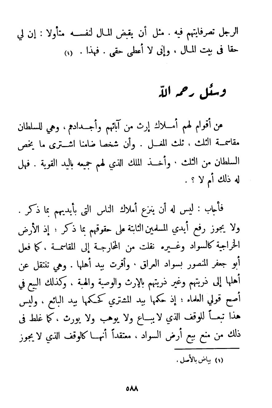 لَيْسَ لَهُ أَنْ يَنْزِعَ أَمْلَاكَ النَّاسِ الَّتِي بِأَيْدِيهِمْ بِمَا ذُكِرَ. وَلَا يَجُوزُ رَفْعُ أَيْدِي الْمُسْلِمِينَ الثَّابِتَةِ عَلَى حُقُوقِهِمْ بِمَا ذُكِرَ؛ إذْ الْأَرْضُ الخراجية كَالسَّوَادِ وَغَيْرِهِ نُقِلَتْ مِنْ الْمُخَارَجَةِ إلَى الْمُقَاسَمَةِ كَمَا فَعَلَ أَبُو جَعْفَرٍ الْمَنْصُورُ بِسَوَادِ الْعِرَاقِ وَأُقِرَّتْ بِيَدِ أَهْلِهَا. وَهِيَ تَنْتَقِلُ عَنْ أَهْلِهَا إلَى ذُرِّيَّتِهِمْ وَغَيْرِ ذُرِّيَّتِهِمْ بِالْإِرْثِ وَالْوَصِيَّةِ وَالْهِبَةِ وَكَذَلِكَ الْبَيْعُ فِي أَصَحِّ قَوْلَيْ الْعُلَمَاءِ؛ إذْ حُكْمُهَا بِيَدِ الْمُشْتَرِي كَحُكْمِهَا بِيَدِ الْبَائِعِ وَلَيْسَ هَذَا تَبَعًا لِلْوَقْفِ الَّذِي لَا يُبَاعُ وَلَا يُوهَبُ وَلَا يُورَثُ كَمَا غَلِطَ فِي ذَلِكَ مَنْ مَنَعَ بَيْعَ أَرْضِ السَّوَادِ مُعْتَقِدًا أَنَّهَا كَالْوَقْفِ الَّذِي لَا يَجُوزُ