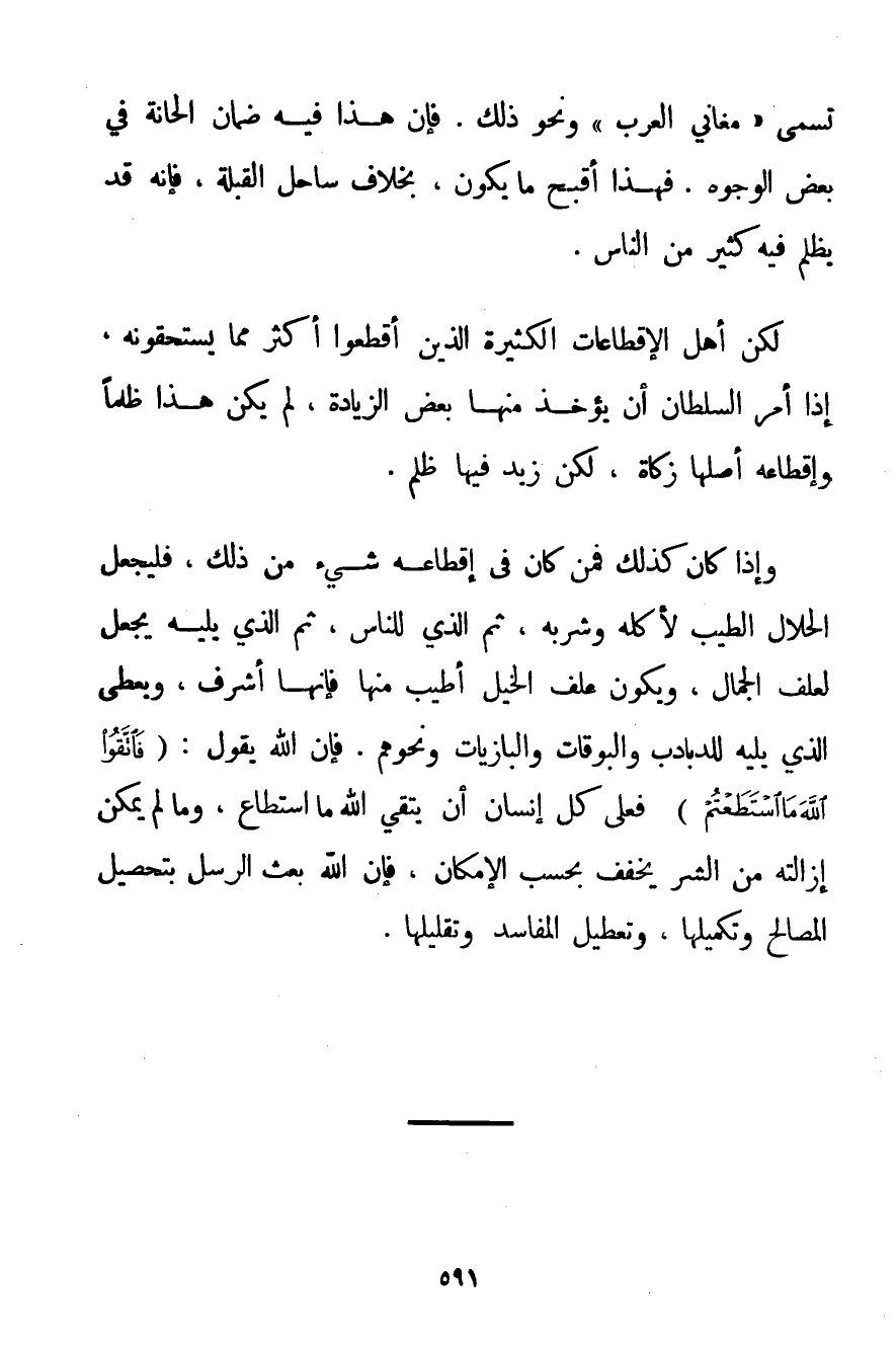 تُسَمَّى " مَغَانِيَ الْعَرَبِ " وَنَحْوِ ذَلِكَ. فَإِنَّ هَذَا فِيهِ ضَمَانُ الْحَانَةِ فِي بَعْضِ الْوُجُوهِ. فَهَذَا أَقْبَحُ مَا يَكُونُ بِخِلَافِ سَاحِلِ الْقِبْلَةِ فَإِنَّهُ قَدْ يُظْلَمُ فِيهِ كَثِيرٌ مِنْ النَّاسِ. لَكِنَّ أَهْلَ الْإِقْطَاعَاتِ الْكَثِيرَةِ الَّذِينَ أَقْطَعُوا أَكْثَرَ مِمَّا يَسْتَحِقُّونَهُ إذَا أَمَرَ السُّلْطَانُ أَنْ يُؤْخَذَ مِنْهَا بَعْضُ الزِّيَادَةِ لَمْ يَكُنْ هَذَا ظُلْمًا وَإِقْطَاعُهُ أَصْلُهَا زَكَاةٌ لَكِنْ زِيدَ فِيهَا ظُلْمٌ. وَإِذَا كَانَ كَذَلِكَ فَمَنْ كَانَ فِي إقْطَاعِهِ شَيْءٌ مِنْ ذَلِكَ فَلْيَجْعَلْ الْحَلَالَ الطَّيِّبَ لِأَكْلِهِ وَشُرْبِهِ ثُمَّ الَّذِي لِلنَّاسِ ثُمَّ الَّذِي يَلِيهِ يَجْعَلُ لِعَلَفِ الْجِمَالِ وَيَكُونُ عَلَفُ الْخَيْلِ أَطْيَبَ مِنْهَا فَإِنَّهَا أَشْرَفُ وَيُعْطِي الَّذِي يَلِيهِ لِلدَّبَادِبِ وَالْبُوقَاتِ والبازيات وَنَحْوِهِمْ. فَإِنَّ اللَّهَ يَقُولُ: {فَاتَّقُوا اللَّهَ مَا اسْتَطَعْتُمْ} فَعَلَى كُلِّ إنْسَانٍ أَنْ يَتَّقِيَ اللَّهَ مَا اسْتَطَاعَ وَمَا لَمْ يُمْكِنْ إزَالَتُهُ مِنْ الشَّرِّ يُخَفَّفُ بِحَسَبِ الْإِمْكَانِ فَإِنَّ اللَّهَ بَعَثَ الرُّسُلَ بِتَحْصِيلِ الْمَصَالِحِ وَتَكْمِيلِهَا وَتَعْطِيلِ الْمَفَاسِدِ وَتَقْلِيلِهَا.