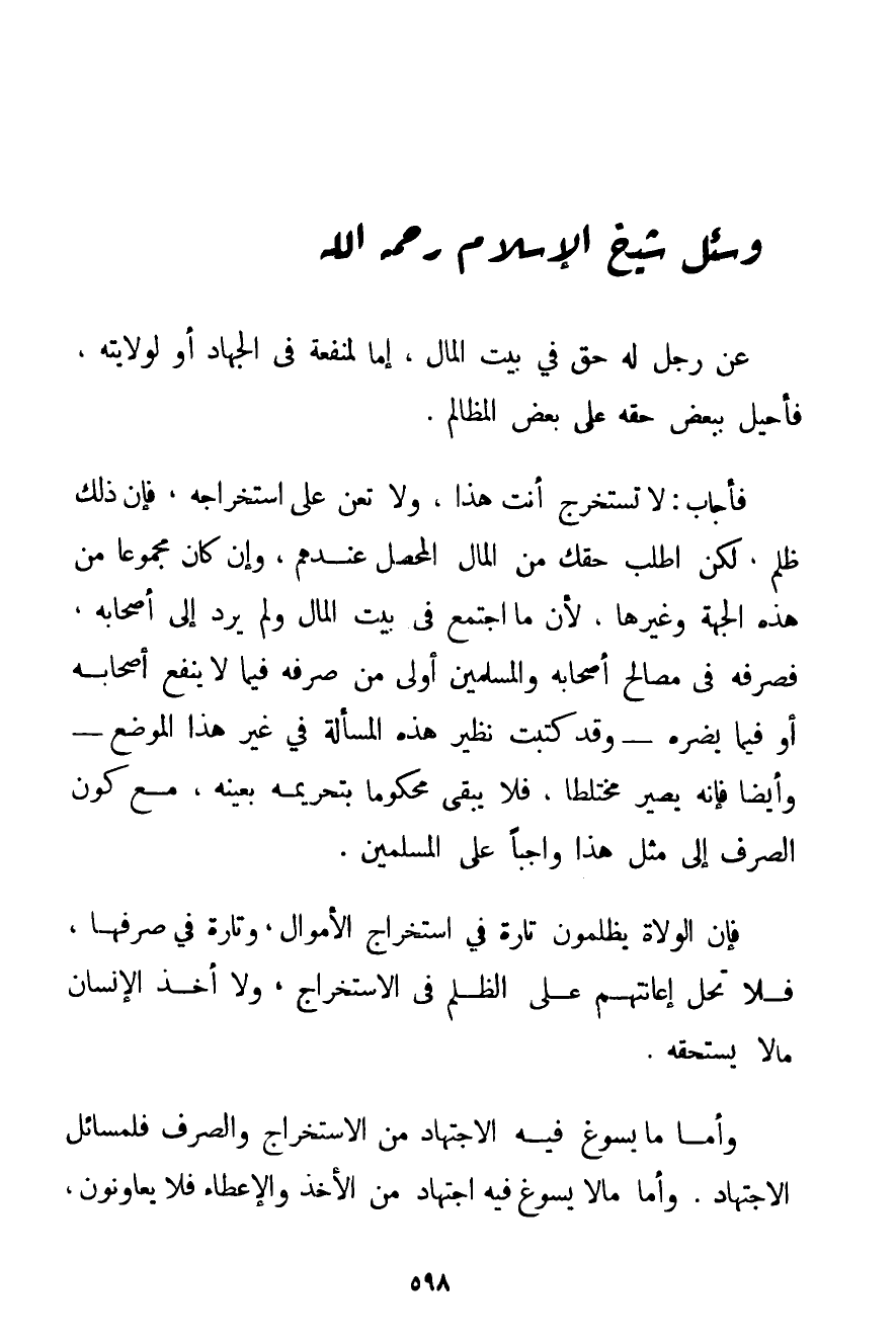 لَا تَسْتَخْرِجْ أَنْتَ هَذَا وَلَا تُعِنْ عَلَى اسْتِخْرَاجِهِ فَإِنَّ ذَلِكَ ظُلْمٌ لَكِنْ اُطْلُبْ حَقَّك مِنْ الْمَالِ الْمُحَصَّلِ عِنْدَهُمْ وَإِنْ كَانَ مَجْمُوعًا مِنْ هَذِهِ الْجِهَةِ وَغَيْرِهَا لِأَنَّ مَا اجْتَمَعَ فِي بَيْتِ الْمَالِ وَلَمْ يُرَدَّ إلَى أَصْحَابِهِ فَصَرَفَهُ فِي مَصَالِحِ أَصْحَابِهِ وَالْمُسْلِمِينَ أَوْلَى مِنْ صَرْفِهِ فِيمَا لَا يَنْفَعُ أَصْحَابَهُ أَوْ فِيمَا يَضُرُّهُ - وَقَدْ كَتَبْت نَظِيرَ هَذِهِ الْمَسْأَلَةِ فِي غَيْرِ هَذَا الْمَوْضِعِ - وَأَيْضًا فَإِنَّهُ يَصِيرُ مُخْتَلَطًا فَلَا يَبْقَى مَحْكُومًا بِتَحْرِيمِهِ بِعَيْنِهِ مَعَ كَوْنِ الصَّرْفِ إلَى مِثْلِ هَذَا وَاجِبًا عَلَى الْمُسْلِمِينَ. فَإِنَّ الْوُلَاةَ يَظْلِمُونَ تَارَةً فِي اسْتِخْرَاجِ الْأَمْوَالِ وَتَارَةً فِي صَرْفِهَا فَلَا تَحِلُّ إعَانَتُهُمْ عَلَى الظُّلْمِ فِي الِاسْتِخْرَاجِ وَلَا أَخْذُ الْإِنْسَانِ مَا لَا يَسْتَحِقُّهُ. وَأَمَّا مَا يَسُوغُ فِيهِ الِاجْتِهَادُ مِنْ الِاسْتِخْرَاجِ وَالصَّرْفِ فَلِمَسَائِلِ الِاجْتِهَادِ. وَأَمَّا مَا لَا يَسُوغُ فِيهِ اجْتِهَادٌ مِنْ الْأَخْذِ وَالْإِعْطَاءِ فَلَا يُعَاوَنُونَ