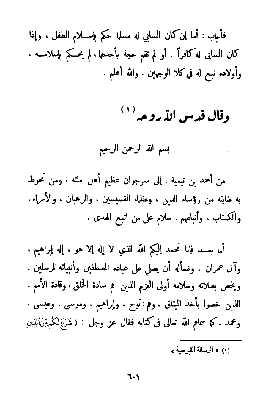مِنْ أَحْمَد ابْنِ تَيْمِيَّة إلَى سرجوان عَظِيمِ أَهْلِ مِلَّتِهِ وَمَنْ تَحُوطُ بِهِ عِنَايَتُهُ مِنْ رُؤَسَاءِ الدِّينِ وَعُظَمَاءِ الْقِسِّيسِينَ وَالرُّهْبَانِ وَالْأُمَرَاءِ وَالْكُتَّابِ وَأَتْبَاعِهِمْ. سَلَامٌ عَلَى مَنْ اتَّبَعَ الْهُدَى. أَمَّا بَعْدُ فَإِنَّا نَحْمَدُ إلَيْكُمْ اللَّهَ الَّذِي لَا إلَهَ إلَّا هُوَ إلَهَ إبْرَاهِيمَ وَآلَ عِمْرَانَ. وَنَسْأَلُهُ أَنْ يُصَلِّيَ عَلَى عِبَادِهِ الْمُصْطَفِينَ وَأَنْبِيَائِهِ الْمُرْسَلِينَ. وَيَخُصُّ بِصَلَاتِهِ وَسَلَامِهِ أُولِي الْعَزْمِ الَّذِينَ هُمْ سَادَةُ الْخَلْقِ وَقَادَةُ الْأُمَمِ. الَّذِينَ خُصُّوا بِأَخْذِ الْمِيثَاقِ وَهُمْ: نُوحٌ وَإِبْرَاهِيمُ وَمُوسَى وَعِيسَى وَمُحَمَّدٌ. كَمَا سَمَّاهُمْ اللَّهُ تَعَالَى فِي كِتَابِهِ فَقَالَ عَزَّ وَجَلَّ: {شَرَعَ لَكُمْ مِنَ