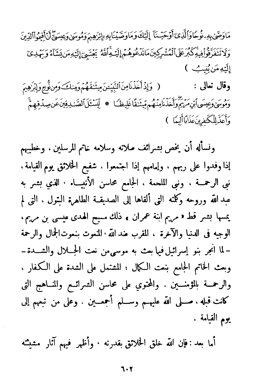 الدِّينِ مَا وَصَّى بِهِ نُوحًا وَالَّذِي أَوْحَيْنَا إلَيْكَ وَمَا وَصَّيْنَا بِهِ إبْرَاهِيمَ وَمُوسَى وَعِيسَى أَنْ أَقِيمُوا الدِّينَ وَلَا تَتَفَرَّقُوا فِيهِ كَبُرَ عَلَى الْمُشْرِكِينَ مَا تَدْعُوهُمْ إلَيْهِ اللَّهُ يَجْتَبِي إلَيْهِ مَنْ يَشَاءُ وَيَهْدِي إلَيْهِ مَنْ يُنِيبُ} وَقَالَ تَعَالَى: {وَإِذْ أَخَذْنَا مِنَ النَّبِيِّينَ مِيثَاقَهُمْ وَمِنْكَ وَمِنْ نُوحٍ وَإِبْرَاهِيمَ وَمُوسَى وَعِيسَى ابْنِ مَرْيَمَ وَأَخَذْنَا مِنْهُمْ مِيثَاقًا غَلِيظًا} {لِيَسْأَلَ الصَّادِقِينَ عَنْ صِدْقِهِمْ وَأَعَدَّ لِلْكَافِرِينَ عَذَابًا أَلِيمًا} وَنَسْأَلُهُ أَنْ يَخُصَّ بِشَرَائِفِ صَلَاتِهِ وَسَلَامِهِ خَاتَمَ الْمُرْسَلِينَ وَخَطِيبَهُمْ إذَا وَفَدُوا عَلَى رَبِّهِمْ وَإِمَامَهُمْ إذَا اجْتَمَعُوا شَفِيعَ الْخَلَائِقِ يَوْمَ الْقِيَامَةِ نَبِيَّ الرَّحْمَةِ وَنَبِيَّ الْمَلْحَمَةِ الْجَامِعَ مَحَاسِنَ الْأَنْبِيَاءِ الَّذِي بَشَّرَ بِهِ عَبْدُ اللَّهِ وَرُوحُهُ وَكَلِمَتُهُ الَّتِي أَلْقَاهَا إلَى الصِّدِّيقَةِ الطَّاهِرَةِ الْبَتُولِ الَّتِي لَمْ يَمَسَّهَا بَشَرٌ قَطُّ مَرْيَمُ ابْنَةُ عِمْرَانَ " ذَلِكَ مَسِيحُ الْهُدَى عِيسَى ابْنُ مَرْيَمَ الْوَجِيهُ فِي الدُّنْيَا وَالْآخِرَةِ الْمُقَرَّبُ عِنْدَ اللَّهِ الْمَنْعُوتُ بِنُعُوتِ الْجَمَالِ وَالرَّحْمَةِ لَمَّا أَنْجَرَ بَنُو إسْرَائِيلَ فِيمَا بَعَثَ بِهِ مُوسَى مِنْ نَعْتِ الْجَلَالِ وَالشِّدَّةِ - وَبَعَثَ الْخَاتَمَ الْجَامِعَ بِنَعْتِ الْكَمَالِ؛ الْمُشْتَمِلَ عَلَى الشِّدَّةِ عَلَى الْكُفَّارِ وَالرَّحْمَةِ بِالْمُؤْمِنِينَ. وَالْمُحْتَوِيَ عَلَى مَحَاسِنِ الشَّرَائِعِ وَالْمَنَاهِجِ الَّتِي كَانَتْ قَبْلَهُ صَلَّى اللَّهُ عَلَيْهِمْ وَسَلَّمَ أَجْمَعِينَ. وَعَلَى مَنْ تَبِعَهُمْ إلَى يَوْمِ الْقِيَامَةِ. أَمَّا بَعْدُ: فَإِنَّ اللَّهَ خَلَقَ الْخَلَائِقَ بِقُدْرَتِهِ وَأَظْهَرَ فِيهِمْ آثَارَ مَشِيئَتِهِ