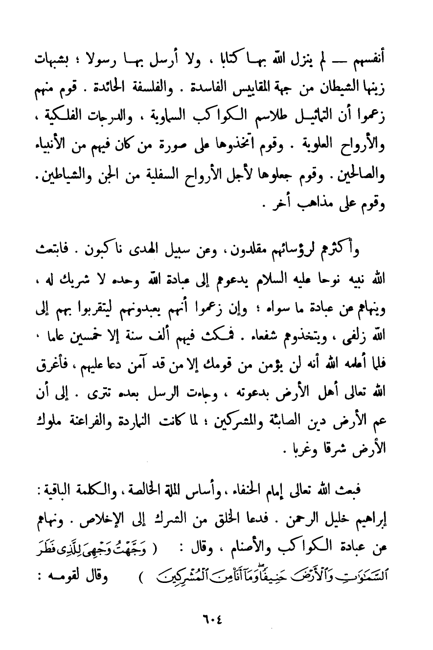 أَنْفُسِهِمْ - لَمْ يَنْزِلْ اللَّهُ بِهَا كِتَابًا وَلَا أَرْسَلَ بِهَا رَسُولًا؛ بِشُبُهَاتٍ زَيَّنَهَا الشَّيْطَانُ مِنْ جِهَةِ الْمَقَايِيسِ الْفَاسِدَةِ. وَالْفَلْسَفَةِ الْحَائِدَةِ. قَوْمٌ مِنْهُمْ زَعَمُوا أَنَّ التَّمَاثِيلَ طَلَاسِمُ الْكَوَاكِبِ السَّمَاوِيَّةِ وَالدَّرَجَاتُ الْفَلَكِيَّةِ وَالْأَرْوَاحُ الْعُلْوِيَّةِ. وَقَوْمٌ اتَّخَذُوهَا عَلَى صُورَةِ مَنْ كَانَ فِيهِمْ مِنْ الْأَنْبِيَاءِ وَالصَّالِحِينَ. وَقَوْمٌ جَعَلُوهَا لِأَجْلِ الْأَرْوَاحِ السُّفْلِيَّةِ مِنْ الْجِنِّ وَالشَّيَاطِينِ. وَقَوْمٌ عَلَى مَذَاهِبَ أُخَرَ. وَأَكْثَرُهُمْ لِرُؤَسَائِهِمْ مُقَلِّدُونَ وَعَنْ سَبِيلِ الْهُدَى نَاكِبُونَ. فَابْتَعَثَ اللَّهُ نَبِيَّهُ نُوحًا عَلَيْهِ السَّلَامُ يَدْعُوهُمْ إلَى عِبَادَةِ اللَّهِ وَحْدَهُ لَا شَرِيكَ لَهُ وَيَنْهَاهُمْ عَنْ عِبَادَةِ مَا سِوَاهُ؛ وَإِنْ زَعَمُوا أَنَّهُمْ يَعْبُدُونَهُمْ لِيَتَقَرَّبُوا بِهِمْ إلَى اللَّهِ زُلْفَى وَيَتَّخِذُوهُمْ شُفَعَاءَ. فَمَكَثَ فِيهِمْ أَلْفَ سَنَةٍ إلَّا خَمْسِينَ عَامًّا فَلَمَّا أَعْلَمَهُ اللَّهُ أَنَّهُ لَنْ يُؤْمِنَ مِنْ قَوْمِك إلَّا مَنْ قَدْ آمَنَ دَعَا عَلَيْهِمْ فَأَغْرَقَ اللَّهُ تَعَالَى أَهْلَ الْأَرْضِ بِدَعْوَتِهِ وَجَاءَتْ الرُّسُلُ بَعْدَهُ تَتْرَى. إلَى أَنْ عَمَّ الْأَرْضَ دِينُ الصَّابِئَةِ وَالْمُشْرِكِينَ؛ لَمَّا كَانَتْ النماردة وَالْفَرَاعِنَةُ مُلُوكَ الْأَرْضِ شَرْقًا وَغَرْبًا. فَبَعَثَ اللَّهُ تَعَالَى إمَامَ الْحُنَفَاءِ وَأَسَاسَ الْمِلَّةِ الْخَالِصَةِ وَالْكَلِمَةِ الْبَاقِيَةِ: إبْرَاهِيمَ خَلِيلَ الرَّحْمَنِ. فَدَعَا الْخَلْقَ مِنْ الشِّرْكِ إلَى الْإِخْلَاصِ. وَنَهَاهُمْ عَنْ عِبَادَةِ الْكَوَاكِبِ وَالْأَصْنَامِ وَقَالَ: {وَجَّهْتُ وَجْهِيَ لِلَّذِي فَطَرَ السَّمَاوَاتِ وَالْأَرْضَ حَنِيفًا وَمَا أَنَا مِنَ الْمُشْرِكِينَ} وَقَالَ لِقَوْمِهِ: