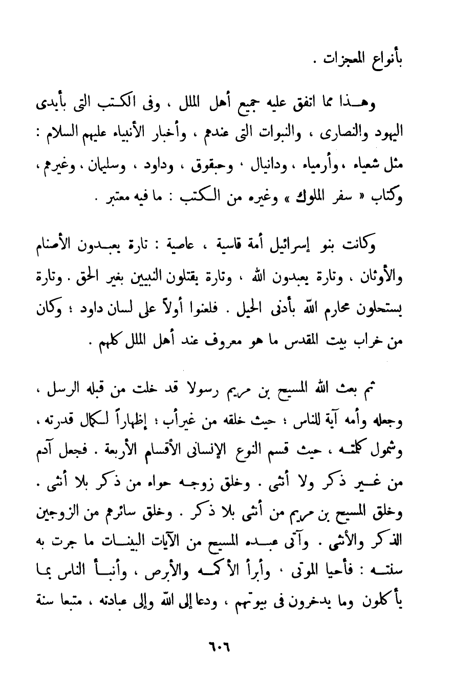 بِأَنْوَاعِ الْمُعْجِزَاتِ. وَهَذَا مِمَّا اتَّفَقَ عَلَيْهِ جَمِيعُ أَهْلِ الْمِلَلِ وَفِي الْكُتُبِ الَّتِي بِأَيْدِي الْيَهُودِ وَالنَّصَارَى وَالنُّبُوَّاتِ الَّتِي عِنْدَهُمْ وَأَخْبَارِ الْأَنْبِيَاءِ عَلَيْهِمْ السَّلَامُ مِثْلَ شعياء وأرمياء وَدَانْيَالَ وحبقوق ودَاوُد وَسُلَيْمَانَ وَغَيْرِهِمْ وَكِتَابِ " سِفْرِ الْمُلُوكِ " وَغَيْرِهِ مِنْ الْكُتُبِ: مَا فِيهِ مُعْتَبَرٌ. وَكَانَتْ بَنُو إسْرَائِيلَ أُمَّةً قَاسِيَةً عَاصِيَةً: تَارَةً يَعْبُدُونَ الْأَصْنَامَ وَالْأَوْثَانَ. وَتَارَةً يَعْبُدُونَ اللَّهَ. وَتَارَةً يَقْتُلُونَ النَّبِيِّينَ بِغَيْرِ الْحَقِّ. وَتَارَةً يَسْتَحِلُّونَ مَحَارِمَ اللَّهِ بِأَدْنَى الْحِيَلِ. فَلُعِنُوا أَوَّلًا عَلَى لِسَانِ دَاوُد؛ وَكَانَ مِنْ خُرَّابِ بَيْتِ الْمَقْدِسِ مَا هُوَ مَعْرُوفٌ عِنْدَ أَهْلِ الْمِلَلِ كُلِّهِمْ. ثُمَّ بَعَثَ اللَّهُ الْمَسِيحَ ابْنَ مَرْيَمَ رَسُولًا قَدْ خَلَتْ مَنْ قَبْلِهِ الرُّسُلُ وَجَعَلَهُ وَأَمَّهُ آيَةً لِلنَّاسِ؛ حَيْثُ خَلَقَهُ مِنْ غَيْرِ أَبٍ؛ إظْهَارًا لِكَمَالِ قُدْرَتِهِ وَشُمُولِ كَلِمَتِهِ حَيْثُ قَسَمَ النَّوْعَ الْإِنْسَانِيَّ الْأَقْسَامَ الْأَرْبِعَةَ. فَجَعَلَ آدَمَ مِنْ غَيْرِ ذَكَرٍ وَلَا أُنْثَى. وَخَلَقَ زَوْجَهُ حَوَّاءَ مِنْ ذَكَرٍ بِلَا أُنْثَى. وَخَلَقَ الْمَسِيحَ ابْنَ مَرْيَمَ مِنْ أُنْثَى بِلَا ذَكَرٍ. وَخَلَقَ سَائِرَهُمْ مِنْ الزَّوْجَيْنِ الذَّكَرِ وَالْأُنْثَى. وَآتَى عَبْدَهُ الْمَسِيحَ مِنْ الْآيَاتِ الْبَيِّنَاتِ مَا جَرَتْ بِهِ سُنَّتُهُ: فَأَحْيَا الْمَوْتَى وَأَبْرَأَ الْأَكْمَهَ وَالْأَبْرَصَ وَأَنْبَأَ النَّاسَ بِمَا يَأْكُلُونَ وَمَا يَدَّخِرُونَ فِي بُيُوتِهِمْ وَدَعَا إلَى اللَّهِ وَإِلَى عِبَادَتِهِ مُتَّبَعًا سُنَّةَ
