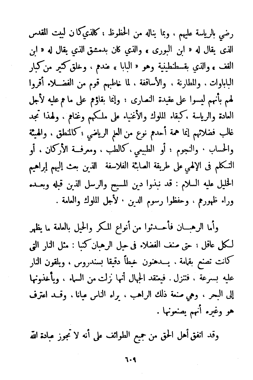 رَضِيَ بِالرِّيَاسَةِ عَلَيْهِمْ وَبِمَا يَنَالُهُ مِنْ الْحُظُوظِ؛ كَاَلَّذِي كَانَ لِبَيْتِ الْمَقْدِسِ الَّذِي يُقَالُ لَهُ " ابْنُ الْبُورِيِّ " وَاَلَّذِي كَانَ بِدِمَشْقَ الَّذِي يُقَالُ لَا " ابْنُ الْقُفِّ " وَاَلَّذِي بقسطنطينية وَهُوَ " الْبَابَا " عِنْدَهُمْ وَخَلْقٌ كَثِيرٌ مِنْ كِبَارِ الْبَابَاوَاتِ وَالْمَطَارِنَةِ وَالْأَسَاقِفَةِ لَمَّا خَاطَبَهُمْ قَوْمٌ مِنْ الْفُضَلَاءِ أَقَرُّوا لَهُمْ بِأَنَّهُمْ لَيْسُوا عَلَى عَقِيدَةِ النَّصَارَى؛ وَإِنَّمَا بَقَاؤُهُمْ عَلَى مَا هُمْ عَلَيْهِ لِأَجْلِ الْعَادَةِ وَالرِّيَاسَةِ كَبَقَاءِ الْمُلُوكِ وَالْأَغْنِيَاءِ عَلَى مُلْكِهِمْ وَغِنَاهُمْ وَلِهَذَا تَجِدُ غَالِبَ فُضَلَائِهِمْ إنَّمَا هِمَّةُ أَحَدِهِمْ نَوْعٌ مِنْ الْعِلْمِ الرِّيَاضِيِّ. كَالْمَنْطِقِ وَالْهَيْئَةِ وَالْحِسَابِ وَالنُّجُومِ؛ أَوْ الطَّبِيعِيِّ كَالطِّبِّ وَمَعْرِفَةِ الْأَرْكَانِ أَوْ التَّكَلُّمِ فِي الْإِلَهِيِّ عَلَى طَرِيقَةِ الصَّابِئَةِ الْفَلَاسِفَةِ الَّذِينَ بُعِثَ إلَيْهِمْ إبْرَاهِيمُ الْخَلِيلُ عَلَيْهِ السَّلَامُ قَدْ نَبَذُوا دِينَ الْمَسِيحِ وَالرُّسُلِ الَّذِينَ قَبْلَهُ وَبَعْدَهُ وَرَاءَ ظُهُورِهِمْ وَحَفِظُوا رُسُومَ الدِّينِ لِأَجْلِ الْمُلُوكِ وَالْعَامَّةِ. وَأَمَّا الرُّهْبَانُ فَأَحْدَثُوا مِنْ أَنْوَاعِ الْمَكْرِ وَالْحِيَلِ بِالْعَامَّةِ مَا يَظْهَرُ لِكُلِّ عَاقِلٍ؛ حَتَّى صَنَّفَ الْفُضَلَاءُ فِي حِيَلِ الرُّهْبَانِ كُتُبًا: مِثْلَ النَّارِ الَّتِي كَانَتْ تُصْنَعُ بِقُمَامَةِ. يَدْهُنُونَ خَيْطًا دَقِيقًا بسندروس وَيُلْقُونَ النَّارَ عَلَيْهِ بِسُرْعَةِ فَتَنْزِلُ. فَيَعْتَقِدُ الْجُهَّالُ أَنَّهَا نَزَلَتْ مِنْ السَّمَاءِ وَيَأْخُذُونَهَا إلَى الْبَحْرِ وَهِيَ صَنْعَةُ ذَلِكَ الرَّاهِبِ يَرَاهُ النَّاسُ عِيَانًا وَقَدْ اعْتَرَفَ هُوَ وَغَيْرُهُ أَنَّهُمْ يَصْنَعُونَهَا. وَقَدْ اتَّفَقَ أَهْلُ الْحَقِّ مِنْ جَمِيعِ الطَّوَائِفِ عَلَى أَنَّهُ لَا تَجُوزُ عِبَادَةُ اللَّهِ