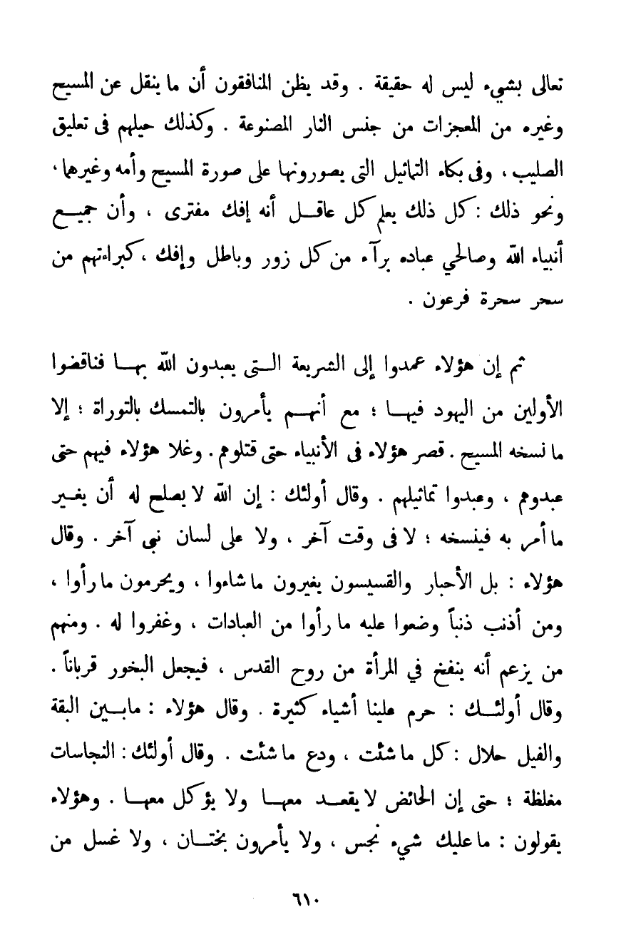 تَعَالَى بِشَيْءِ لَيْسَ لَهُ حَقِيقَةٌ. وَقَدْ يَظُنُّ الْمُنَافِقُونَ أَنَّ مَا يُنْقَلُ عَنْ الْمَسِيحِ وَغَيْرِهِ مِنْ الْمُعْجِزَاتِ مِنْ جِنْسِ النَّارِ الْمَصْنُوعَةِ. وَكَذَلِكَ حِيَلُهُمْ فِي تَعْلِيقِ الصَّلِيبِ وَفِي بُكَاءِ التَّمَاثِيلِ الَّتِي يُصَوِّرُونَهَا عَلَى صُورَةِ الْمَسِيحِ وَأُمِّهِ وَغَيْرِهِمَا وَنَحْوِ ذَلِكَ: كُلُّ ذَلِكَ يَعْلَمُ كُلُّ عَاقِلٍ أَنَّهُ إفْكٌ مُفْتَرًى وَأَنَّ جَمِيعَ أَنْبِيَاءِ اللَّهِ وَصَالِحِي عِبَادِهِ بُرَآءُ مِنْ كُلِّ زُورٍ وَبَاطِلٍ وَإِفْكٍ كَبَرَاءَتِهِمْ مِنْ سِحْرِ سَحَرَةِ فِرْعَوْنَ. ثُمَّ إنَّ هَؤُلَاءِ عَمِدُوا إلَى الشَّرِيعَةِ الَّتِي يَعْبُدُونَ اللَّهَ بِهَا فَنَاقَضُوا الْأَوَّلِينَ مِنْ الْيَهُودِ فِيهَا؛ مَعَ أَنَّهُمْ يَأْمُرُونَ بِالتَّمَسُّكِ بِالتَّوْرَاةِ؛ إلَّا مَا نَسَخَهُ الْمَسِيحُ. قَصَرَ هَؤُلَاءِ فِي الْأَنْبِيَاءِ حَتَّى قَتَلُوهُمْ. وَغَلَا هَؤُلَاءِ فِيهِمْ حَتَّى عَبَدُوهُمْ وَعَبَدُوا تَمَاثِيلَهُمْ. وَقَالَ أُولَئِكَ: إنَّ اللَّهَ لَا يَصْلُحُ لَهُ أَنْ يُغَيِّرَ مَا أَمَرَ بِهِ فَيَفْسَخُهُ؛ لَا فِي وَقْتٍ آخَرَ وَلَا عَلَى لِسَانِ نَبِيٍّ آخَرَ. وَقَالَ هَؤُلَاءِ: بَلْ الْأَحْبَارُ وَالْقِسِّيسُونَ يُغَيِّرُونَ مَا شَاءُوا وَيُحَرِّمُونَ مَا رَأَوْا وَمَنْ أَذْنَبَ ذَنْبًا وَضَعُوا عَلَيْهِ مَا رَأَوْا مِنْ الْعِبَادَاتِ وَغَفَرُوا لَهُ. وَمِنْهُمْ مَنْ يَزْعُمُ أَنَّهُ يَنْفُخُ فِي الْمَرْأَةِ مِنْ رُوحِ الْقُدُسِ فَيَجْعَلُ الْبَخُورَ قُرْبَانًا. وَقَالَ أُولَئِكَ: حَرَّمَ عَلَيْنَا أَشْيَاءَ كَثِيرَةً. وَقَالَ هَؤُلَاءِ: مَا بَيْنَ الْبَقَّةِ وَالْفِيلِ حَلَالٌ: كُلْ مَا شِئْت وَدَعْ مَا شِئْت. وَقَالَ أُولَئِكَ: النَّجَاسَاتُ مُغَلَّظَةٌ؛ حَتَّى إنَّ الْحَائِضَ لَا يُقْعَدُ مَعَهَا وَلَا يُؤْكَلُ مَعَهَا. وَهَؤُلَاءِ يَقُولُونَ: مَا عَلَيْك شَيْءٌ نَجِسٌ وَلَا يَأْمُرُونَ بِخِتَانِ وَلَا غُسْلٍ مِنْ