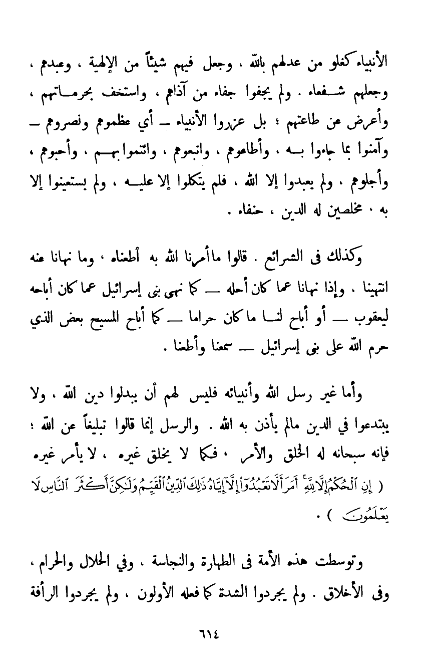 الْأَنْبِيَاءِ كَغُلُوِّ مَنْ عَدَلَهُمْ بِاَللَّهِ. وَجَعَلَ فِيهِمْ شَيْئًا مِنْ الْإِلَهِيَّةِ وَعَبَدَهُمْ وَجَعَلَهُمْ شُفَعَاءَ. وَلَمْ يَجْفُوا جَفَاءَ مَنْ آذَاهُمْ وَاسْتَخَفَّ بِحُرُمَاتِهِمْ وَأَعْرَضَ عَنْ طَاعَتِهِمْ؛ بَلْ عَزَّرُوا الْأَنْبِيَاءَ - أَيْ عَظَّمُوهُمْ وَنَصَرُوهُمْ - وَآمَنُوا بِمَا جَاءُوا بِهِ وَأَطَاعُوهُمْ وَاتَّبَعُوهُمْ وَائْتَمُّوا بِهِمْ وَأَحَبُّوهُمْ وَأَجْلَوْهُمْ وَلَمْ يَعْبُدُوا إلَّا اللَّهَ فَلَمْ يَتَّكِلُوا إلَّا عَلَيْهِ وَلَمْ يَسْتَعِينُوا إلَّا بِهِ مُخْلِصِينَ لَهُ الدِّينَ حُنَفَاءَ. وَكَذَلِكَ فِي الشَّرَائِعِ. قَالُوا مَا أَمَرَنَا اللَّهُ بِهِ أَطَعْنَاهُ وَمَا نَهَانَا عَنْهُ انْتَهَيْنَا وَإِذَا نَهَانَا عَمَّا كَانَ أَحَلَّهُ - كَمَا نَهَى بَنِي إسْرَائِيلَ عَمَّا كَانَ أَبَاحَهُ لِيَعْقُوبَ - أَوْ أَبَاحَ لَنَا مَا كَانَ حَرَامًا - كَمَا أَبَاحَ الْمَسِيحُ بَعْضَ الَّذِي حَرَّمَ اللَّهُ عَلَى بَنِي إسْرَائِيلَ - سَمِعْنَا وَأَطَعْنَا. وَأَمَّا غَيْرُ رُسُلِ اللَّهِ وَأَنْبِيَائِهِ فَلَيْسَ لَهُمْ أَنْ يُبَدِّلُوا دِينَ اللَّهِ وَلَا يَبْتَدِعُوا فِي الدِّينِ مَا لَمْ يَأْذَنْ بِهِ اللَّهُ. وَالرُّسُلُ إنَّمَا قَالُوا تَبْلِيغًا عَنْ اللَّهِ؛ فَإِنَّهُ سُبْحَانَهُ لَهُ الْخَلْقُ وَالْأَمْرُ فَكَمَا لَا يَخْلُقُ غَيْرُهُ لَا يَأْمُرُ غَيْرُهُ {إنِ الْحُكْمُ إلَّا لِلَّهِ أَمَرَ أَلَّا تَعْبُدُوا إلَّا إيَّاهُ ذَلِكَ الدِّينُ الْقَيِّمُ وَلَكِنَّ أَكْثَرَ النَّاسِ لَا يَعْلَمُونَ} . وَتَوَسَّطَتْ هَذِهِ الْأُمَّةُ فِي الطَّهَارَةِ وَالنَّجَاسَةِ. وَفِي الْحَلَالِ وَالْحَرَامِ وَفِي الْأَخْلَاقِ. وَلَمْ يُجَرِّدُوا الشِّدَّةَ كَمَا فَعَلَهُ الْأَوَّلُونَ وَلَمْ يُجَرِّدُوا الرَّأْفَةَ