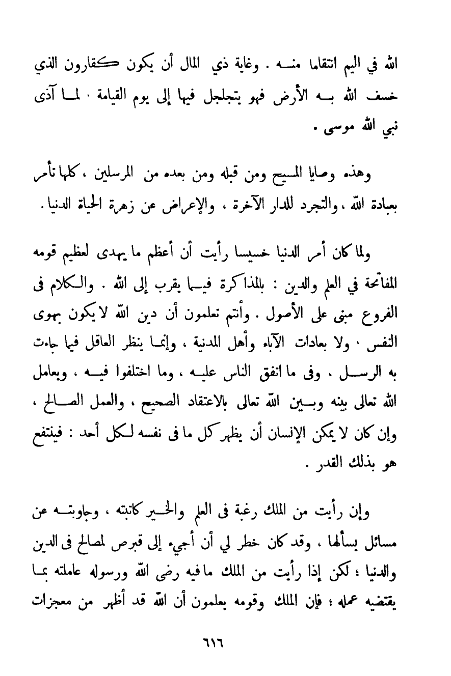 اللَّهُ فِي الْيَمِّ انْتِقَامًا مِنْهُ. وَغَايَةُ ذِي الْمَالِ أَنْ يَكُونَ كقارون الَّذِي خَسَفَ اللَّهُ بِهِ الْأَرْضَ فَهُوَ يَتَجَلْجَلُ فِيهَا إلَى يَوْمِ الْقِيَامَةِ. لَمَّا آذَى نَبِيَّ اللَّهِ مُوسَى. وَهَذِهِ وَصَايَا الْمَسِيحِ وَمَنْ قَبْلَهُ وَمَنْ بَعْدَهُ مِنْ الْمُرْسَلِينَ كُلُّهَا تَأْمُرُ بِعِبَادَةِ اللَّهِ وَالتَّجَرُّدِ لِلدَّارِ الْآخِرَةِ وَالْإِعْرَاضِ عَنْ زَهْرَةِ الْحَيَاةِ الدُّنْيَا. وَلَمَّا كَانَ أَمْرُ الدُّنْيَا خَسِيسًا رَأَيْت أَنَّ أَعْظَمَ مَا يُهْدَى لِعَظِيمِ قَوْمِهِ الْمُفَاتَحَةُ فِي الْعِلْمِ وَالدِّينِ: بِالْمُذَاكَرَةِ فِيمَا يُقَرِّبُ إلَى اللَّهِ. وَالْكَلَامُ فِي الْفُرُوعِ مَبْنِيٌّ عَلَى الْأُصُولِ. وَأَنْتُمْ تَعْلَمُونَ أَنَّ دِينَ اللَّهِ لَا يَكُونُ بِهَوَى النَّفْسِ وَلَا بِعَادَاتِ الْآبَاءِ وَأَهْلِ الْمَدَنِيَّةِ وَإِنَّمَا يَنْظُرُ الْعَاقِلُ فِيمَا جَاءَتْ بِهِ الرُّسُلُ وَفِي مَا اتَّفَقَ النَّاسُ عَلَيْهِ وَمَا اخْتَلَفُوا فِيهِ وَيُعَامِلُ اللَّهَ تَعَالَى بَيْنَهُ وَبَيْنَ اللَّهِ تَعَالَى بِالِاعْتِقَادِ الصَّحِيحِ وَالْعَمَلِ الصَّالِحِ وَإِنْ كَانَ لَا يُمْكِنُ الْإِنْسَانُ أَنْ يُظْهِرَ كُلَّ مَا فِي نَفْسِهِ لِكُلِّ أَحَدٍ: فَيَنْتَفِعُ هُوَ بِذَلِكَ الْقَدْرِ. وَإِنْ رَأَيْت مِنْ الْمُلْكِ رَغْبَةً فِي الْعِلْمِ وَالْخَيْرِ كَاتَبْته وَجَاوَبْته عَنْ مَسَائِلَ يَسْأَلُهَا وَقَدْ كَانَ خَطَرَ لِي أَنْ أَجِيءَ إلَى قُبْرُصَ لِمَصَالِحَ فِي الدِّينِ وَالدُّنْيَا؛ لَكِنْ إذَا رَأَيْت مِنْ الْمَلِكِ مَا فِيهِ رِضَى اللَّهِ وَرَسُولِهِ عَامَلْته بِمَا يَقْتَضِيهِ عَمَلُهُ؛ فَإِنَّ الْمَلِكَ وَقَوْمَهُ يَعْلَمُونَ أَنَّ اللَّهَ قَدْ أَظْهَرَ مِنْ مُعْجِزَاتِ