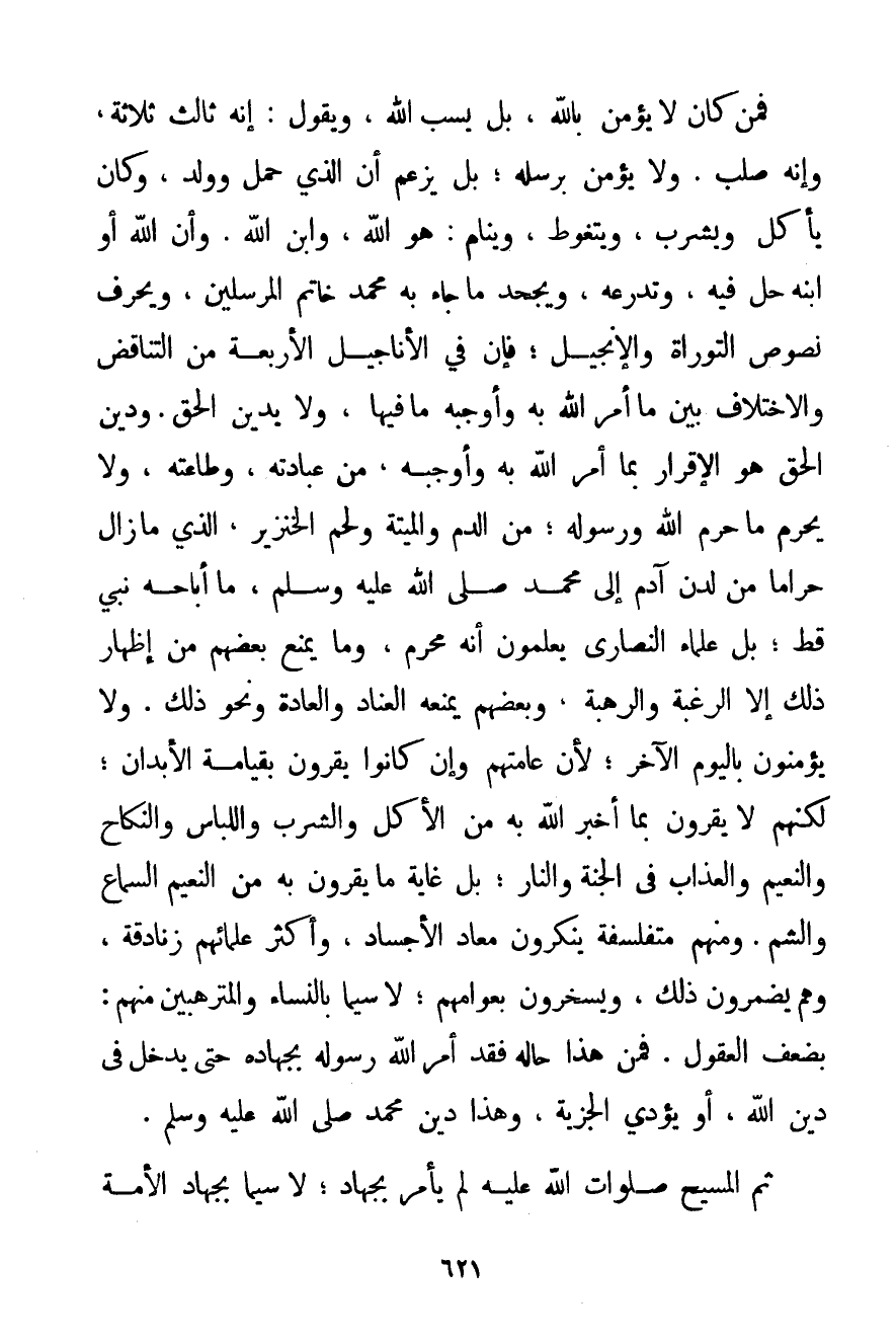 فَمَنْ كَانَ لَا يُؤْمِنُ بِاَللَّهِ بَلْ يَسُبُّ اللَّهَ وَيَقُولُ: إنَّهُ ثَالِثُ ثَلَاثَةٍ وَأَنَّهُ صُلِبَ. وَلَا يُؤْمِنُ بِرُسُلِهِ؛ بَلْ يَزْعُمُ أَنَّ الَّذِي حَمَلَ وَوَلَدَ وَكَانَ يَأْكُلُ وَيَشْرَبُ وَيَتَغَوَّطُ وَيَنَامُ: هُوَ اللَّهُ وَابْنُ اللَّهِ. وَأَنَّ اللَّهَ أَوْ ابْنَهُ حَلَّ فِيهِ وَتَدَرَّعَهُ وَيَجْحَدُ مَا جَاءَ بِهِ مُحَمَّدٌ خَاتَمُ الْمُرْسَلِينَ وَيُحَرِّفُ نُصُوصَ التَّوْرَاةِ وَالْإِنْجِيلِ؛ فَإِنَّ فِي الْأَنَاجِيلِ الْأَرْبِعَةِ مِنْ التَّنَاقُضِ وَالِاخْتِلَافِ بَيْنَ مَا أَمَرَ اللَّهُ بِهِ وَأَوْجَبَهُ مَا فِيهَا وَلَا يَدِينُ الْحَقَّ. وَدِينُ الْحَقِّ هُوَ الْإِقْرَارُ بِمَا أَمَرَ اللَّهُ بِهِ وَأَوْجَبَهُ مِنْ عِبَادَتِهِ وَطَاعَتِهِ وَلَا يُحَرِّمُ مَا حَرَّمَ اللَّهُ وَرَسُولُهُ؛ مِنْ الدَّمِ وَالْمَيْتَةِ وَلَحْمِ الْخِنْزِيرِ الَّذِي مَا زَالَ حَرَامًا مِنْ لَدُنْ آدَمَ إلَى مُحَمَّدٍ صَلَّى اللَّهُ عَلَيْهِ وَسَلَّمَ مَا أَبَاحَهُ نَبِيٌّ قَطُّ؛ بَلْ عُلَمَاءُ النَّصَارَى يَعْلَمُونَ أَنَّهُ مُحَرَّمٌ وَمَا يَمْنَعُ بَعْضَهُمْ مِنْ إظْهَارِ ذَلِكَ إلَّا الرَّغْبَةُ وَالرَّهْبَةُ. وَبَعْضُهُمْ يَمْنَعُهُ الْعِنَادُ وَالْعَادَةُ وَنَحْوُ ذَلِكَ. وَلَا يُؤْمِنُونَ بِالْيَوْمِ الْآخِرِ؛ لِأَنَّ عَامَّتَهُمْ وَإِنْ كَانُوا يُقِرُّونَ بِقِيَامَةِ الْأَبْدَانِ؛ لَكِنَّهُمْ لَا يُقِرُّونَ بِمَا أَخْبَرَ اللَّهُ بِهِ مِنْ الْأَكْلِ وَالشُّرْبِ وَاللِّبَاسِ وَالنِّكَاحِ وَالنَّعِيمِ وَالْعَذَابِ فِي الْجَنَّةِ وَالنَّارِ؛ بَلْ غَايَةُ مَا يُقِرُّونَ بِهِ مِنْ النَّعِيمِ السَّمَاعُ وَالشَّمُّ. وَمِنْهُمْ مُتَفَلْسِفَةٌ يُنْكِرُونَ مَعَادَ الْأَجْسَادِ وَأَكْثَرُ عُلَمَائِهِمْ زَنَادِقَةٌ وَهُمْ يُضْمِرُونَ ذَلِكَ وَيَسْخَرُونَ بِعَوَامِّهِمْ؛ لَا سِيَّمَا بِالنِّسَاءِ والمترهبين مِنْهُمْ: بِضَعْفِ الْعُقُولِ. فَمَنْ هَذَا حَالُهُ فَقَدْ أَمَرَ اللَّهُ رَسُولَهُ بِجِهَادِهِ حَتَّى يَدْخُلَ فِي دِينِ اللَّهِ أَوْ يُؤَدِّيَ الْجِزْيَةَ وَهَذَا دِينُ مُحَمَّدٍ صَلَّى اللَّهُ عَلَيْهِ وَسَلَّمَ. ثُمَّ الْمَسِيحُ لَمْ يَأْمُرْ بِجِهَادِ؛ لَا سِيَّمَا بِجِهَادِ الْأُمَّةِ