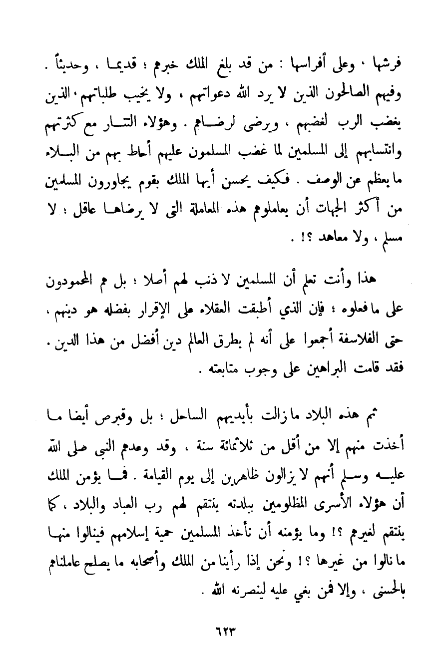 فُرُشِهَا وَعَلَى أَفْرَاسِهَا: مَنْ قَدْ بَلَغَ الْمَلِكُ خَبَرُهُمْ؛ قَدِيمًا وَحَدِيثًا. وَفِيهِمْ الصَّالِحُونَ الَّذِينَ لَا يَرُدُّ اللَّهُ دَعَوَاتِهِمْ وَلَا يُخَيِّبُ طَلَبَاتِهِمْ الَّذِينَ يَغْضَبُ الرَّبُّ لِغَضَبِهِمْ وَيَرْضَى لِرِضَاهُمْ. وَهَؤُلَاءِ التَّتَارُ مَعَ كَثْرَتِهِمْ وَانْتِسَابِهِمْ إلَى الْمُسْلِمِينَ لَمَّا غَضِبَ الْمُسْلِمُونَ عَلَيْهِمْ أَحَاطَ بِهِمْ مِنْ الْبَلَاءِ مَا يَعْظُمُ عَنْ الْوَصْفِ. فَكَيْفَ يَحْسُنُ أَيُّهَا الْمَلِكُ بِقَوْمِ يُجَاوِرُونَ الْمُسْلِمِينَ مِنْ أَكْثَرِ الْجِهَاتِ أَنْ يُعَامِلُوهُمْ هَذِهِ الْمُعَامَلَةَ الَّتِي لَا يَرْضَاهَا عَاقِلٌ؛ لَا مُسْلِمٌ وَلَا مُعَاهَدٌ. هَذَا وَأَنْتَ تَعْلَمُ أَنَّ الْمُسْلِمِينَ لَا ذَنْبَ لَهُمْ أَصْلًا؛ بَلْ هُمْ الْمَحْمُودُونَ عَلَى مَا فَعَلُوهُ؛ فَإِنَّ الَّذِي أَطْبَقَتْ الْعُقَلَاءُ عَلَى الْإِقْرَارِ بِفَضْلِهِ هُوَ دِينُهُمْ حَتَّى الْفَلَاسِفَةُ أَجْمَعُوا عَلَى أَنَّهُ لَمْ يَطْرُقْ الْعَالَمَ دِينٌ أَفْضَلُ مِنْ هَذَا الدِّينِ. فَقَدْ قَامَتْ الْبَرَاهِينُ عَلَى وُجُوبِ مُتَابَعَتِهِ. ثُمَّ هَذِهِ الْبِلَادُ مَا زَالَتْ بِأَيْدِيهِمْ السَّاحِلُ؛ بَلْ وَقُبْرُصُ أَيْضًا مَا أُخِذَتْ مِنْهُمْ إلَّا مِنْ أَقَلِّ مِنْ ثَلَاثمِائَةِ سَنَةٍ وَقَدْ وَعَدَهُمْ النَّبِيُّ صَلَّى اللَّهُ عَلَيْهِ وَسَلَّمَ أَنَّهُمْ لَا يَزَالُونَ ظَاهِرِينَ إلَى يَوْمِ الْقِيَامَةِ. فَمَا يُؤْمِنُ الْمَلِكُ أَنَّ هَؤُلَاءِ الْأَسْرَى الْمَظْلُومِينَ بِبَلْدَتِهِ يَنْتَقِمُ لَهُمْ رَبُّ الْعِبَادِ وَالْبِلَادِ كَمَا يَنْتَقِمُ لِغَيْرِهِمْ وَمَا يُؤَمِّنُهُ أَنْ تَأْخُذَ الْمُسْلِمِينَ حَمِيَّةُ إسْلَامِهِمْ فَيَنَالُوا مِنْهَا مَا نَالُوا مِنْ غَيْرِهَا وَنَحْنُ إذَا رَأَيْنَا مِنْ الْمَلِكِ وَأَصْحَابِهِ مَا يَصْلُحُ عَامَلْنَاهُمْ بِالْحُسْنَى وَإِلَّا فَمَنْ بُغِيَ عَلَيْهِ لَيَنْصُرَنَّهُ اللَّهُ.