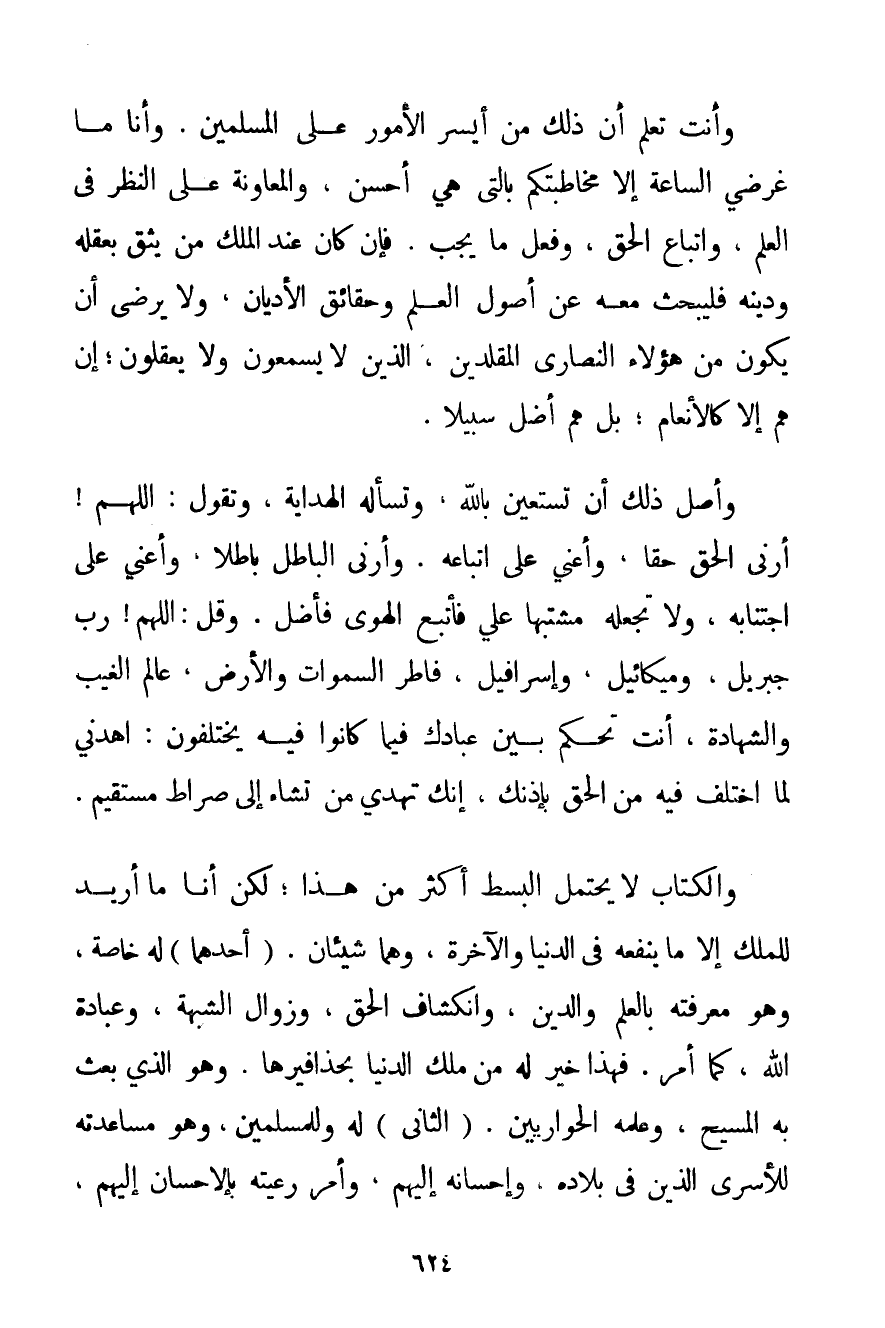 وَأَنْتَ تَعْلَمُ أَنَّ ذَلِكَ مِنْ أَيْسَرِ الْأُمُورِ عَلَى الْمُسْلِمِينَ. وَأَنَا مَا غَرَضِي السَّاعَةَ إلَّا مُخَاطَبَتُكُمْ بِاَلَّتِي هِيَ أَحْسَنُ وَالْمُعَاوَنَةُ عَلَى النَّظَرِ فِي الْعِلْمِ وَاتِّبَاعِ الْحَقِّ وَفِعْلِ مَا يَجِبُ. فَإِنْ كَانَ عِنْدَ الْمَلِكِ مَنْ يَثِقُ بِعَقْلِهِ وَدِينِهِ فَلْيَبْحَثْ مَعَهُ عَنْ أُصُولِ الْعِلْمِ وَحَقَائِقِ الْأَدْيَانِ وَلَا يَرْضَى أَنْ يَكُونَ مِنْ هَؤُلَاءِ النَّصَارَى الْمُقَلِّدِينَ الَّذِينَ لَا يَسْمَعُونَ وَلَا يَعْقِلُونَ؛ إنْ هُمْ إلَّا كَالْأَنْعَامِ؛ بَلْ هُمْ أَضَلُّ سَبِيلًا. وَأَصْلُ ذَلِكَ أَنْ تَسْتَعِينَ بِاَللَّهِ وَتَسْأَلَهُ الْهِدَايَةَ وَتَقُولَ: اللَّهُمَّ أَرِنِي الْحَقَّ حَقًّا وَأَعِنِّي عَلَى اتِّبَاعِهِ. وَأَرِنِي الْبَاطِلَ بَاطِلًا وَأَعِنِّي عَلَى اجْتِنَابِهِ وَلَا تَجْعَلْهُ مُشْتَبَهًا عَلَيَّ فَأَتَّبِعَ الْهَوَى فَأَضِلَّ. وَقُلْ اللَّهُمَّ رَبَّ جِبْرِيلَ وميكائيل وَإِسْرَافِيلَ فَاطِرَ السَّمَوَاتِ وَالْأَرْضِ عَالِمَ الْغَيْبِ وَالشَّهَادَةِ أَنْتَ تَحْكُمُ بَيْنَ عِبَادِك فِيمَا كَانُوا فِيهِ يَخْتَلِفُونَ: اهْدِنِي لِمَا اُخْتُلِفَ فِيهِ مِنْ الْحَقِّ بِإِذْنِك إنَّك تَهْدِي مَنْ تَشَاءُ إلَى صِرَاطٍ مُسْتَقِيمٍ. وَالْكِتَابُ لَا يَحْتَمِلُ الْبَسْطَ أَكْثَرَ مِنْ هَذَا؛ لَكِنَّ أَنَا مَا أُرِيدَ لِلْمَلِكِ إلَّا مَا يَنْفَعُهُ فِي الدُّنْيَا وَالْآخِرَةِ وَهُمَا شَيْئَانِ. (أَحَدُهُمَا لَهُ خَاصَّةً وَهُوَ مَعْرِفَتُهُ بِالْعِلْمِ وَالدِّينِ وَانْكِشَافِ الْحَقِّ وَزَوَالِ الشُّبْهَةِ وَعِبَادَةِ اللَّهِ كَمَا أَمَرَ. فَهَذَا خَيْرٌ لَهُ مِنْ مُلْكِ الدُّنْيَا بِحَذَافِيرِهَا. وَهُوَ الَّذِي بَعَثَ بِهِ الْمَسِيحَ وَعَلَّمَهُ الْحَوَارِيِّينَ. (الثَّانِي لَهُ وَلِلْمُسْلِمِينَ وَهُوَ مُسَاعَدَتُهُ لِلْأَسْرَى الَّذِينَ فِي بِلَادِهِ وَإِحْسَانُهُ إلَيْهِمْ وَأَمْرُ رَعِيَّتِهِ بِالْإِحْسَانِ إلَيْهِمْ