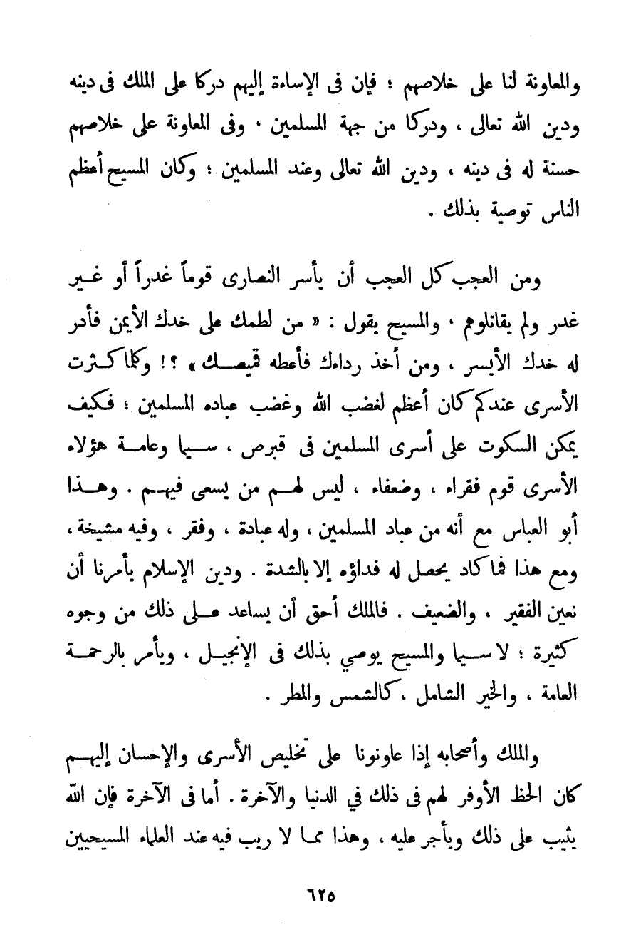وَالْمُعَاوَنَةُ لَنَا عَلَى خَلَاصِهِمْ؛ فَإِنَّ فِي الْإِسَاءَةِ إلَيْهِمْ دَرْكًا عَلَى الْمَلِكِ فِي دِينِهِ وَدِينِ اللَّهِ تَعَالَى وَدَرْكًا مِنْ جِهَةِ الْمُسْلِمِينَ وَفِي الْمُعَاوَنَةِ عَلَى خَلَاصِهِمْ حَسَنَةٌ لَهُ فِي دِينِهِ وَدِينِ اللَّهِ تَعَالَى وَعِنْدَ الْمُسْلِمِينَ؛ وَكَانَ الْمَسِيحُ أَعْظَمَ النَّاسِ تَوْصِيَةً بِذَلِكَ. وَمِنْ الْعَجَبِ كُلَّ الْعَجَبِ أَنْ يَأْسِرَ النَّصَارَى قَوْمًا غَدْرًا أَوْ غَيْرَ غَدْرٍ وَلَمْ يُقَاتِلُوهُمْ وَالْمَسِيحُ يَقُولُ: " مَنْ لَطَمَك عَلَى خَدِّك الْأَيْمَنِ فَأَدِرْ لَهُ خَدَّك الْأَيْسَرَ وَمَنْ أَخَذَ رِدَاءَك فَأَعْطِهِ قَمِيصَك " وَكُلَّمَا كَثُرَتْ الْأَسْرَى عِنْدَكُمْ كَانَ أَعْظَمَ لِغَضَبِ اللَّهِ وَغَضَبِ عِبَادِهِ الْمُسْلِمِينَ؛ فَكَيْفَ يُمْكِنُ السُّكُوتُ عَلَى أَسْرَى الْمُسْلِمِينَ فِي قُبْرُصَ سِيَّمَا وَعَامَّةُ هَؤُلَاءِ الْأَسْرَى قَوْمٌ فُقَرَاءُ وَضُعَفَاءُ لَيْسَ لَهُمْ مَنْ يَسْعَى فِيهِمْ. وَهَذَا أَبُو الْعَبَّاسِ مَعَ أَنَّهُ مِنْ عِبَادِ الْمُسْلِمِينَ وَلَهُ عِبَادَةٌ وَفَقْرٌ وَفِيهِ مَشْيَخَةٌ وَمَعَ هَذَا فَمَا كَادَ يَحْصُلُ لَهُ فِدَاؤُهُ إلَّا بِالشِّدَّةِ. وَدِينُ الْإِسْلَامِ يَأْمُرُنَا أَنْ نُعِينَ الْفَقِيرَ وَالضَّعِيفَ. فَالْمَلِكُ أَحَقُّ أَنْ يُسَاعِدَ عَلَى ذَلِكَ مِنْ وُجُوهٍ كَثِيرَةٍ؛ لَا سِيَّمَا وَالْمَسِيحُ يُوصِي بِذَلِكَ فِي الْإِنْجِيلِ وَيَأْمُرُ بِالرَّحْمَةِ الْعَامَّةِ وَالْخَيْرِ الشَّامِلِ كَالشَّمْسِ وَالْمَطَرِ. وَالْمَلِكُ وَأَصْحَابُهُ إذَا عَاوَنُونَا عَلَى تَخْلِيصِ الْأَسْرَى وَالْإِحْسَانِ إلَيْهِمْ كَانَ الْحَظُّ الْأَوْفَرُ لَهُمْ فِي ذَلِكَ فِي الدُّنْيَا وَالْآخِرَةِ. أَمَّا فِي الْآخِرَةِ فَإِنَّ اللَّهَ يُثِيبُ عَلَى ذَلِكَ وَيَأْجُرُ عَلَيْهِ وَهَذَا مِمَّا لَا رَيْبَ فِيهِ عِنْدَ الْعُلَمَاءِ الْمَسِيحِيِّينَ